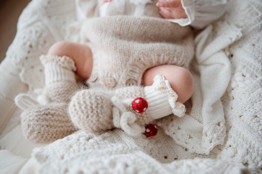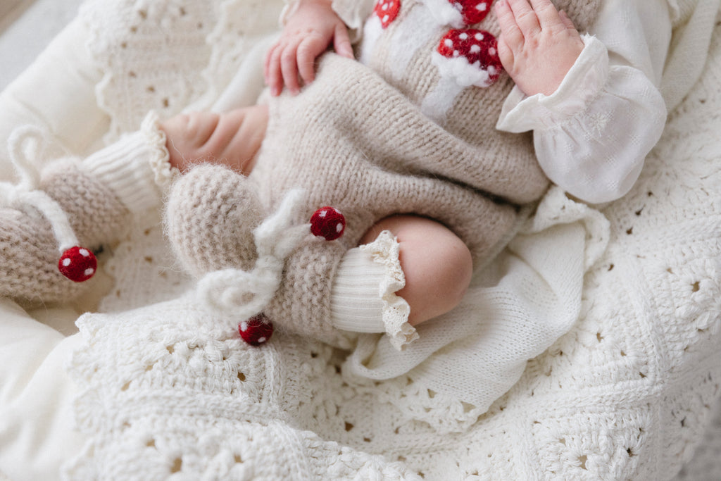 蘑菇造型嬰兒針織襪,為小寶貝帶來溫暖又可愛的冬日呵護。🍄蘑菇綁帶能牢固固定鞋身,高彈性襪口貼合腿部,不易脫落。採用最柔軟的 Baby Alpaca 小羊駝毛線 手工編織而成,觸感輕盈細緻,保暖度極佳。讓小寶貝的雙腳在寒冷季節中始終保持溫暖與舒適。🧶自穿可愛時分或贈送親朋好友的最佳禮物。無論是冬日漫步、全家福,還是只是想讓一份魔法在整個季節伴您左右,都是您和寶貝最理想之選。