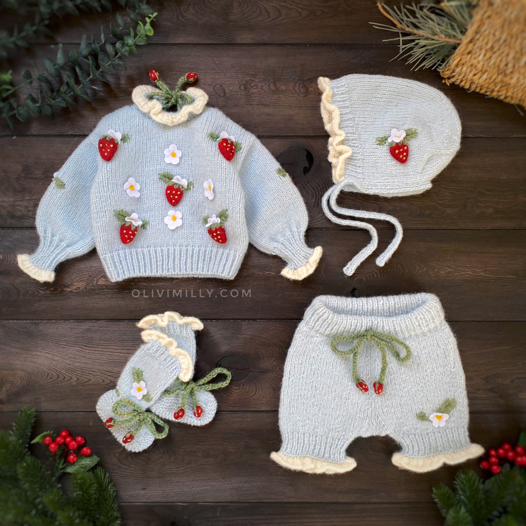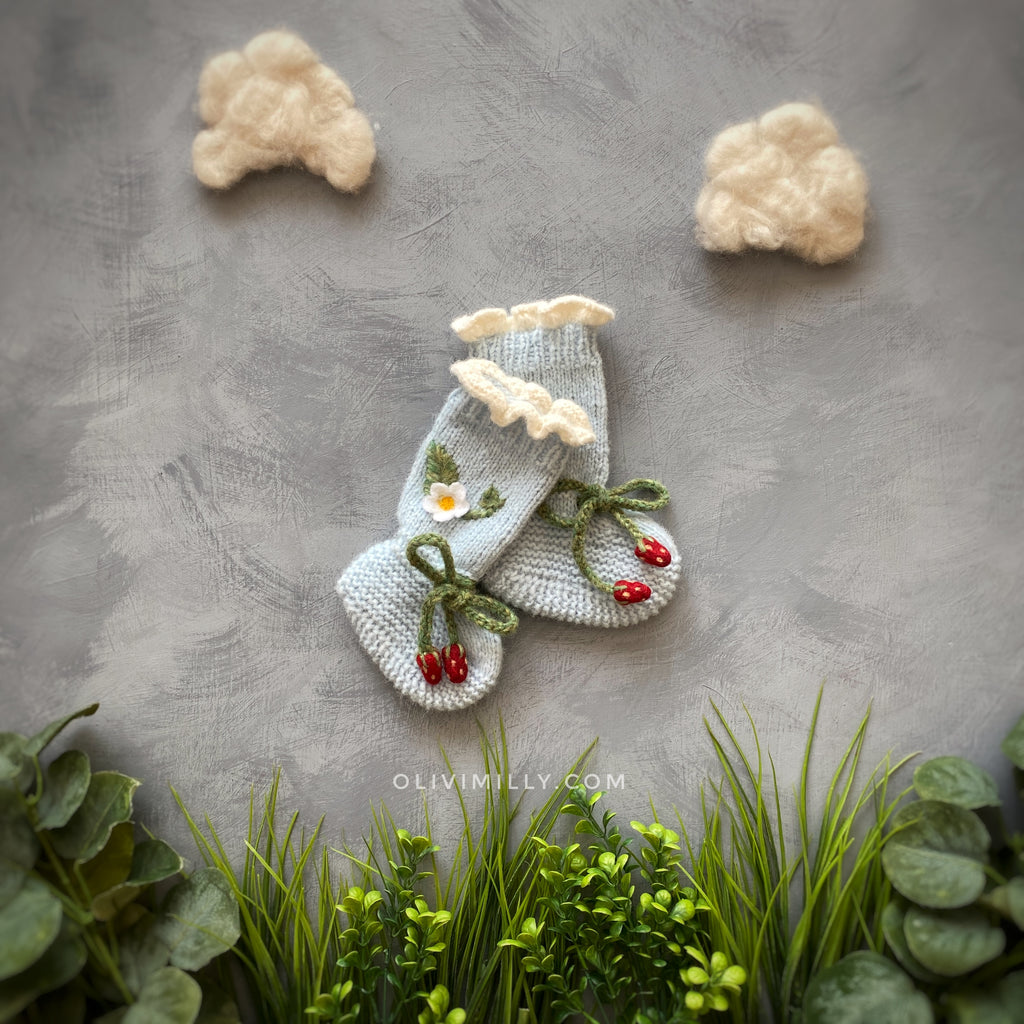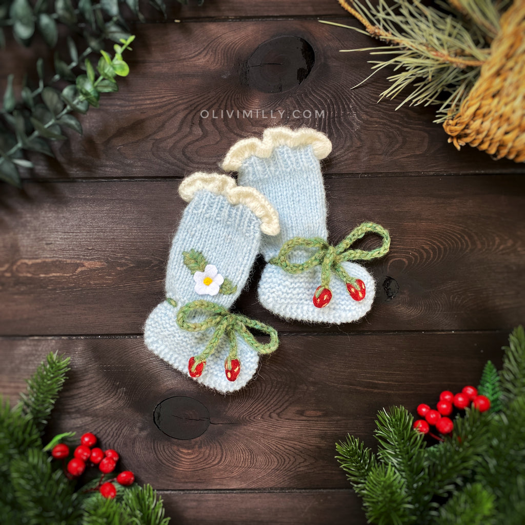 OliviMilly, Strawberries Booties | Blue 草莓嬰兒針織造型襪 柔和藍 0-2y