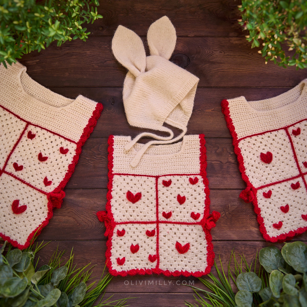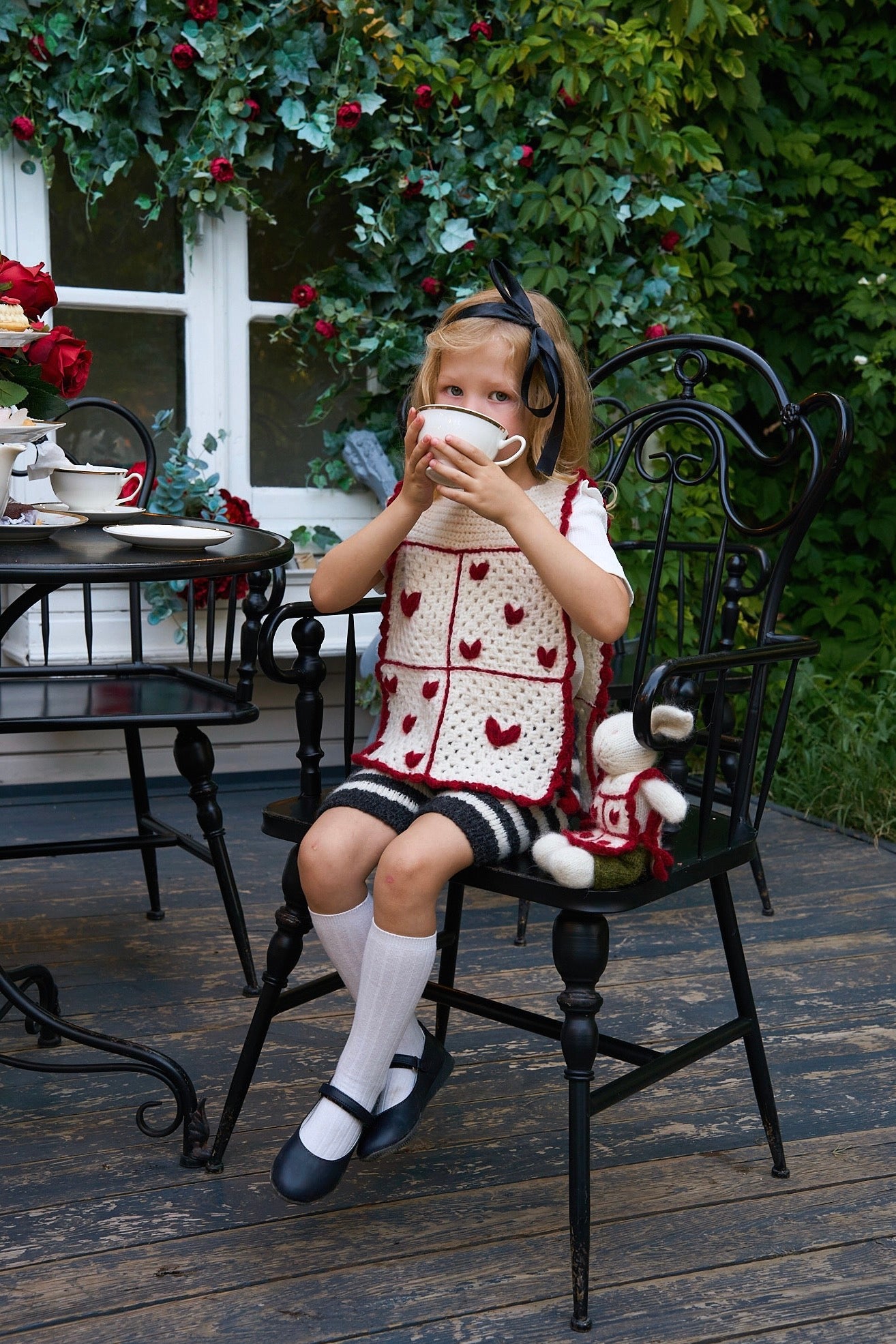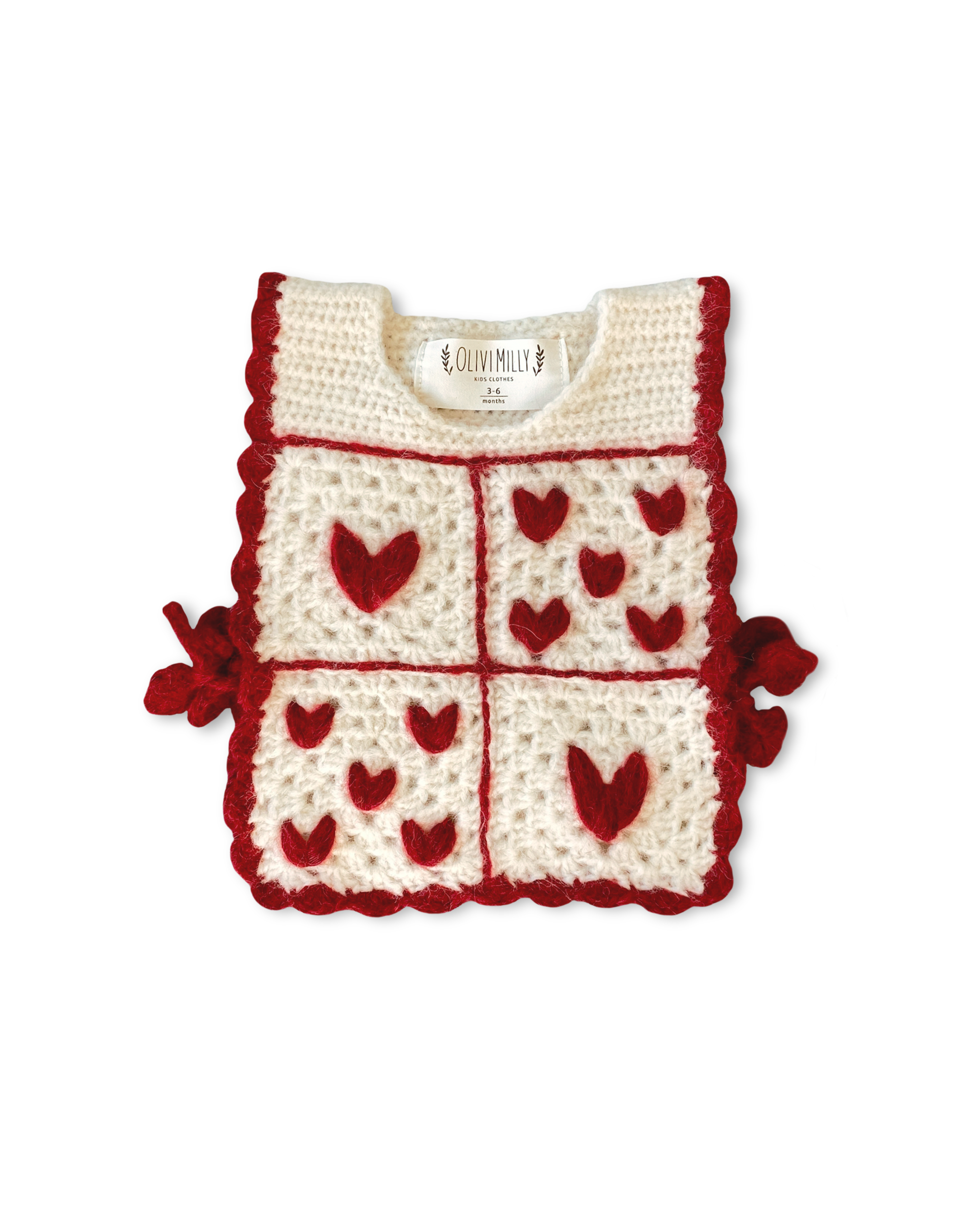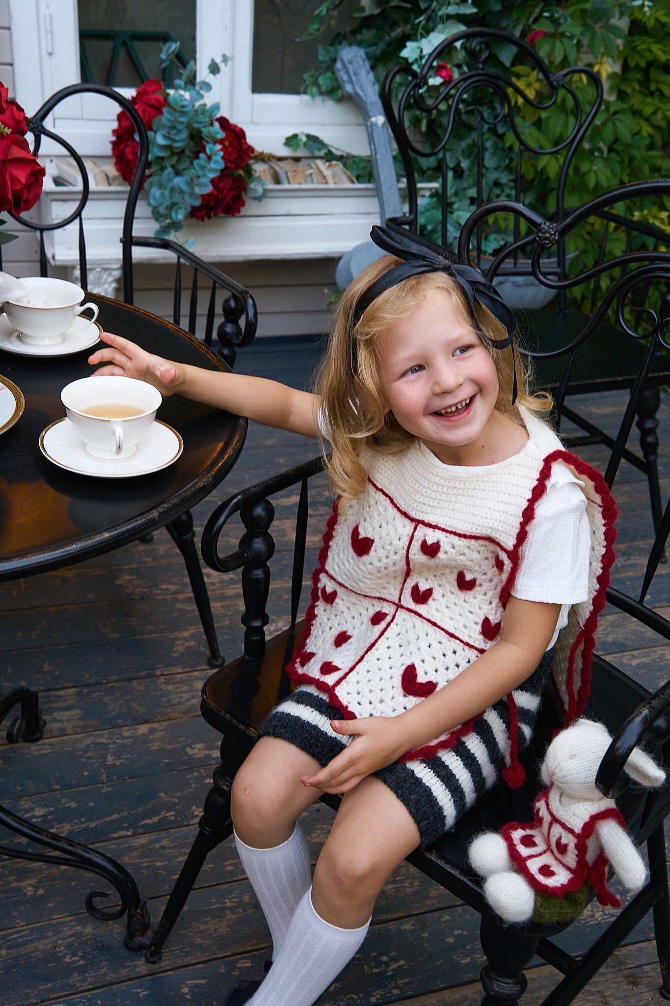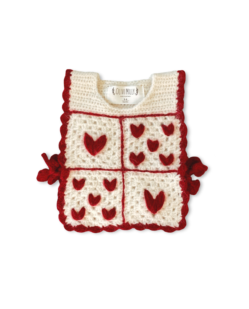 正面飾有可愛的愛心圖案和側綁蝴蝶結設計,為整件衣服增添了一絲俏皮與古靈精怪的氣質。 這款連身衣由工匠以滿滿的愛與細膩手工編織而成,是陪伴孩子一起踏上奇幻夢境冒險旅程之選。🌸