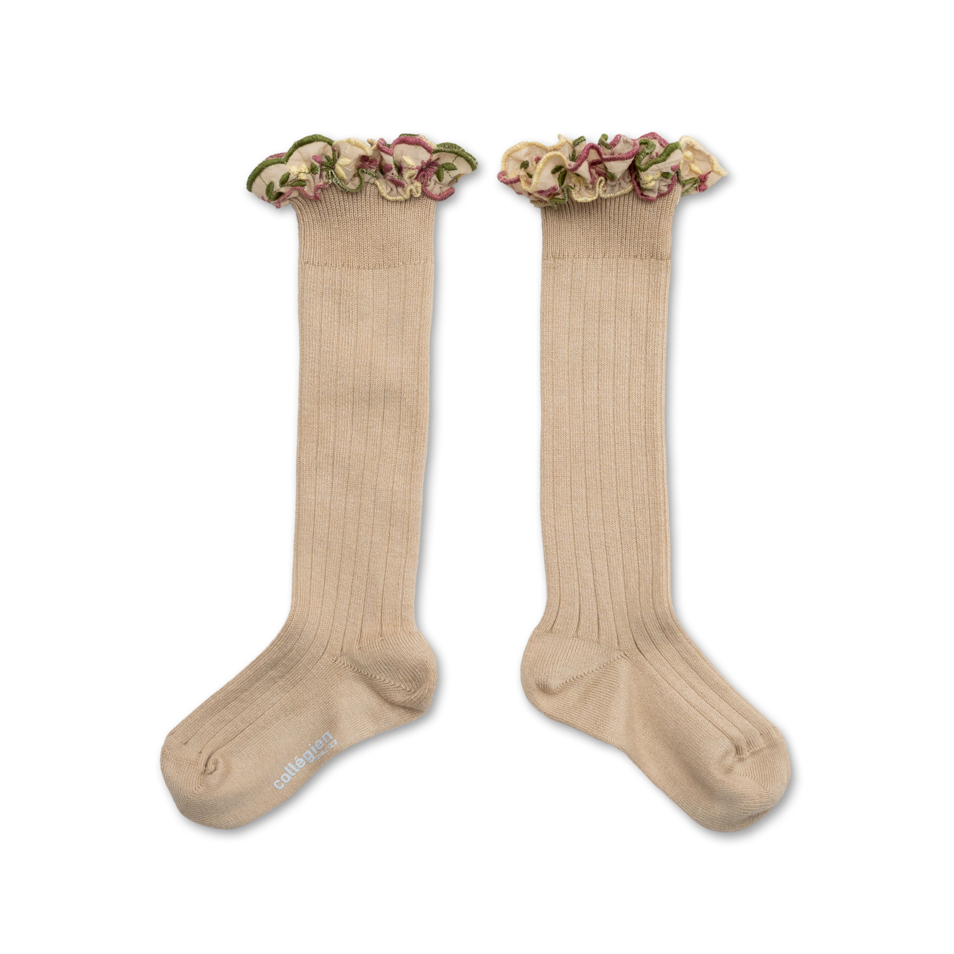 Eglantine - Chaussettes hautes avec volant brodé fleurs