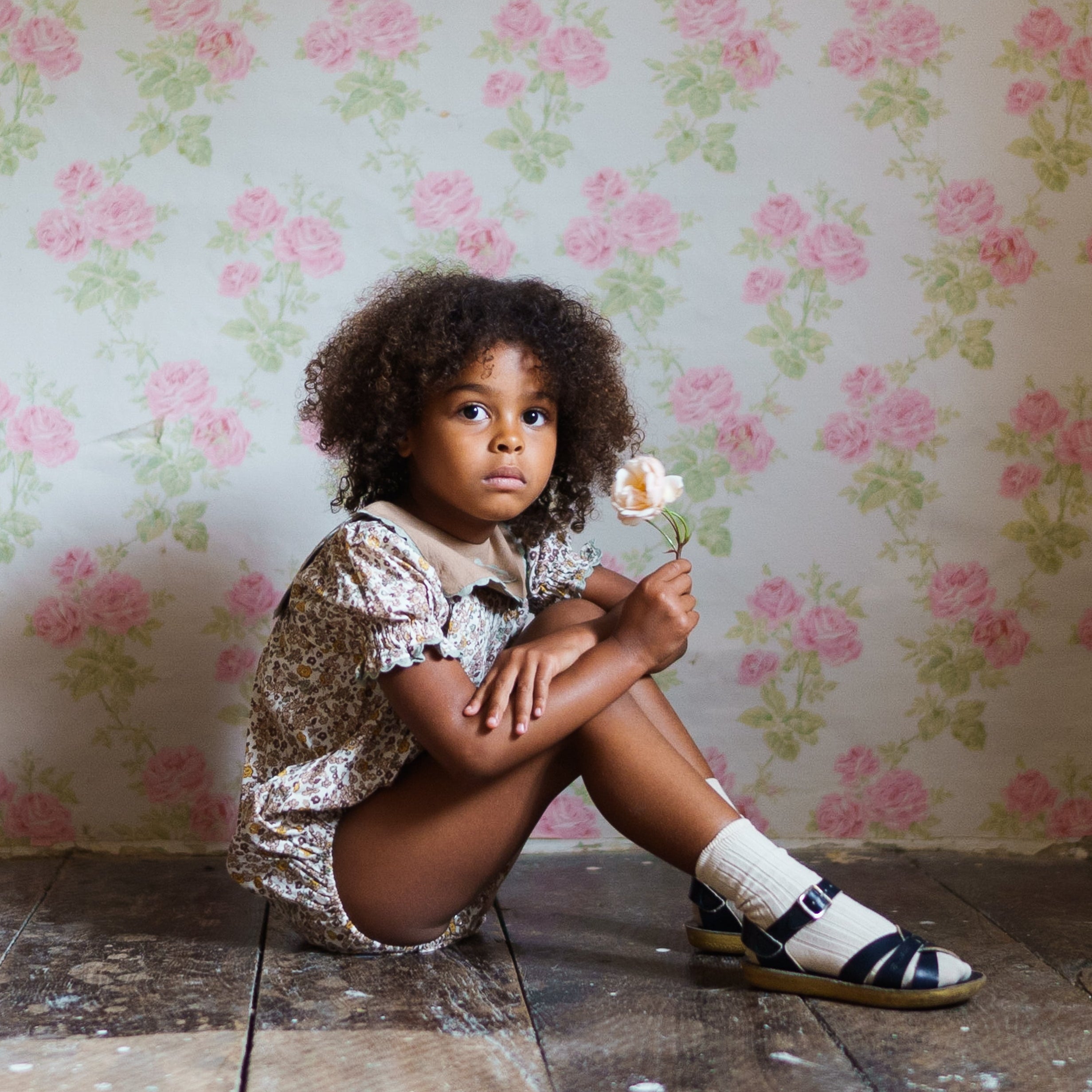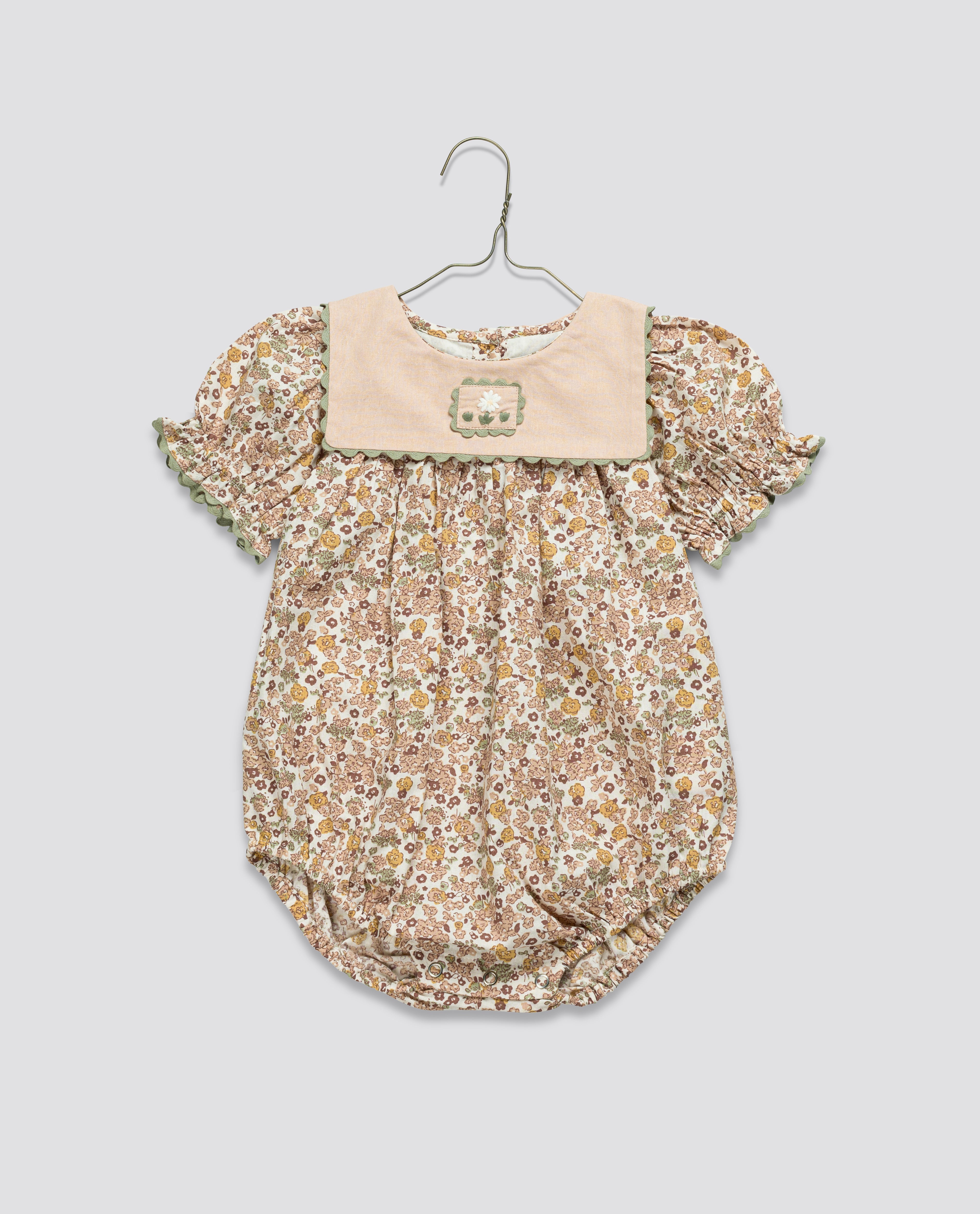 這款連身褲採用我們標誌性的洋蓍草印花,在花語中,西洋蓍草象徵著勇氣、治癒與保護。這款連身褲還帶有水手領,飾以波浪花邊和刺繡細節。簡約可愛,泡泡袖設計,是夏季的理想之選。我們貼心地在褲襠設計了按扣開口,方便穿脫。
