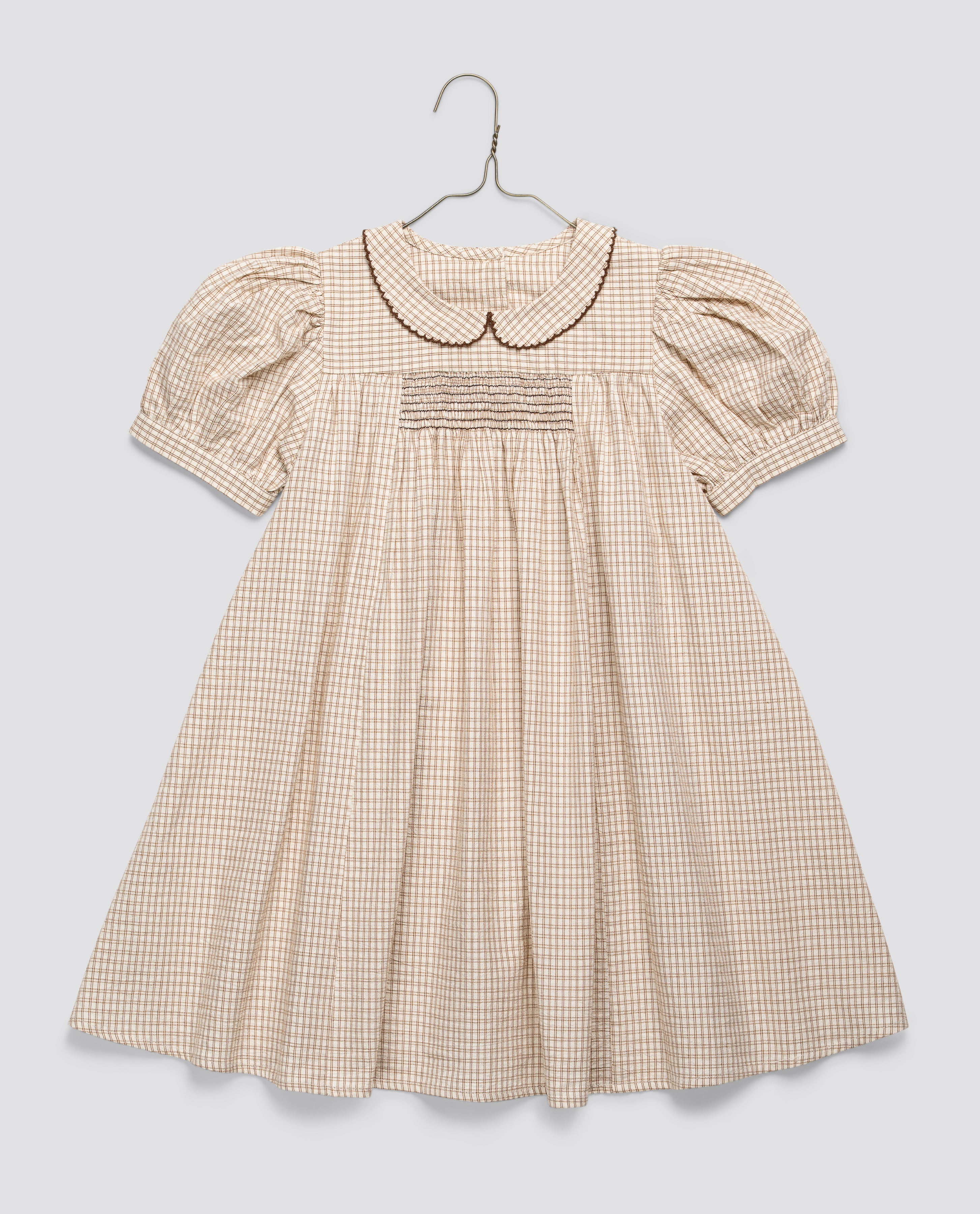 這款美麗的復古風連身裙採用我們精美的自然格紋棉布製成。它擁有蓬鬆的短袖,袖口飾有精緻的小翻邊,彼得潘領邊緣點綴著漂亮的刺繡。洋裝背面有鈕扣,裙擺蓬鬆且帶有褶襉。