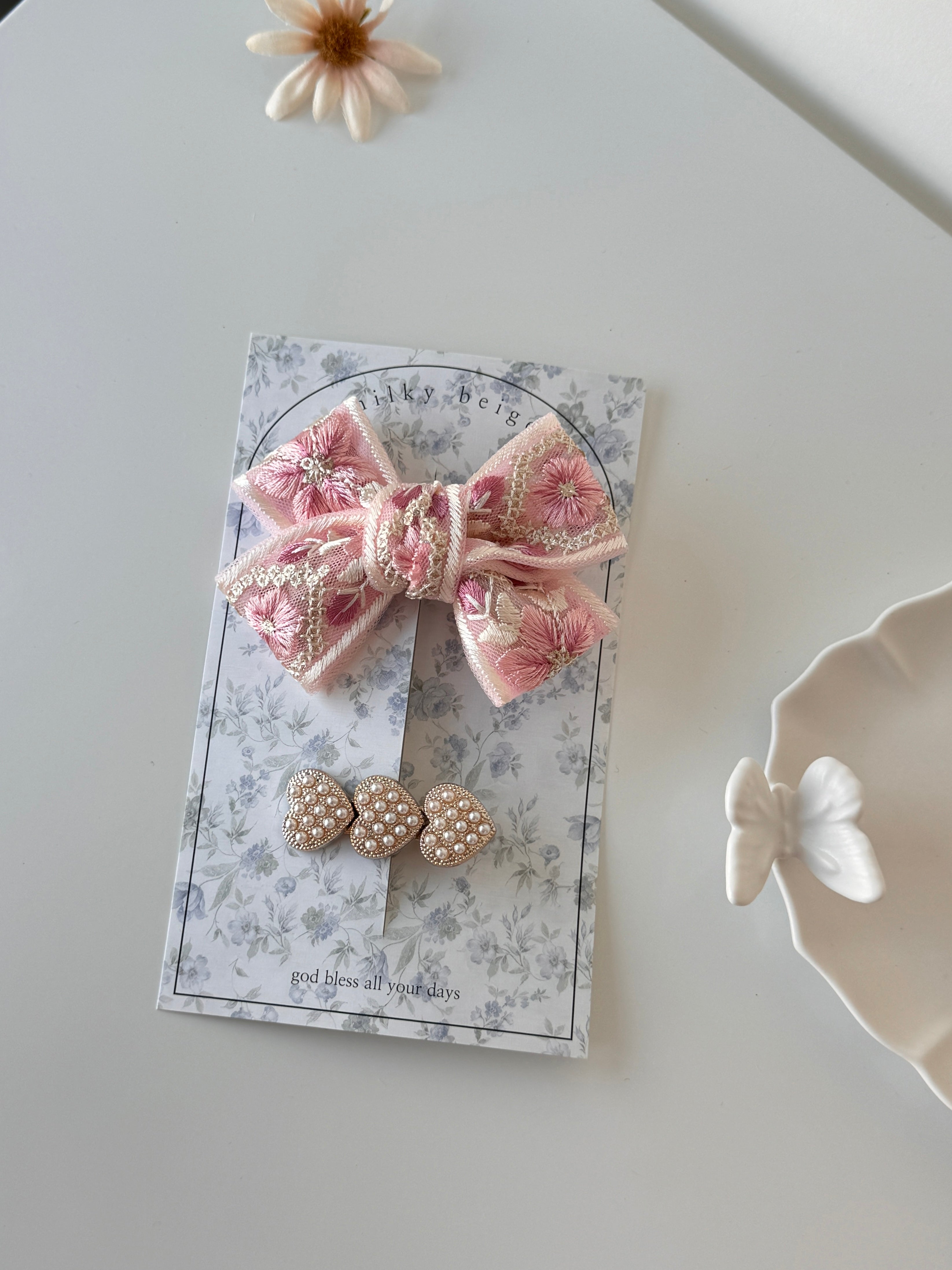 一套您和寶貝一定會喜歡的手工印度刺繡髮夾! 皆附有防滑設計。以清新的淡粉色和雅典白為基底,點綴花朵刺繡,增添一絲光澤感,散發柔美優雅的氣質。蝴蝶造型大方甜美。長方形款式簡約典雅。柔白花瓣搭配金色花蕊,為整體造型增添一抹清新與甜美。適合夾在瀏海或髮側,增添甜美氣息。或是別在洋裝、針織衫,還是隨性點綴在包包上,都能展現甜美俏皮的魅力。