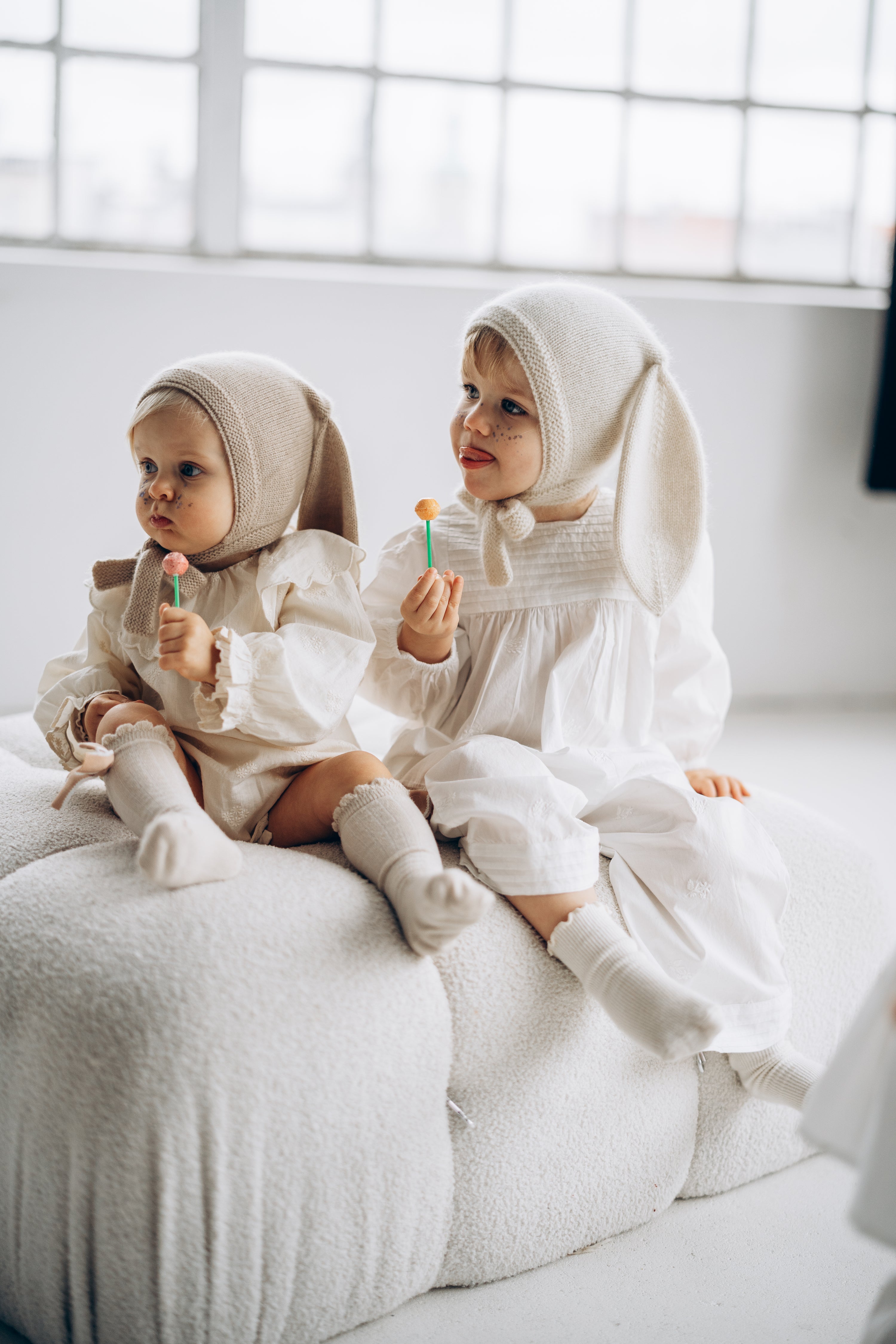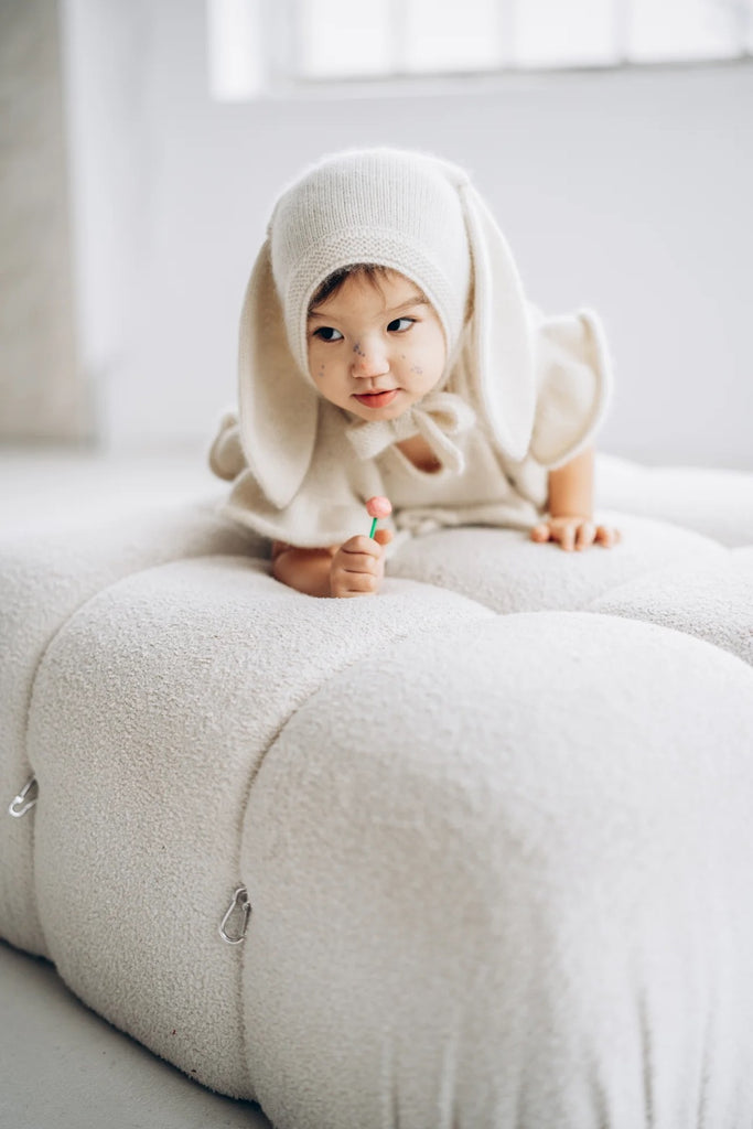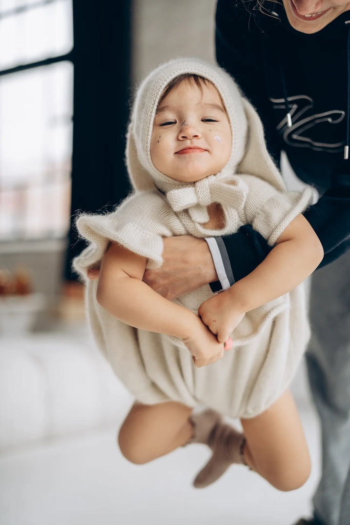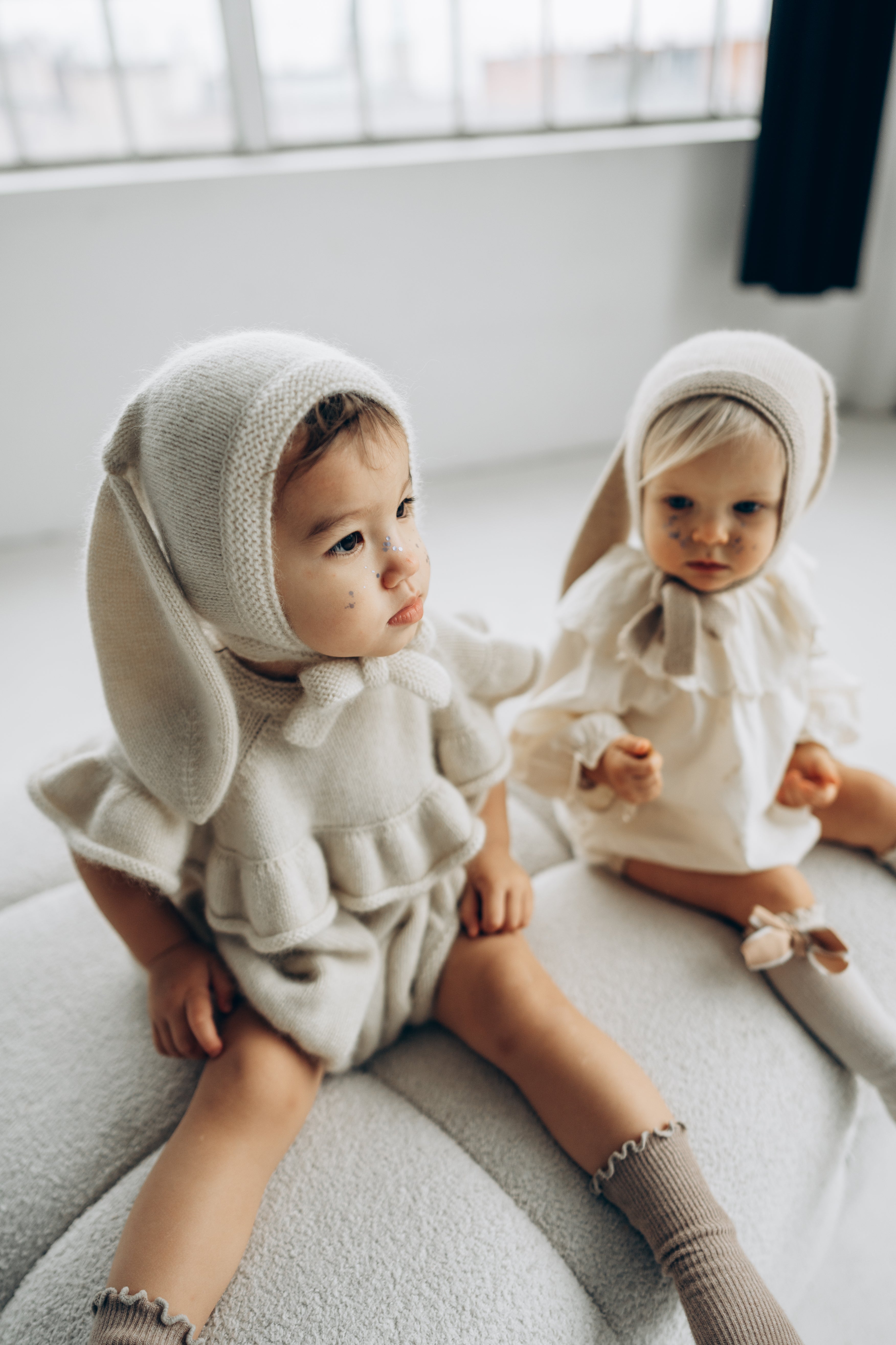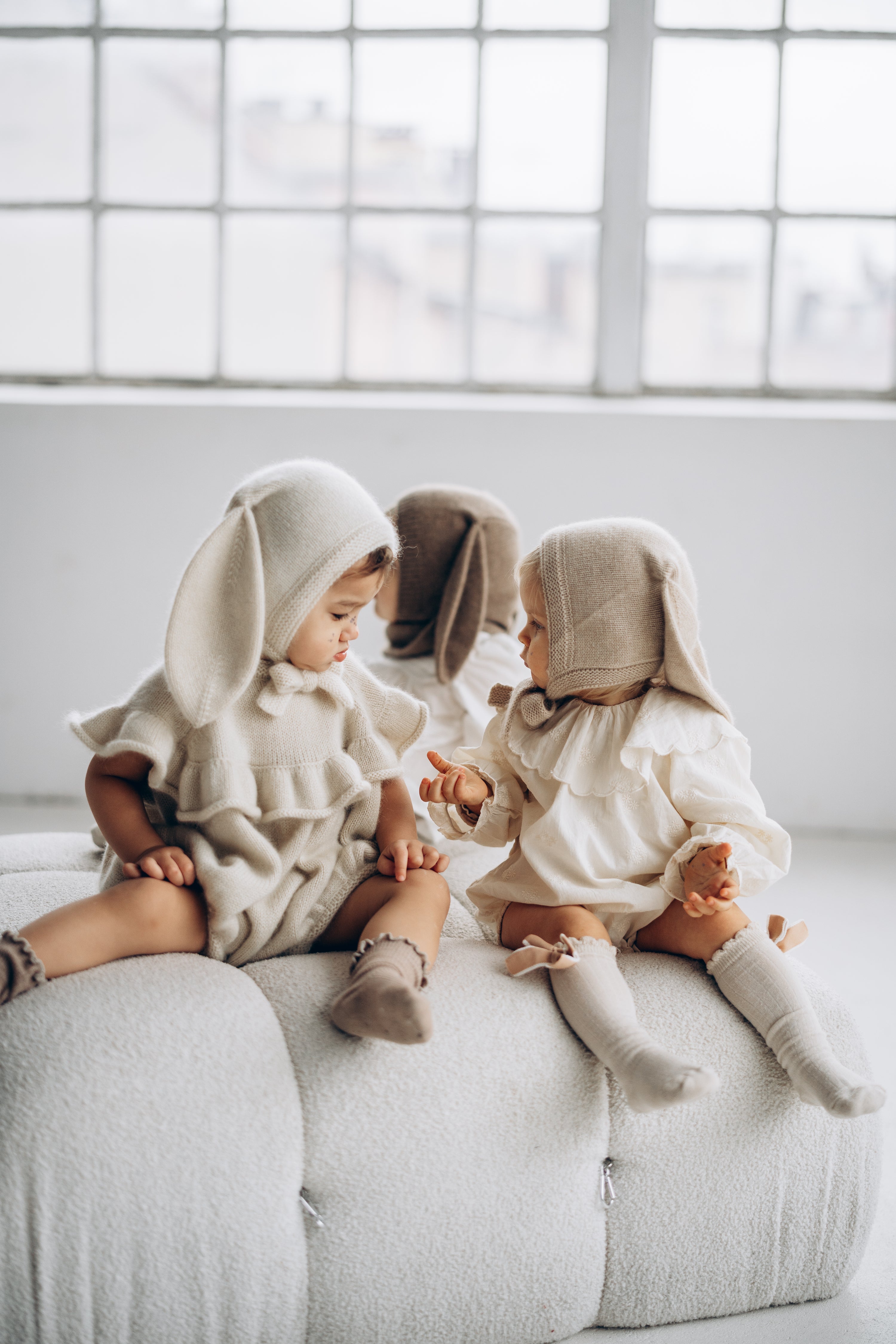 Baby Cashmere Hat with Long Bunny Ears. This adorable baby hat is made from 100% cashmere knit, offering unparalleled softness and warmth for your little one. Featuring a tie closure under the chin, it provides a secure fit while perfectly covering the ears, neck, and forehead to keep your child cozy and protected. With its extra-long bunny ears, it adds a playful charm, giving your baby the irresistible look of a tiny bunny. Lightweight, warm, and delightfully cute, this hat is the perfect choice for both comfort and style.