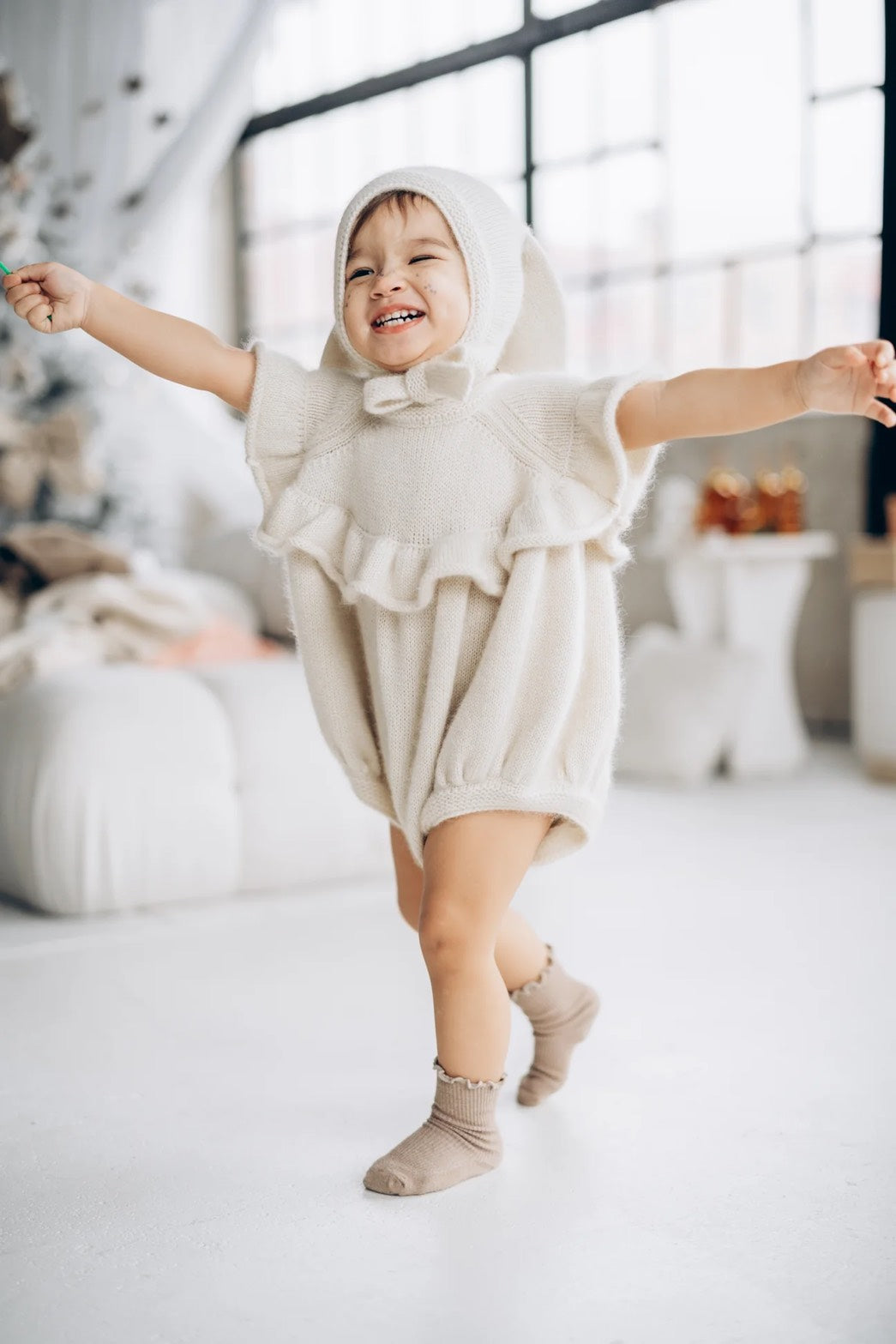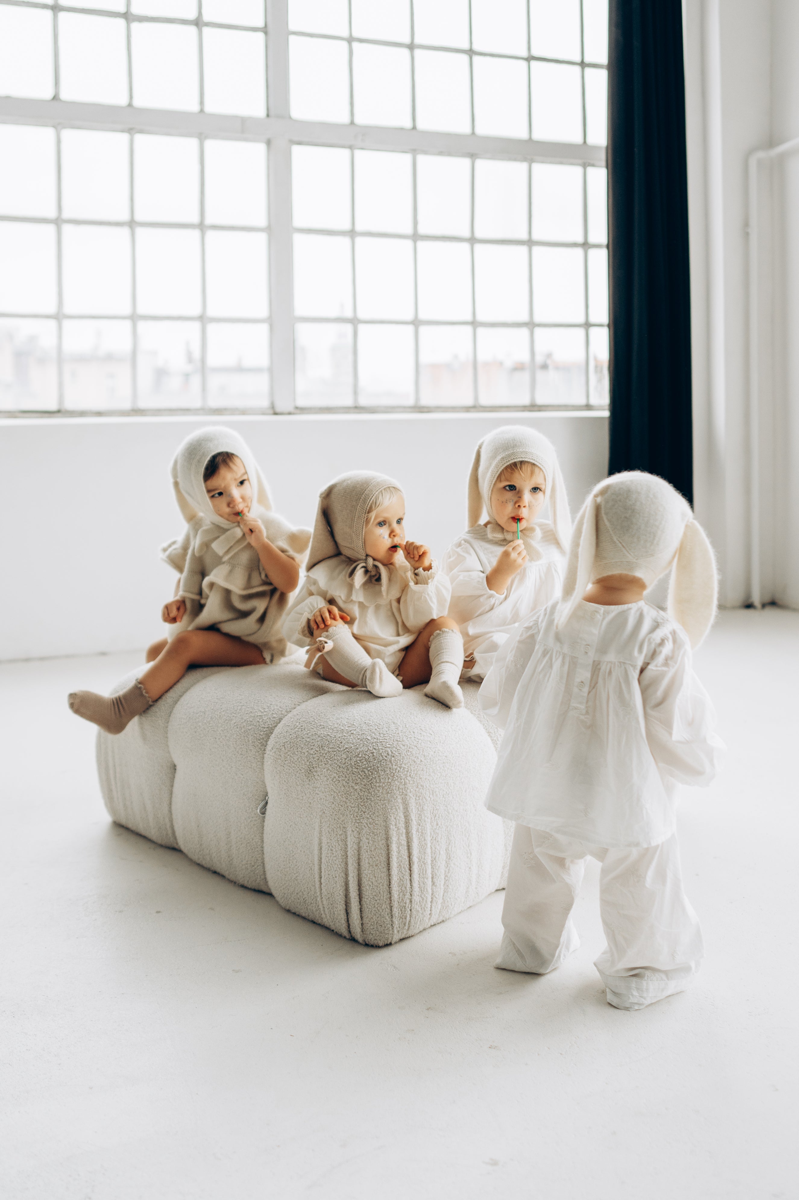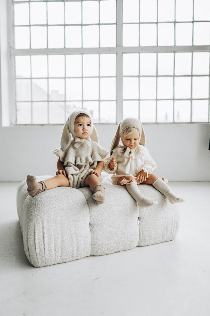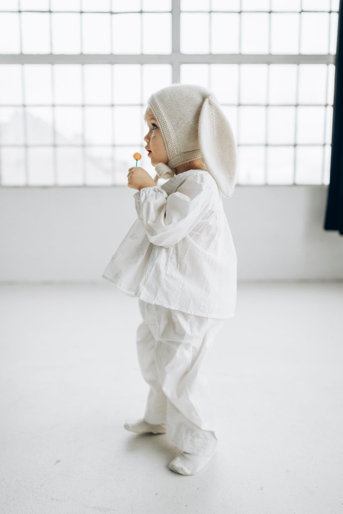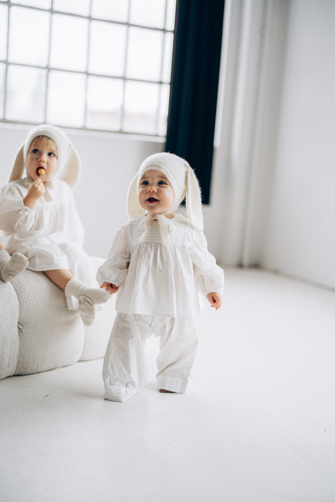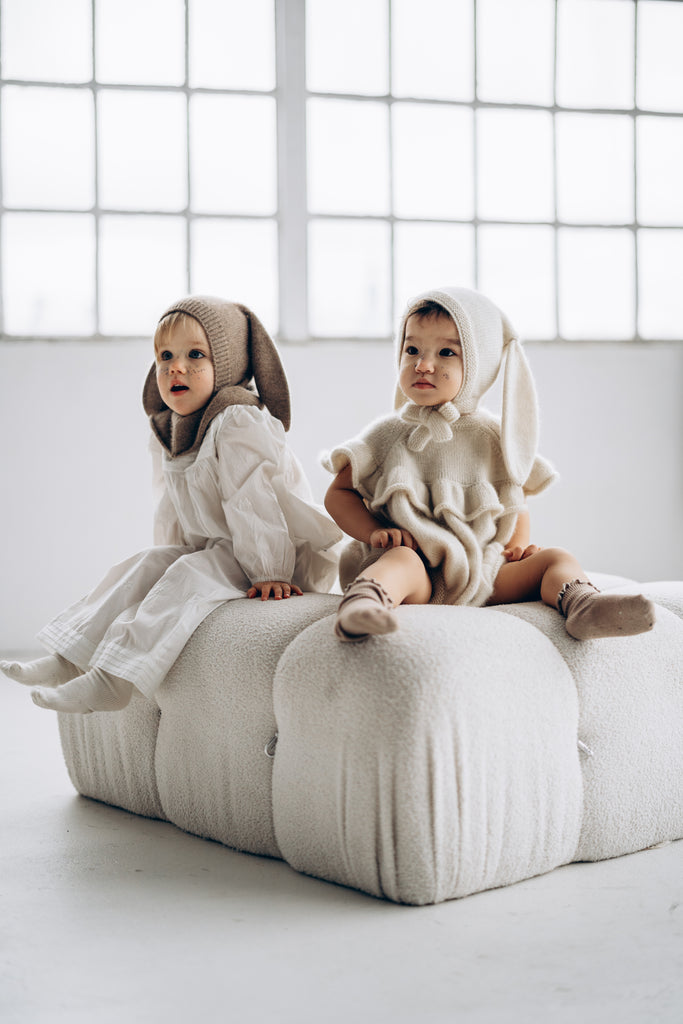 Baby Cashmere Hat with Long Bunny Ears. This adorable baby hat is made from 100% cashmere knit, offering unparalleled softness and warmth for your little one. Featuring a tie closure under the chin, it provides a secure fit while perfectly covering the ears, neck, and forehead to keep your child cozy and protected. With its extra-long bunny ears, it adds a playful charm, giving your baby the irresistible look of a tiny bunny. Lightweight, warm, and delightfully cute, this hat is the perfect choice for both comfort and style.