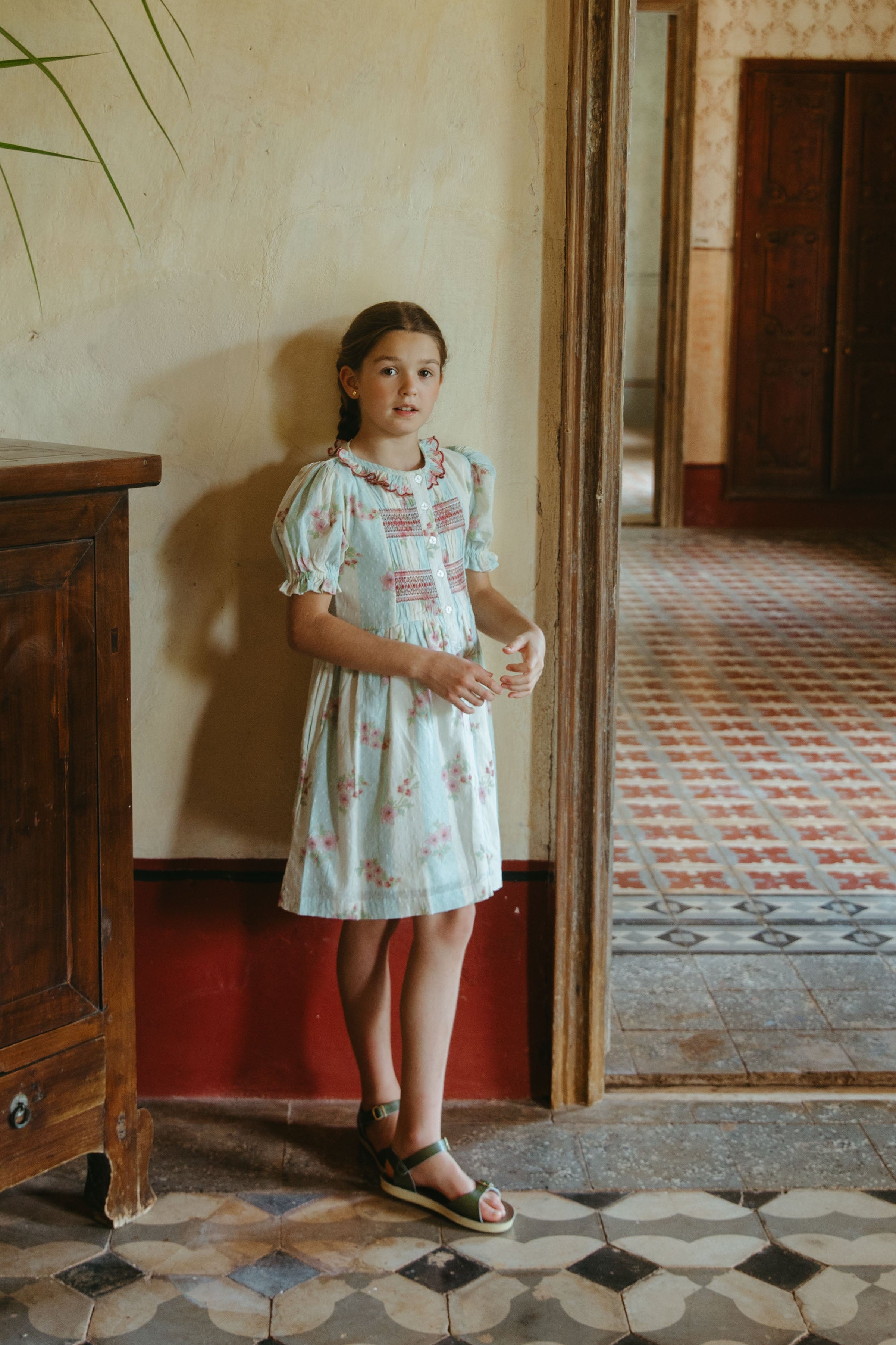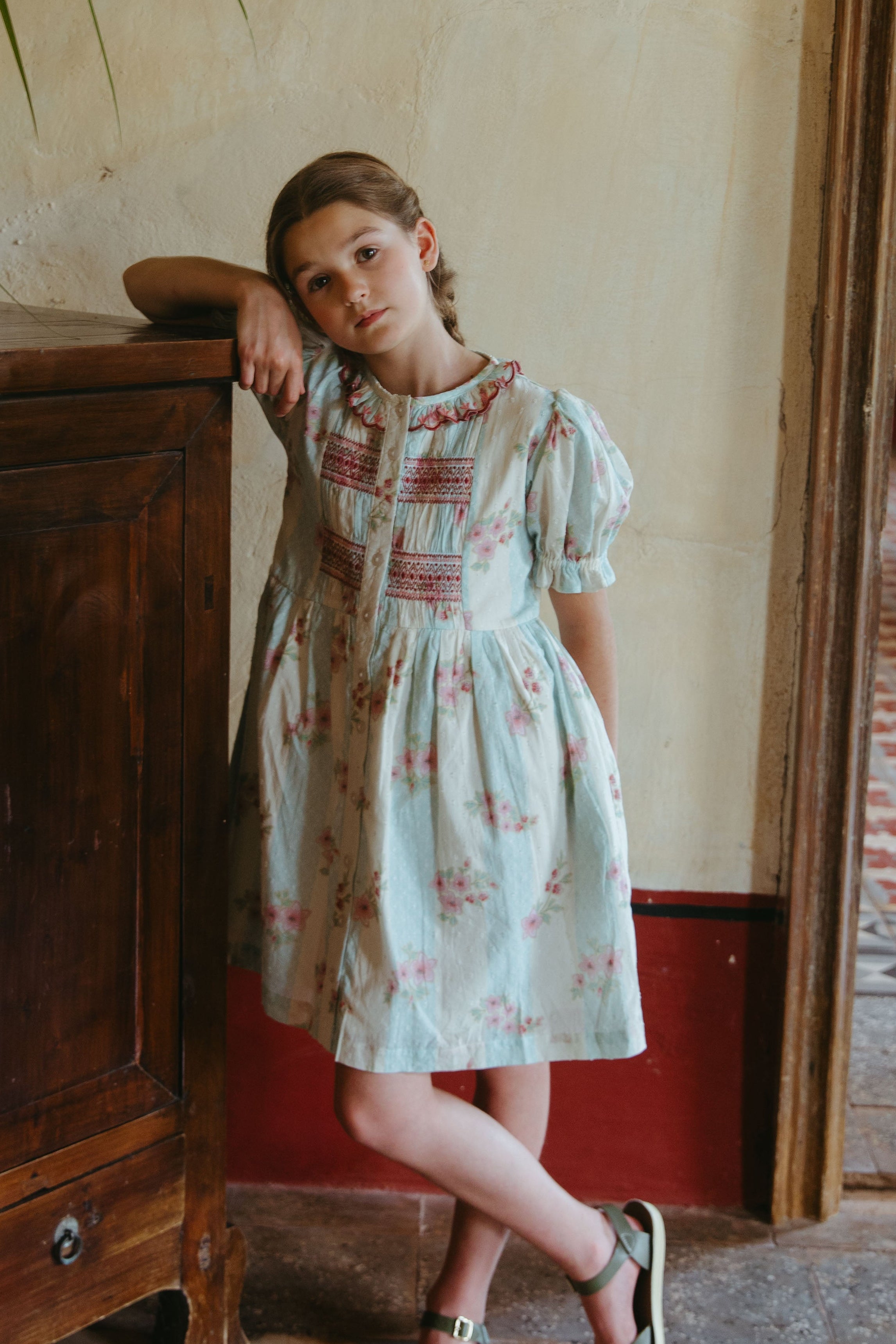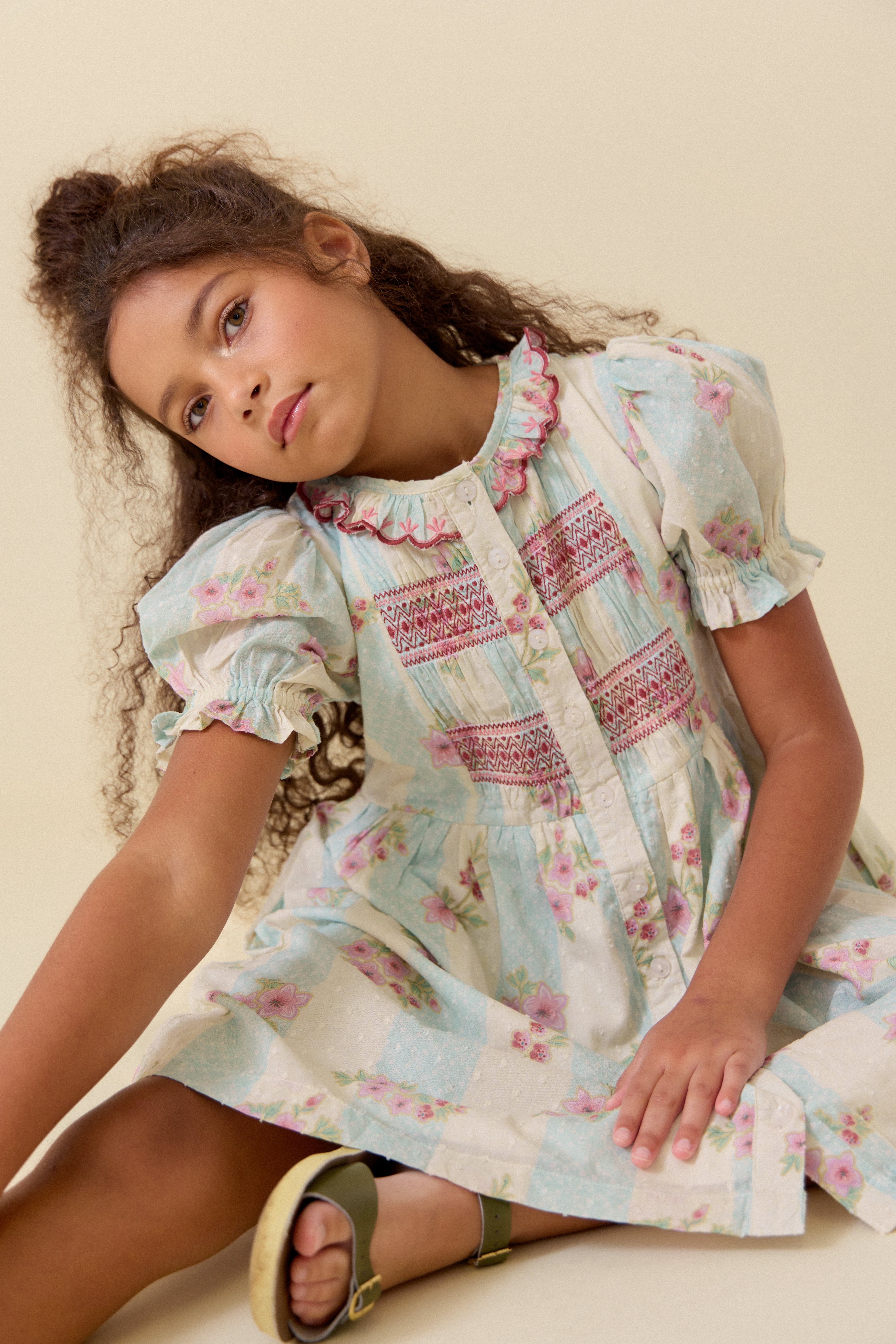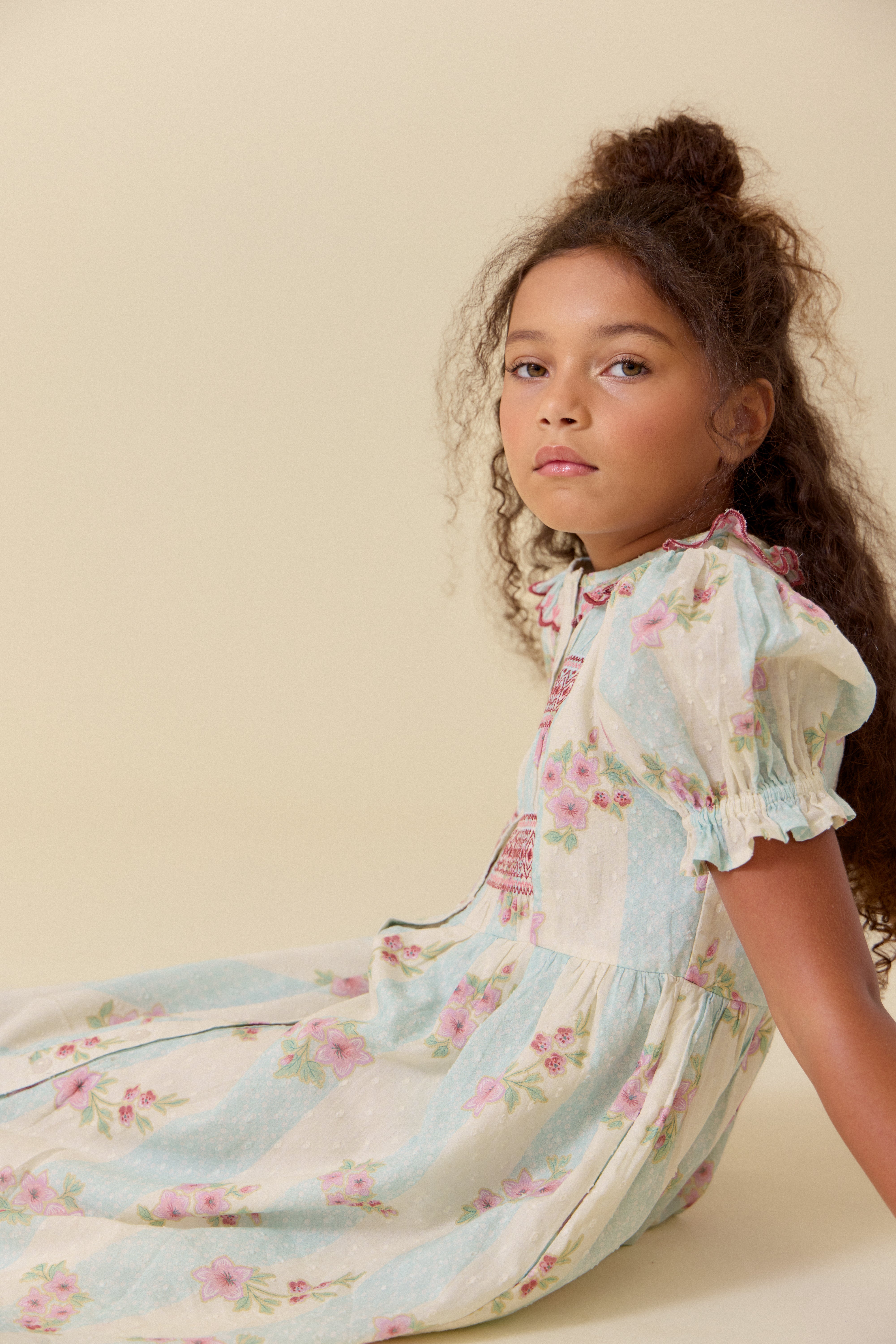 裙擺長度及膝,打造輕鬆優雅的輪廓。珍珠母貝鈕扣門襟兩側飾以褶襉,更添一份復古韻味。無論是春日慶典,還是日常的溫馨時刻,Ivy都能讓妳和寶貝倍感特別。