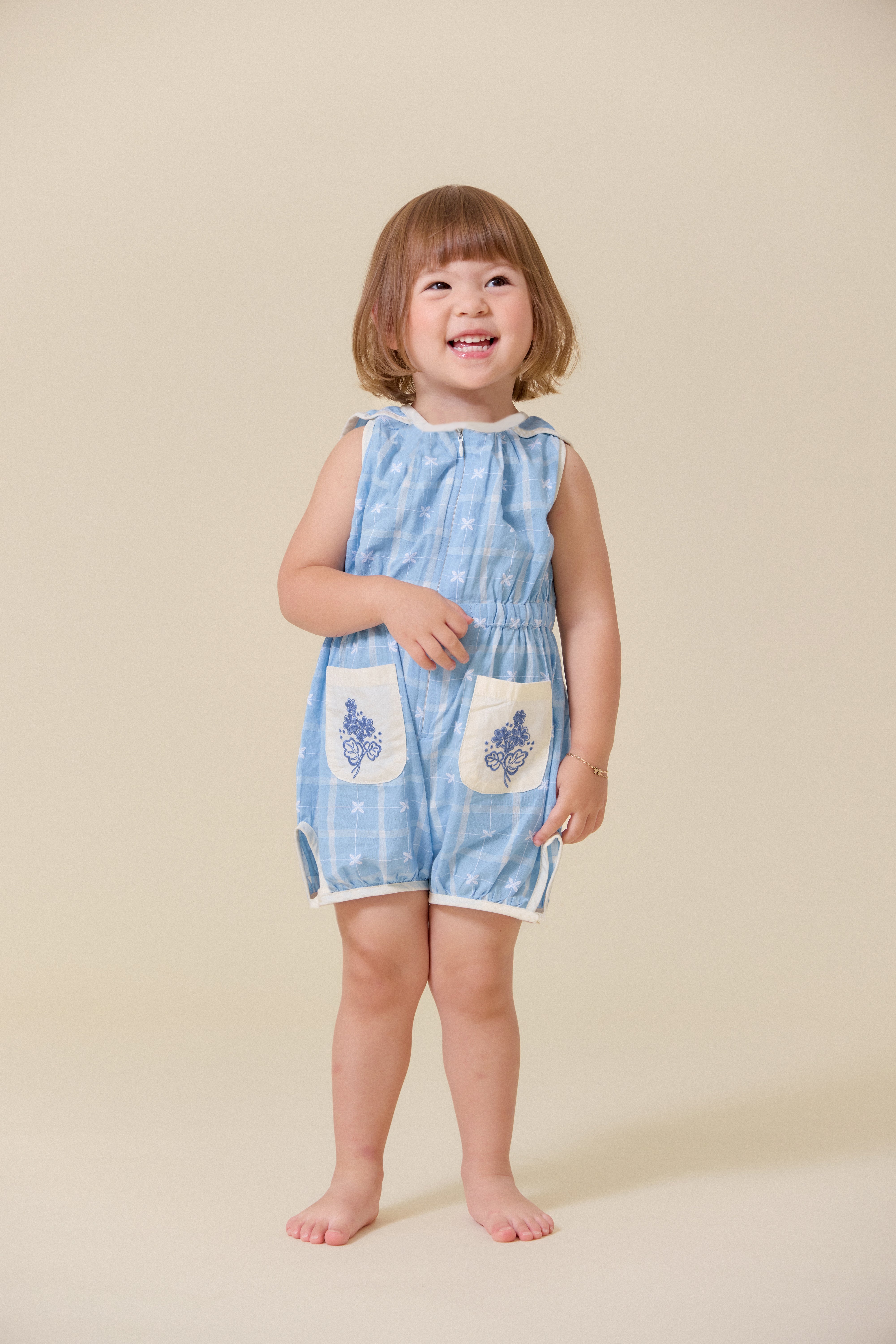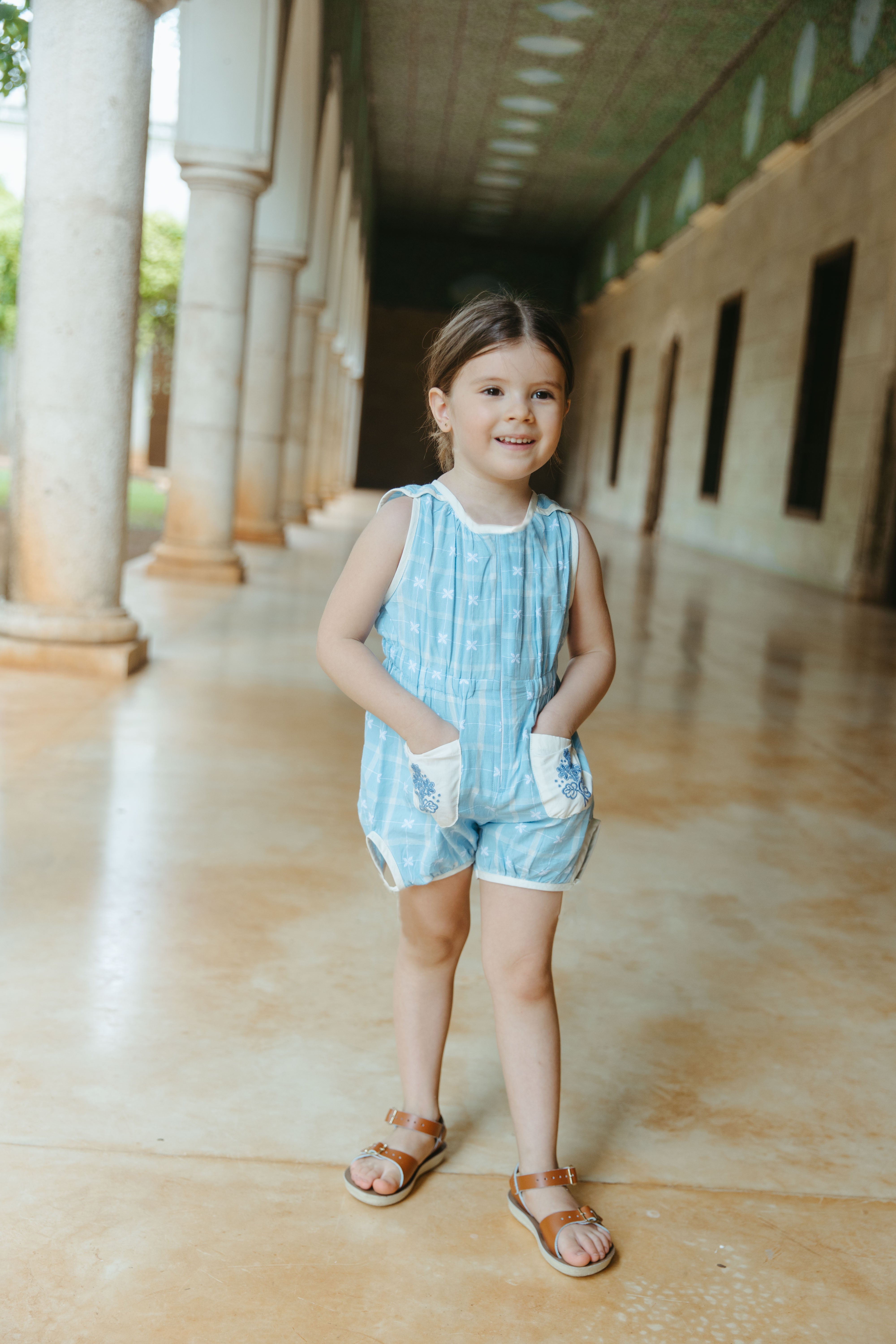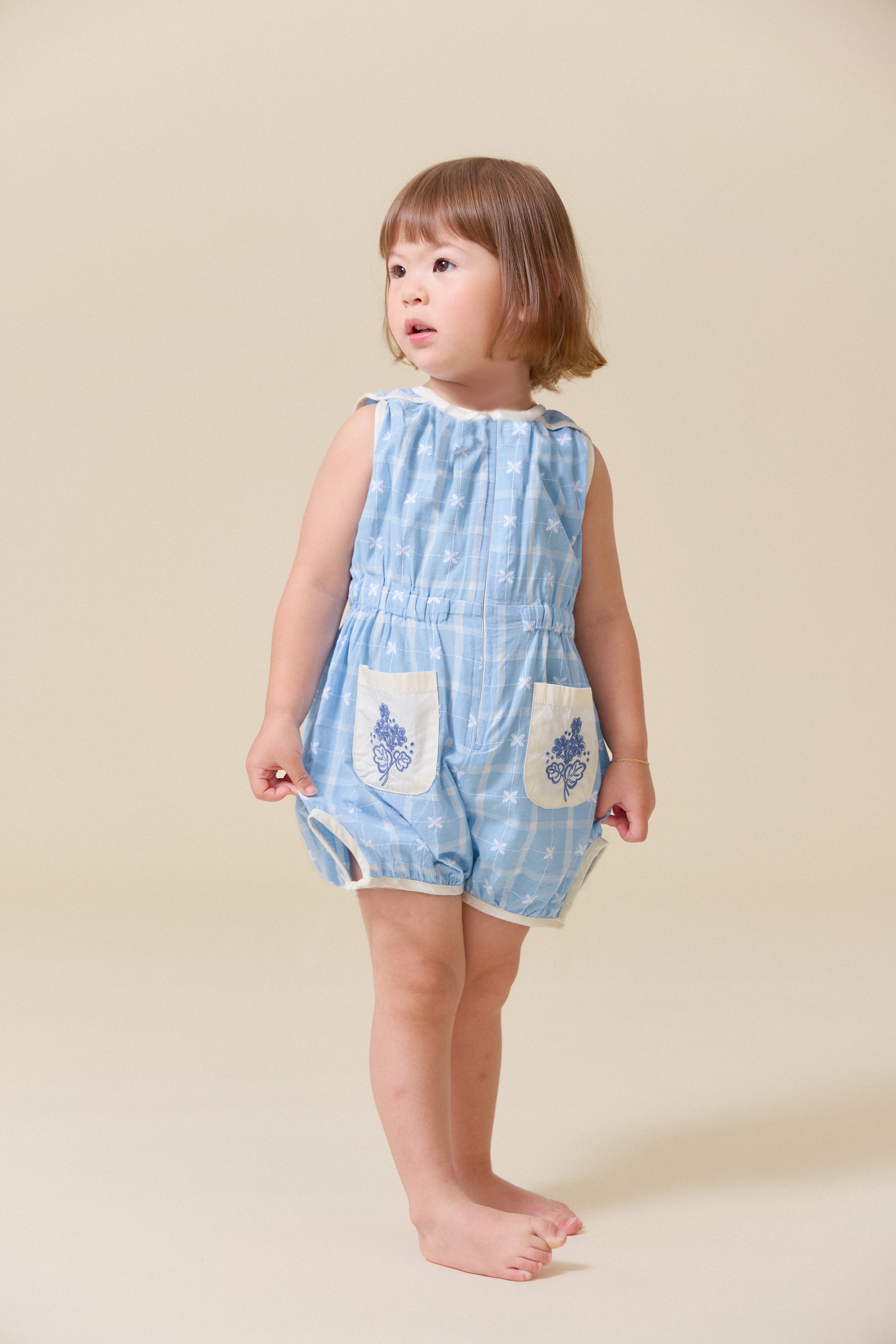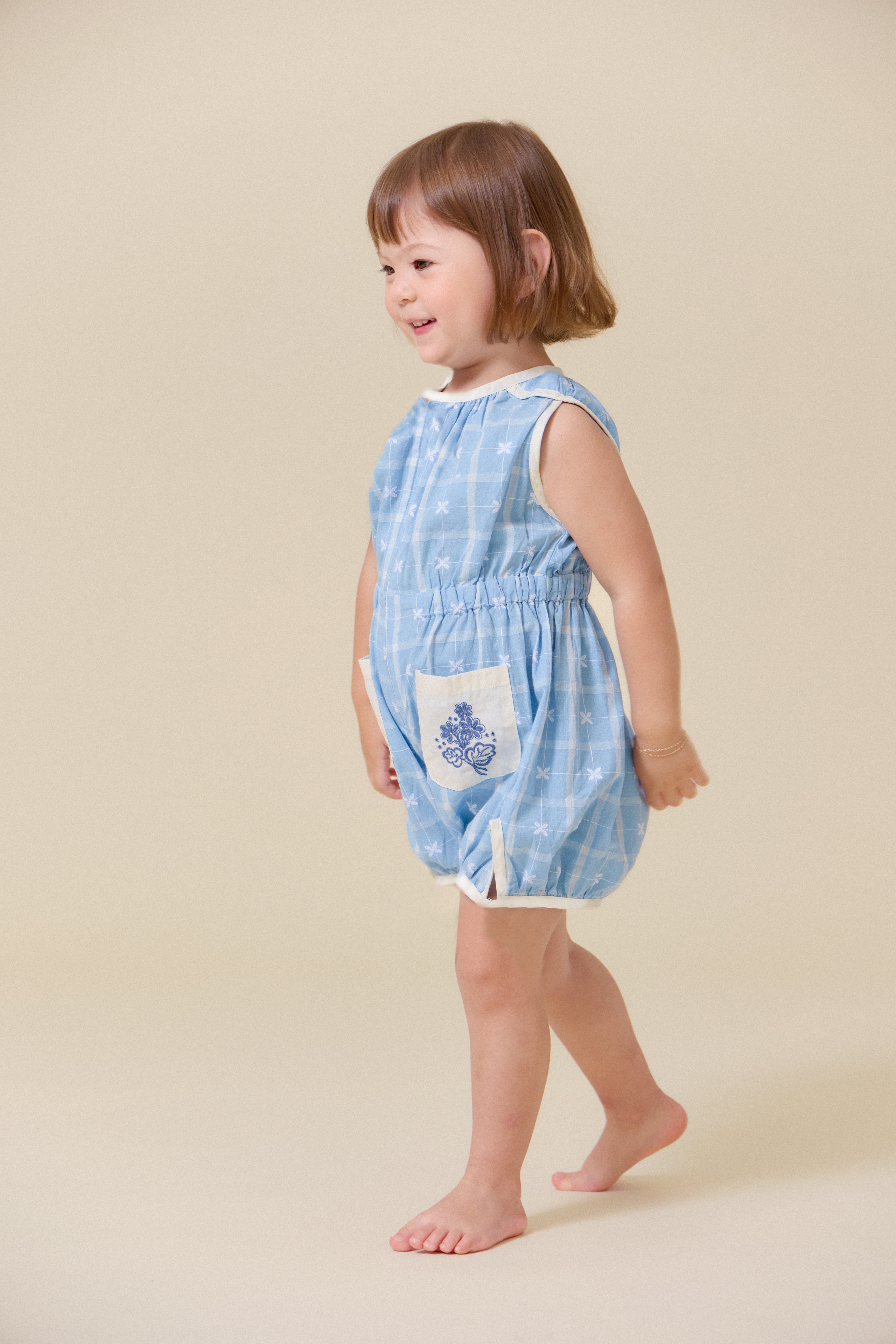 這款天空藍連身衣是復古風的經典之作,適合日常穿著,寬鬆俏皮的版型讓孩子們活動自如。前拉鍊設計方便快速換尿布和如廁,精緻的刺繡口袋更添Lali的獨特魅力。