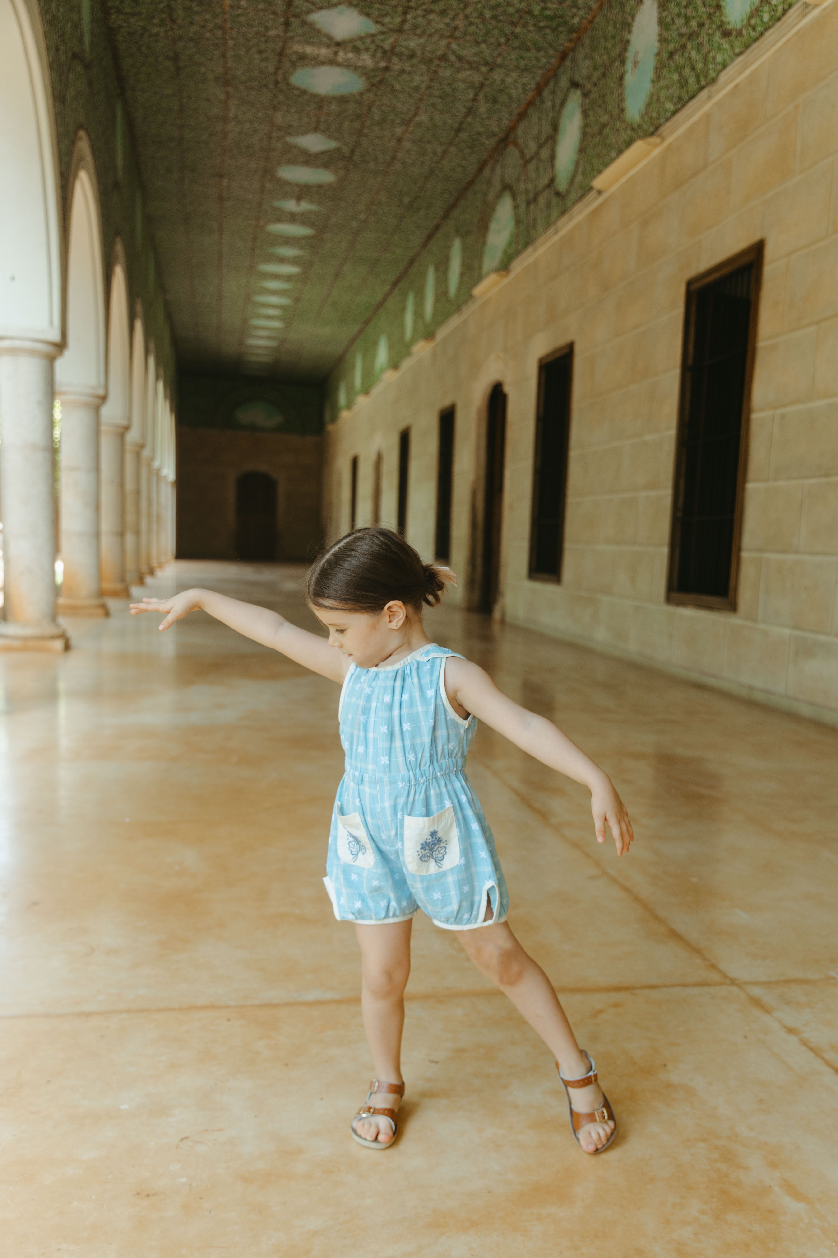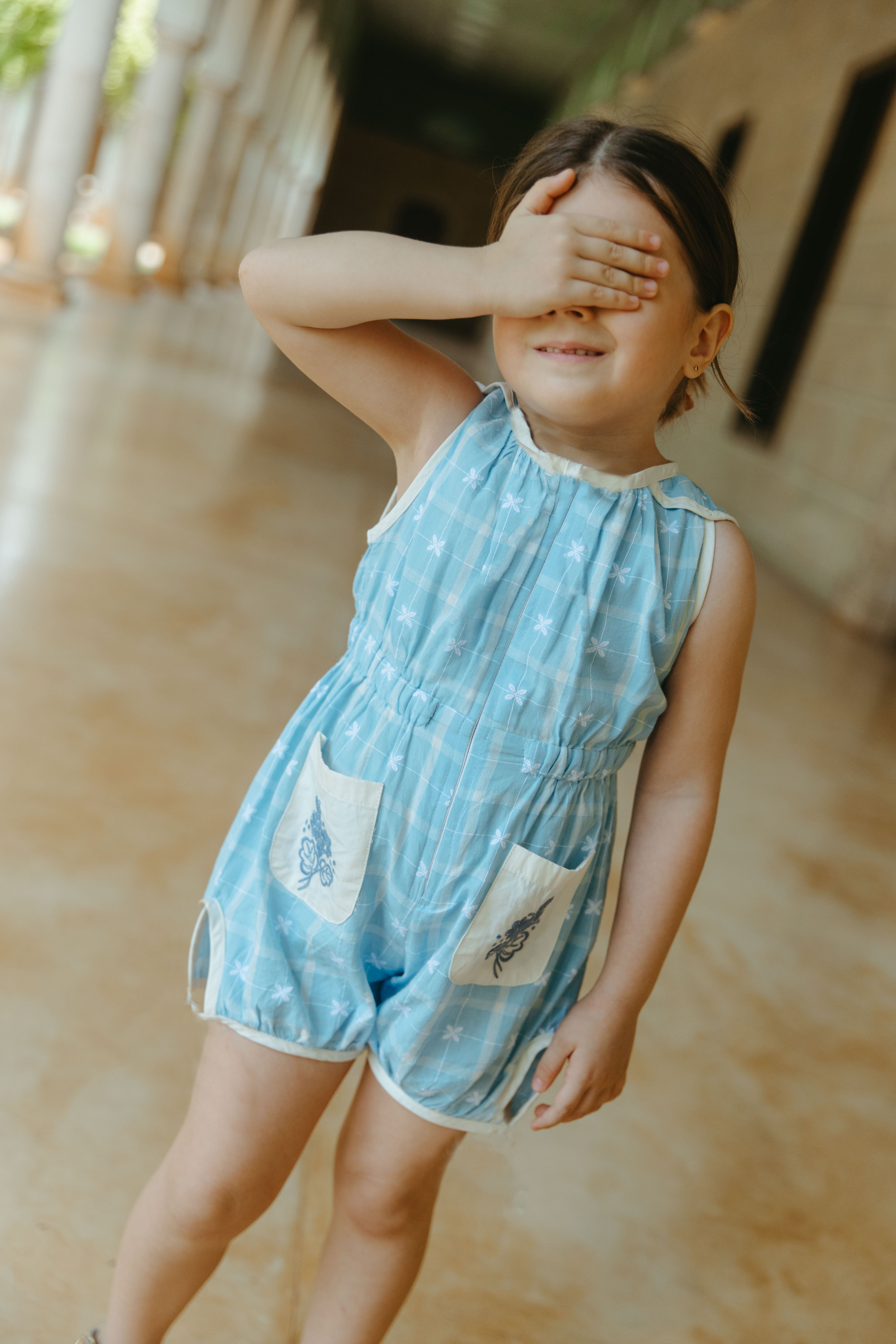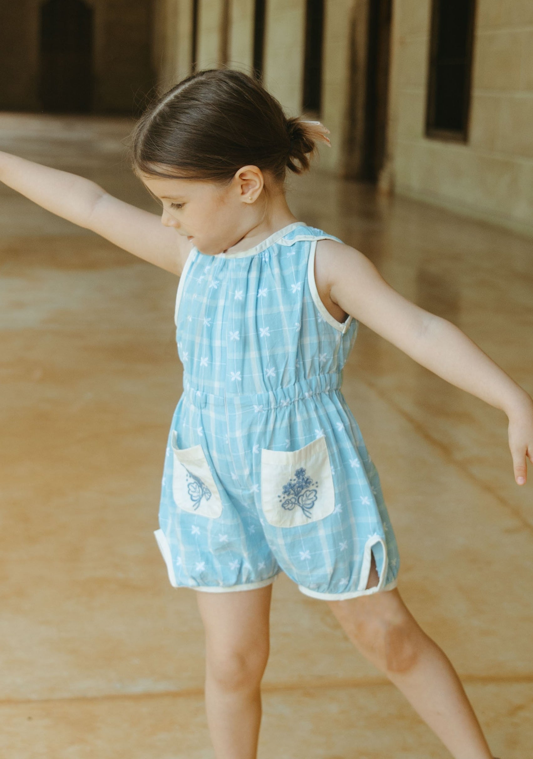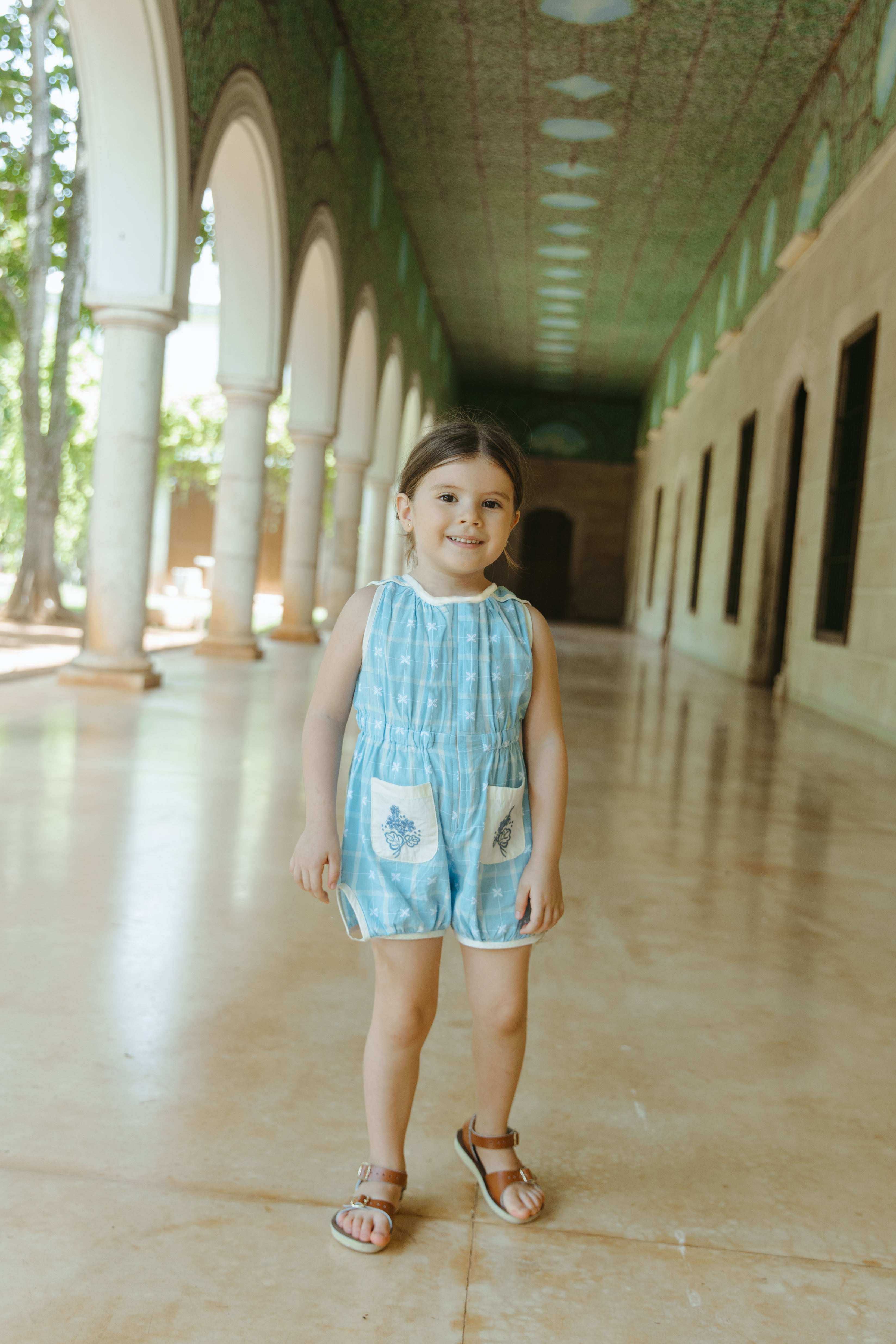 這款天空藍連身衣是復古風的經典之作,適合日常穿著,寬鬆俏皮的版型讓孩子們活動自如。前拉鍊設計方便快速換尿布和如廁,精緻的刺繡口袋更添Lali的獨特魅力。