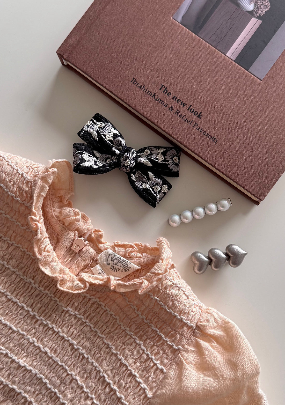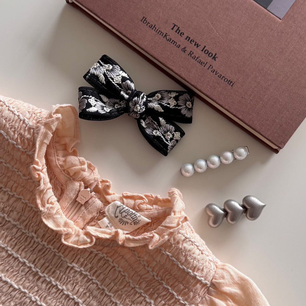 此套裝採用奢華的黑銀刺繡工藝製作,從古典刺繡、溫潤珍珠到童趣愛心,這是一組能陪伴女孩不同場合的精選搭配。小小髮飾,卻是讓穿搭完整的重要細節!能在女孩的衣櫥裡完美點亮氣質的小細節!