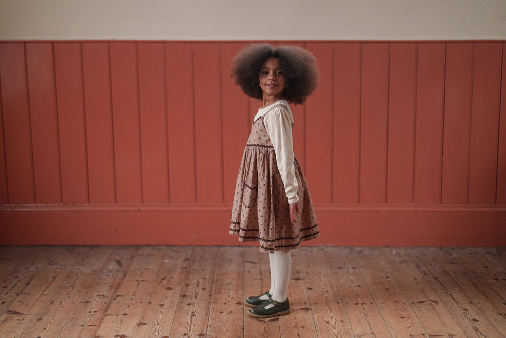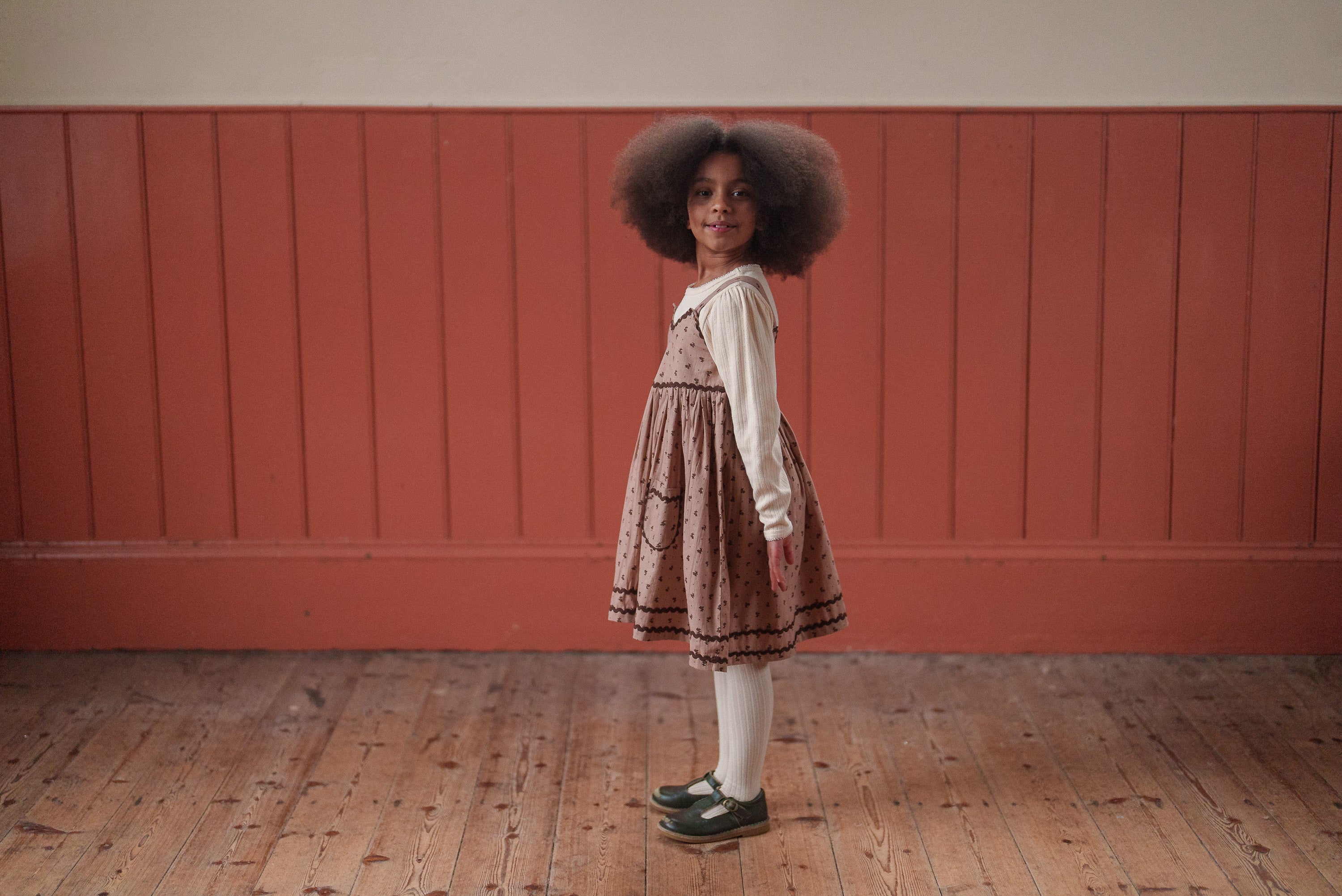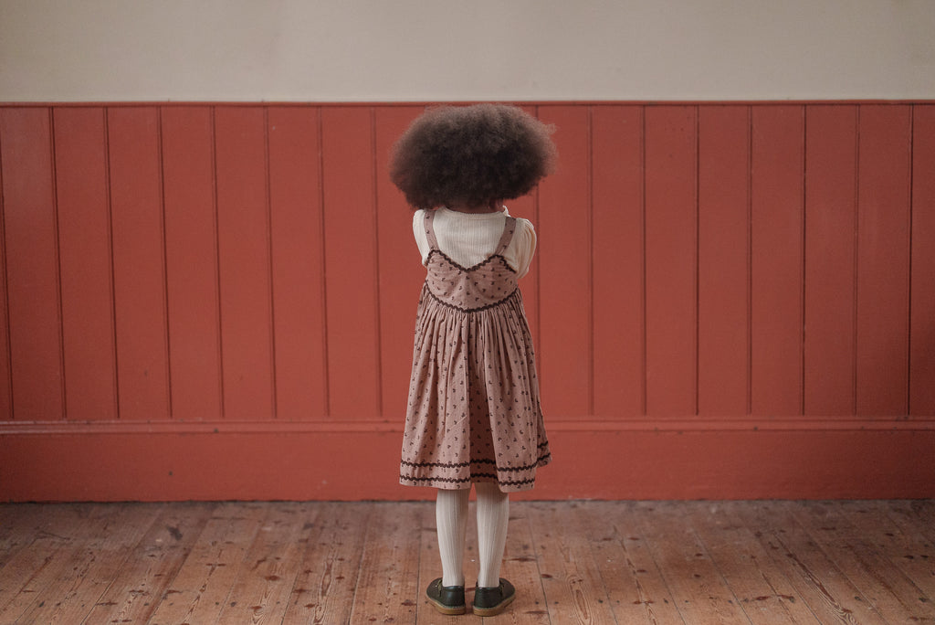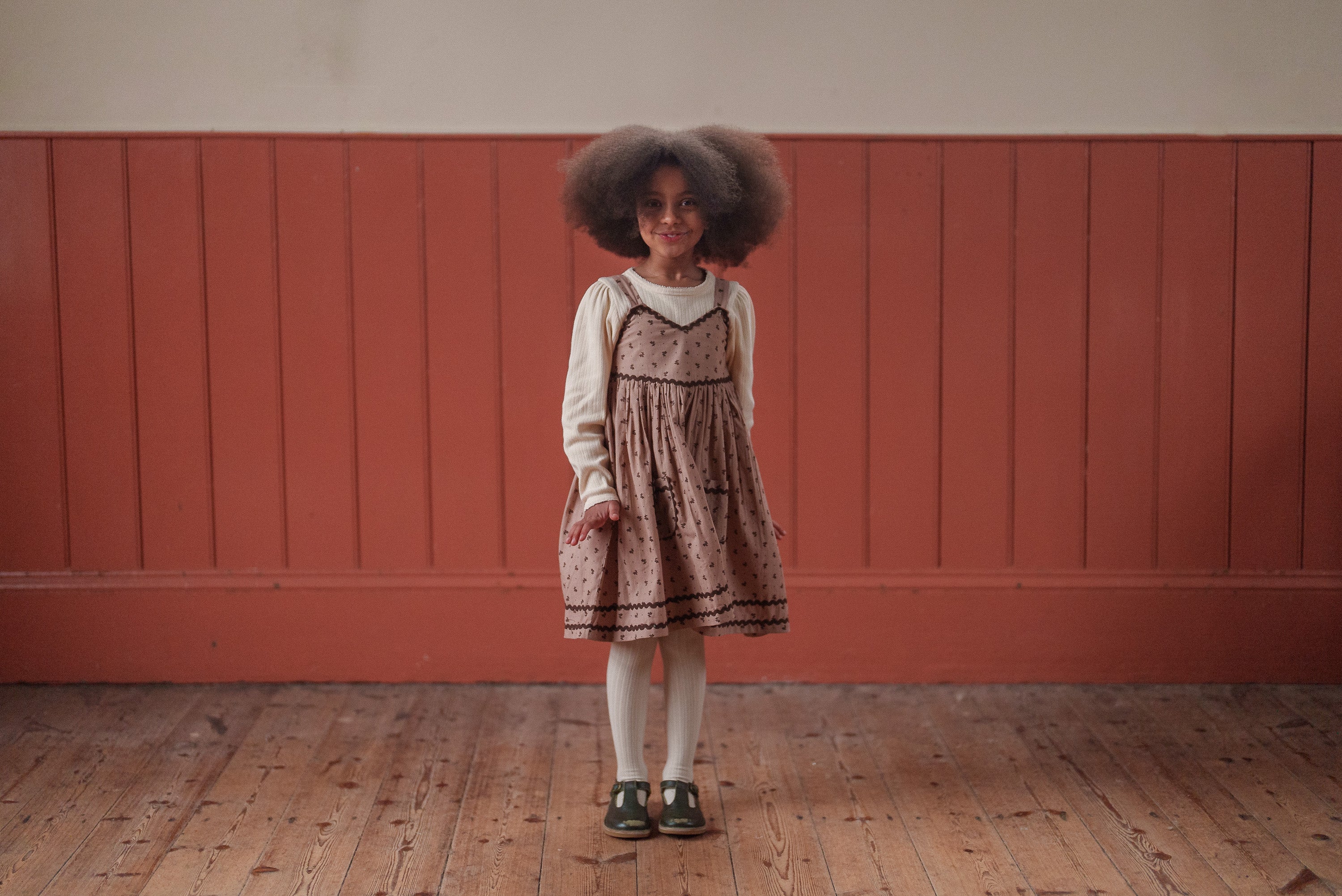 帶有復古氣息的吊帶洋裝,以品牌經典的 有機 Rosehip 花卉布料 製成,擁有優美的愛心弧形領口與立體剪裁的前後上身設計(可兩面穿),搭配對比色波浪滾邊與兩側開扣細節,展現細膩又充滿童趣的設計感。裙身為豐盈的略長版型,飾有貼袋與雙層波浪滾邊裝飾,單穿或無論搭配T恤、襯衫或針織外套、褲襪,都能輕鬆展現優雅可愛的風格。日常穿著舒適美,也非常適合重要的特別場合。🌿