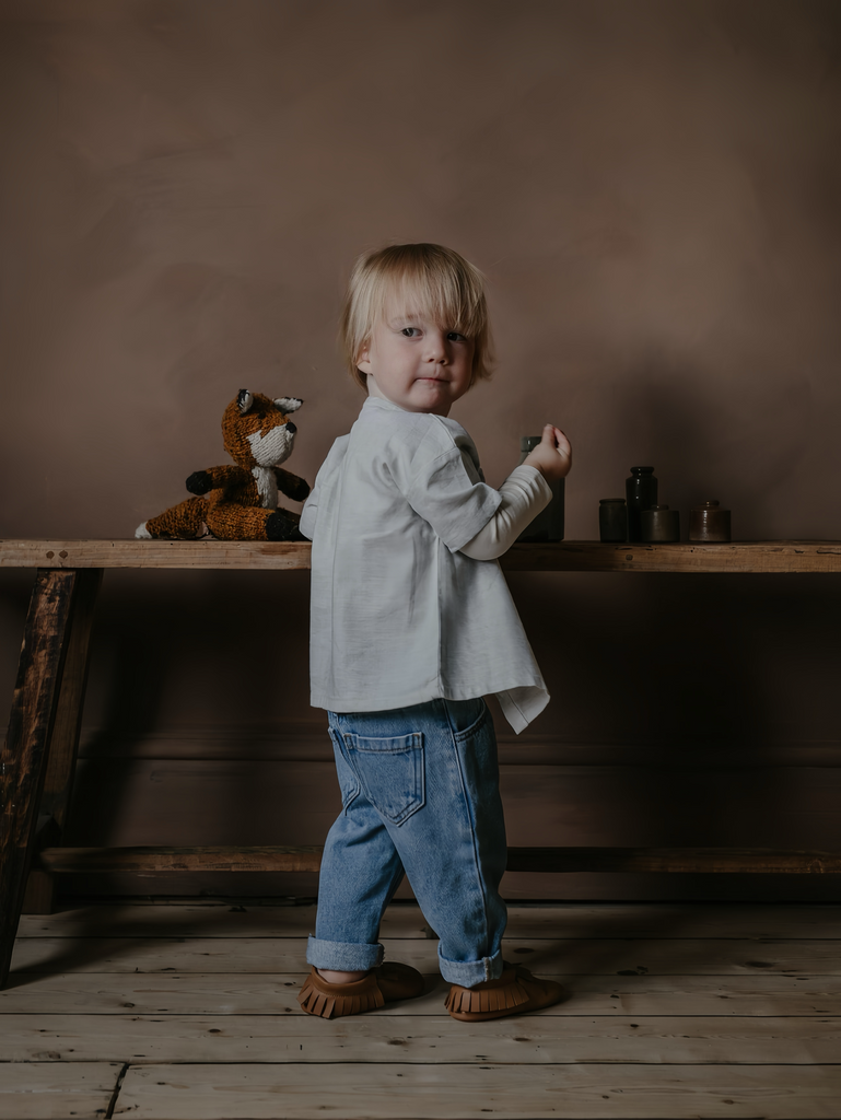 Available in classic light denim or camel twill, our timeless, vintage style jeans are sure to become a daily wardrobe staple. Features pockets on the sides and in the back to hold your child’s most cherished keepsakes and an elastic waist for easy on and off.