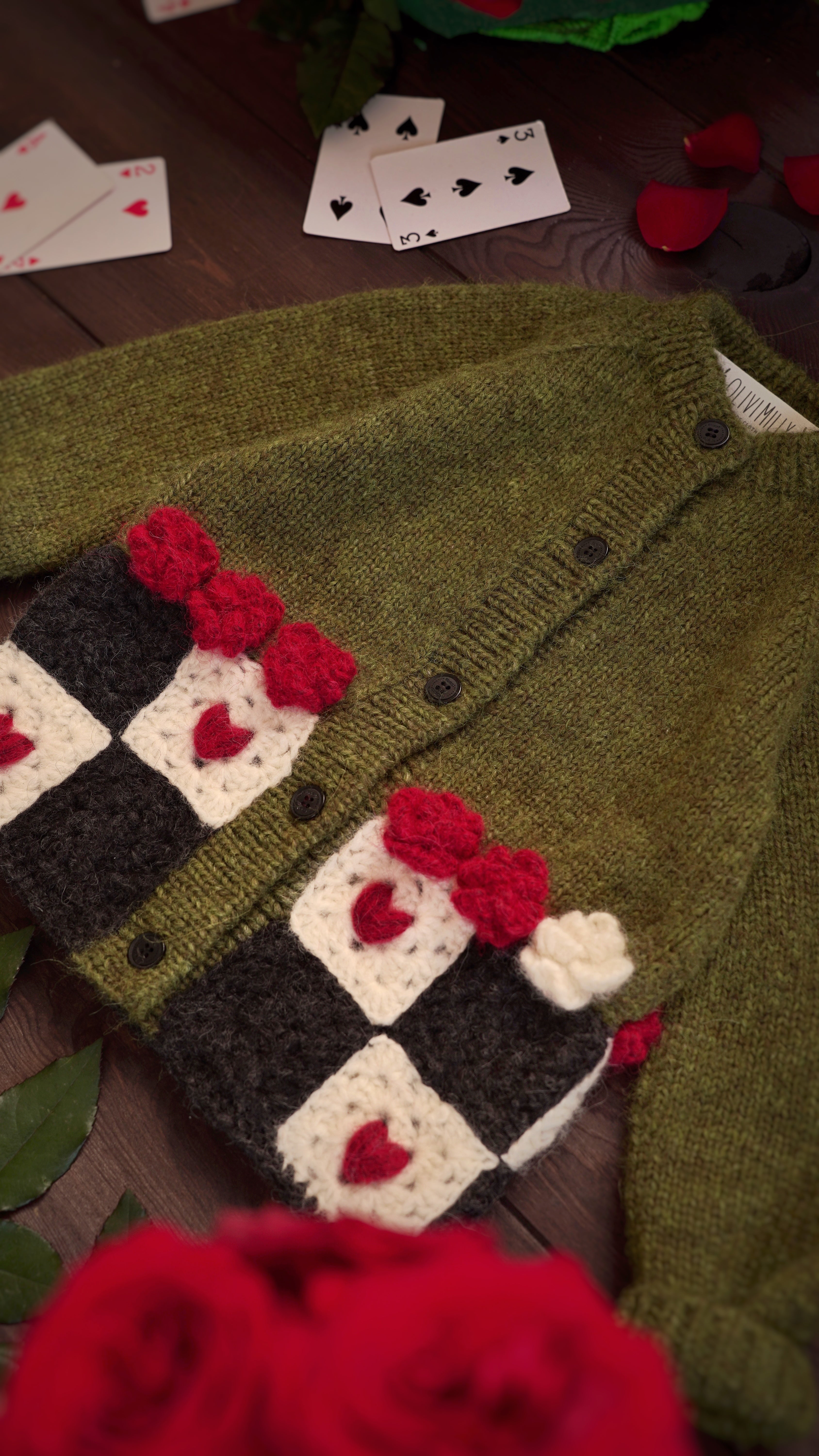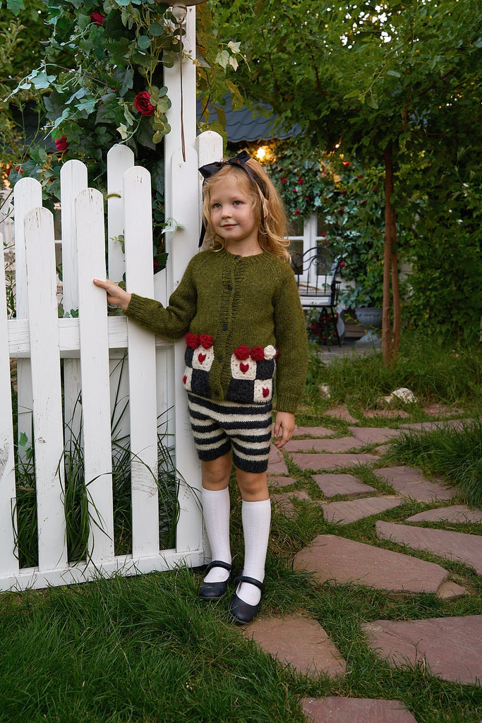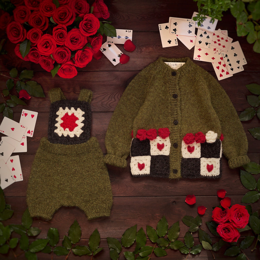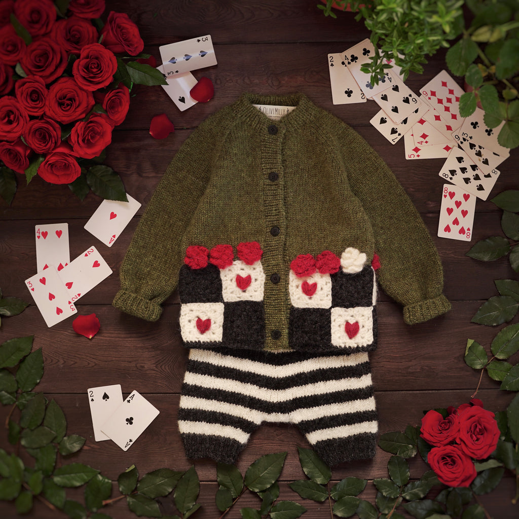 歡迎來到 Wonderland 像是掉進了兔子洞後,來到了奇幻的仙境王國,下擺的飾有玫瑰花球及方塊紅心,為整件衣服增添了一絲俏皮與古靈精怪的氣質。 這款外套由工匠以滿滿的愛與細膩手工編織而成,是陪伴孩子一起踏上奇幻夢境冒險旅程之選。🌸
