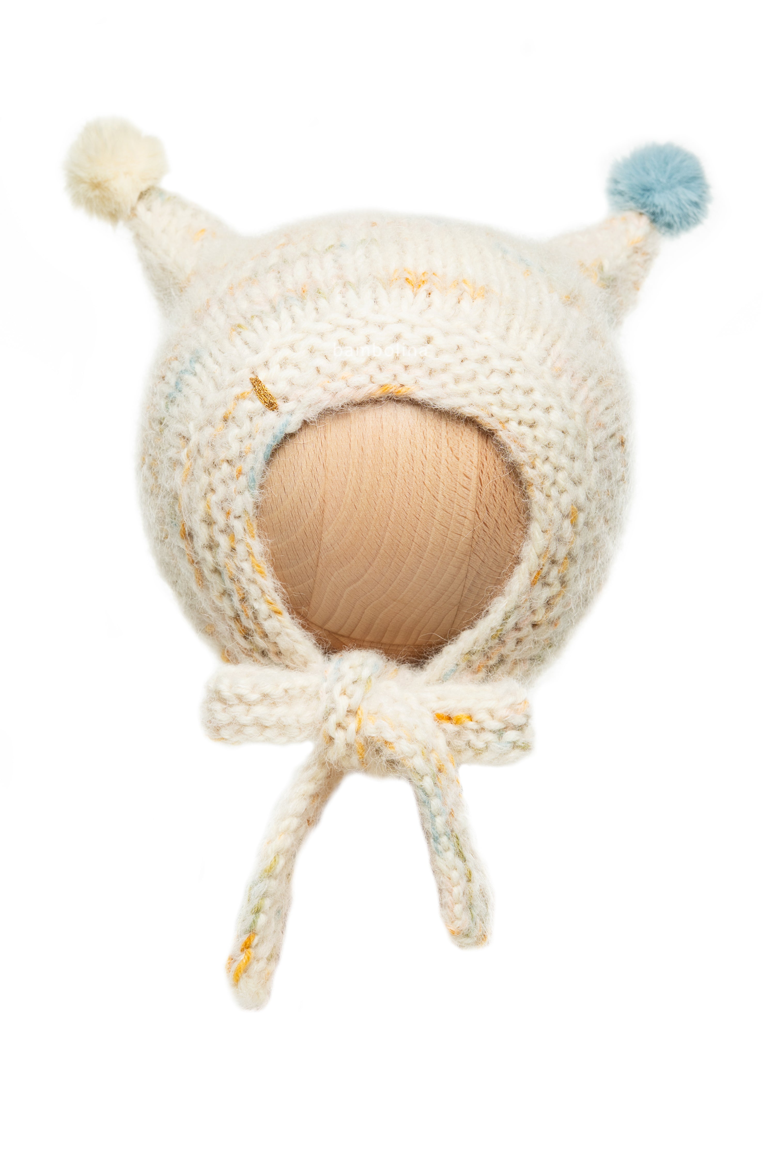 Soft knitted circus bonnet for baby and toddlers. Bonnet tieded under the neck, covers the ears and is very flexible. The original blend of the best selections of light popcorn wool and alpaca creates a soft handfeel but at the same time very light baby hat. The characteristic hat shape makes the look of baby adorable and original.