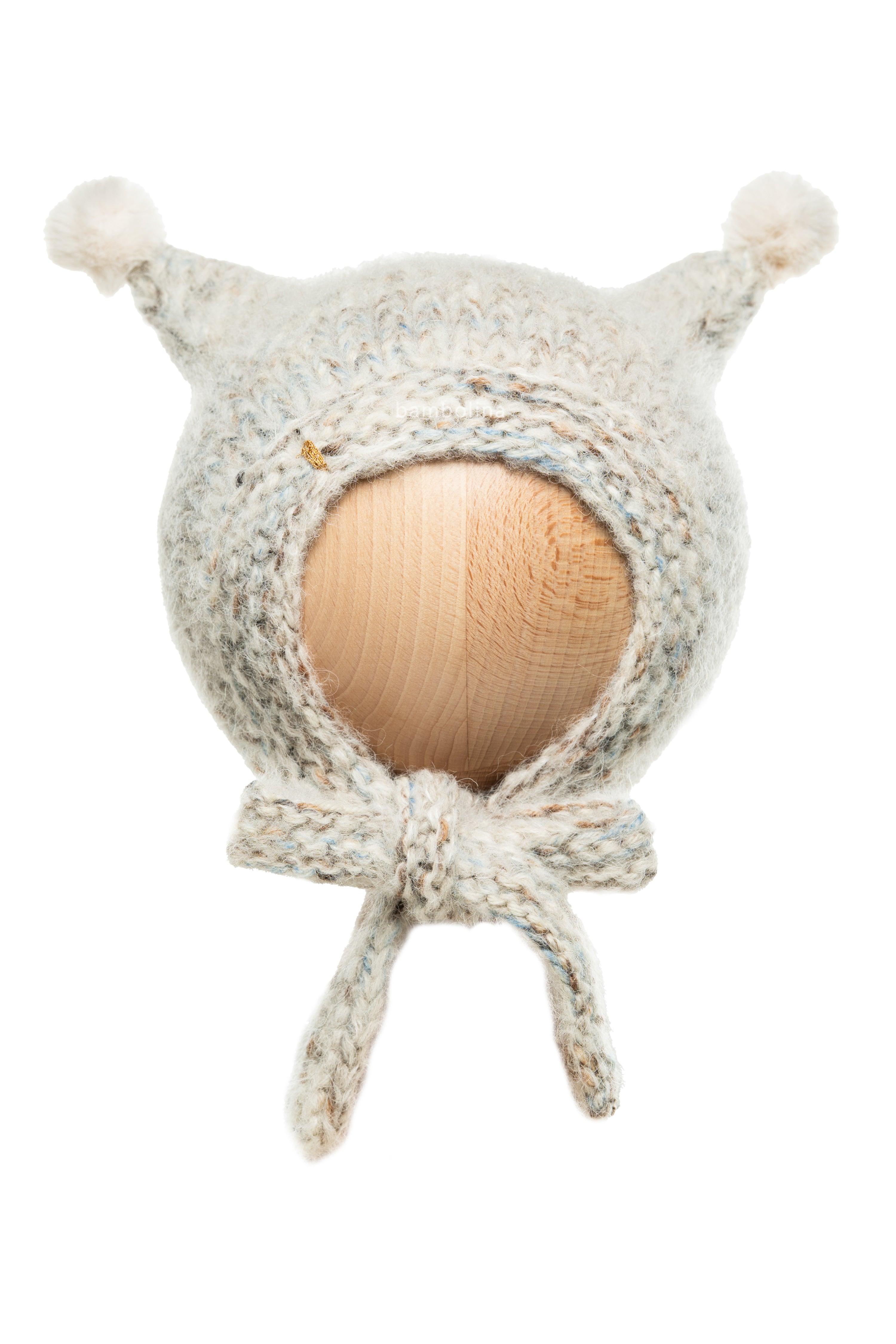 Soft knitted circus bonnet for baby and toddlers. Bonnet tieded under the neck, covers the ears and is very flexible. The original blend of the best selections of light popcorn wool and alpaca creates a soft handfeel but at the same time very light baby hat. The characteristic hat shape makes the look of baby adorable and original.