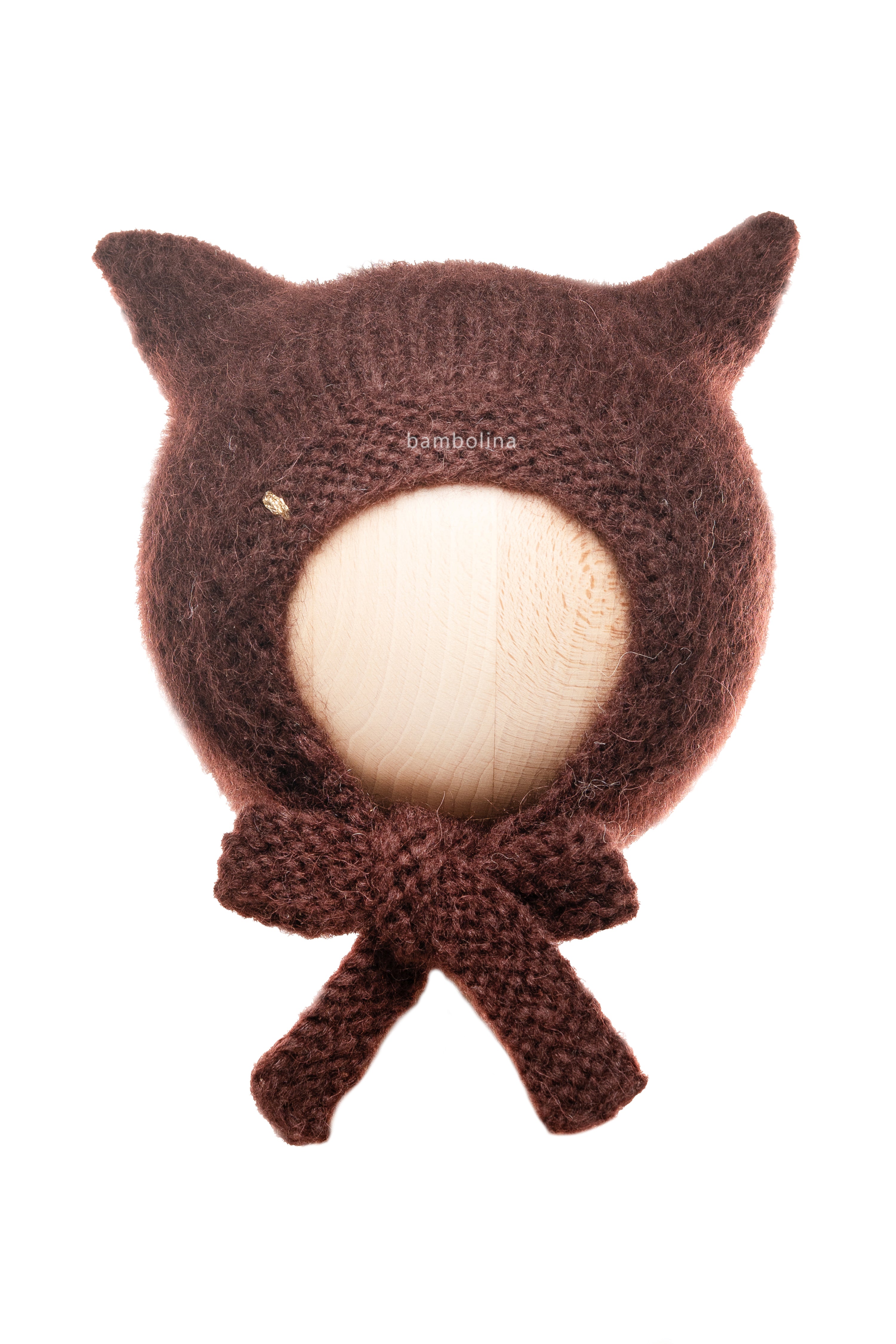 預購 bambolina, bambolina kitty plum in chocolate 經典小貓針織造型帽 巧克力李子 幼山羊馬海毛&羊駝 6m-4y+