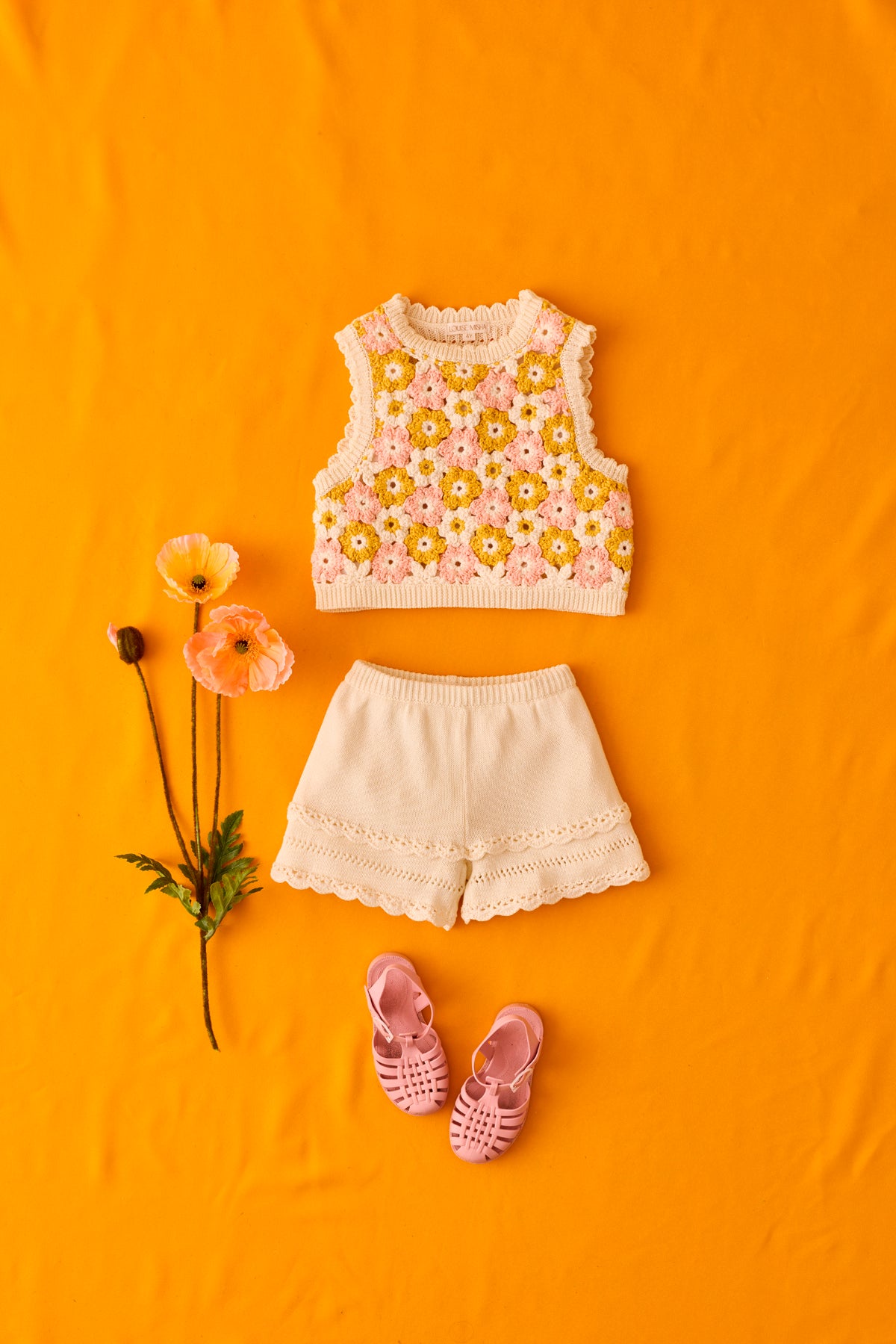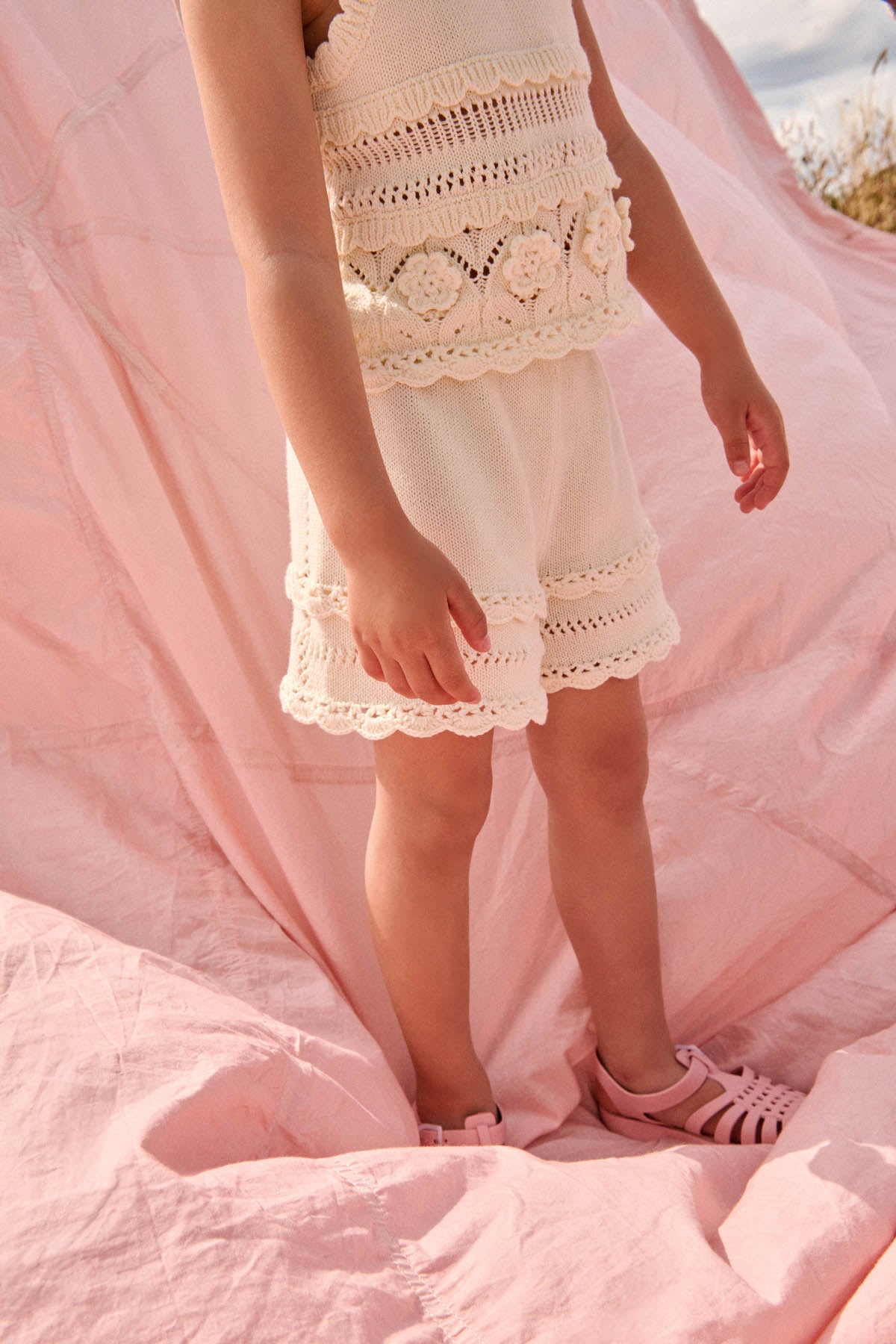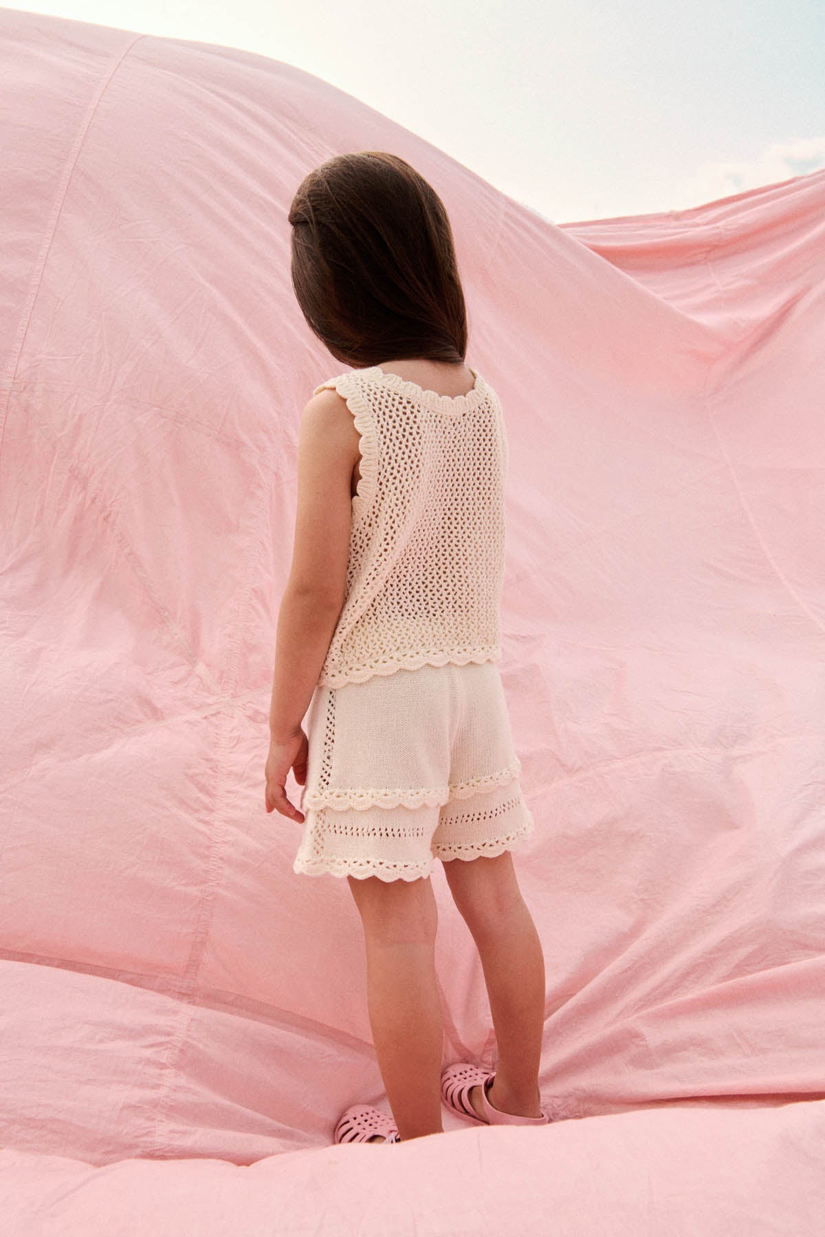 - 前後及下擺均飾有手工鉤織波浪邊。