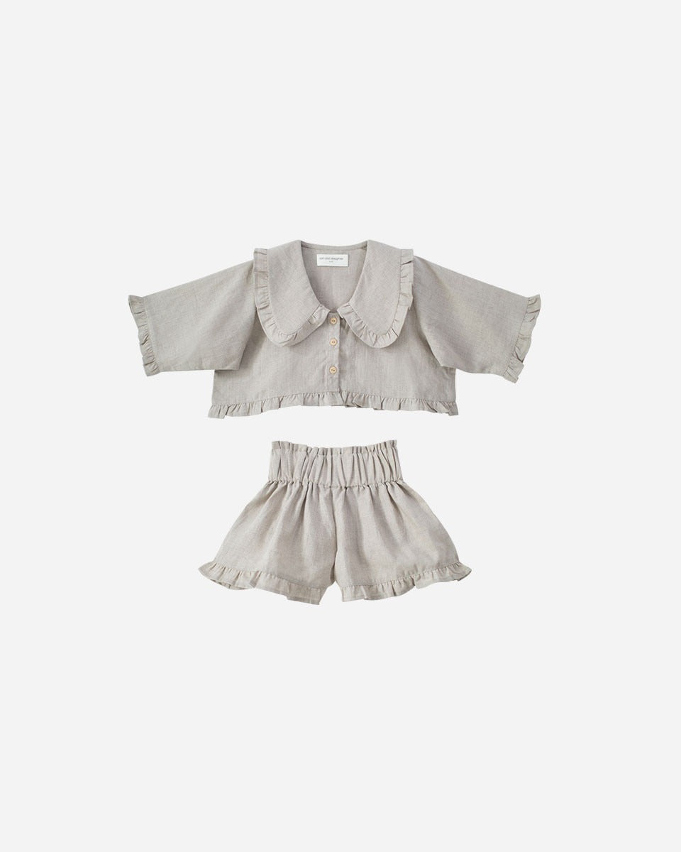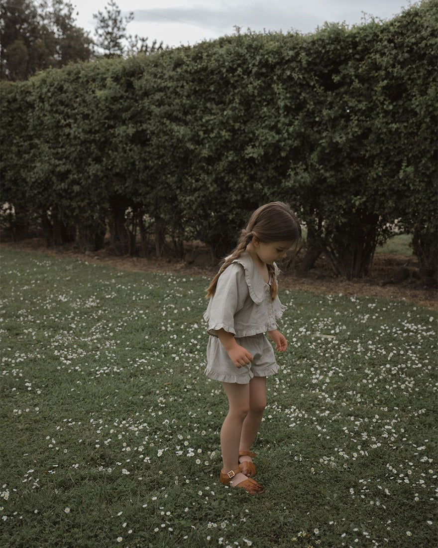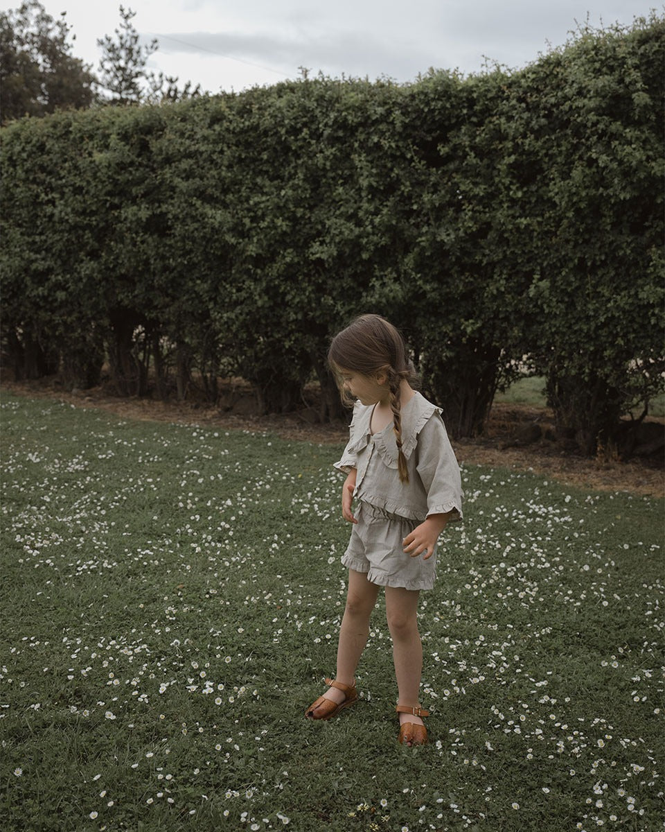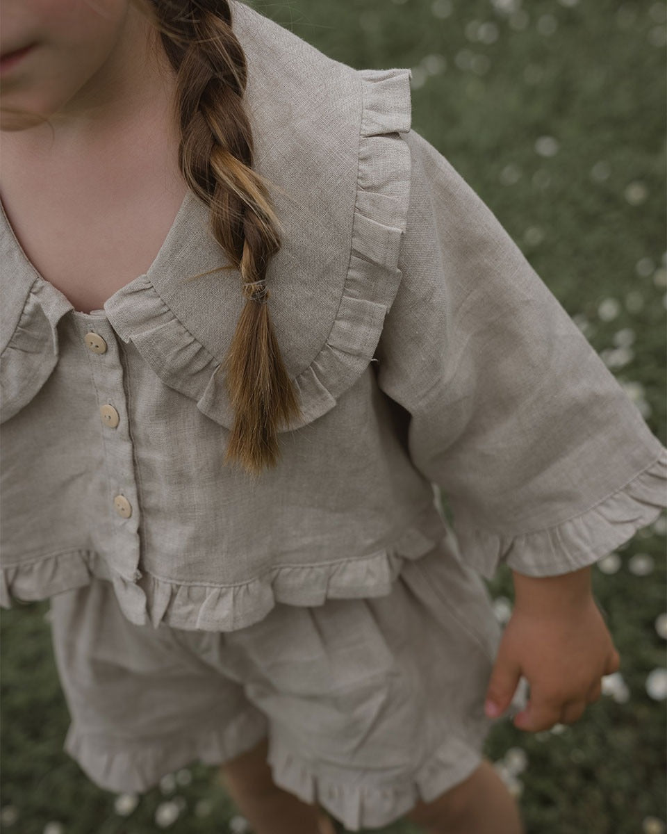 這款精美的亞麻套裝採用寬鬆版型設計,讓孩子們可以自由活動、玩耍和做夢。上衣採用經 OEKO-TEX 認證的 100% 亞麻布料,配有寬大的荷葉邊領和紐帶前襟;配套的短褲則採用鬆緊腰帶和荷葉邊褲腳,打造輕鬆舒適的造型。與 Carmen 成人亞麻套裝完美搭配,打造甜美的母女親子裝時刻。