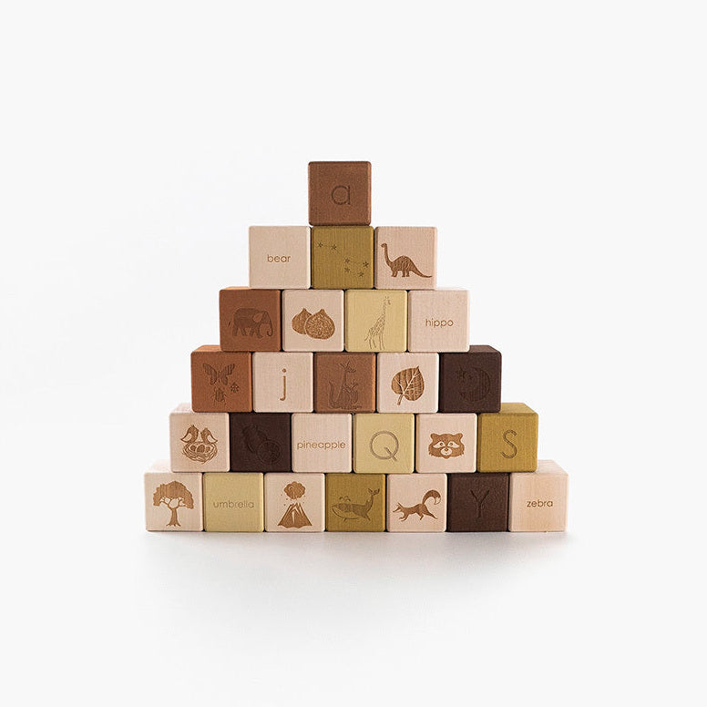 Each block features four engraved sides showing an illustration, uppercase letter, lowercase letter and a word matching the alphabet letter they represent (not necessarily the first letter in a word) - with two plain sides: top and bottom.