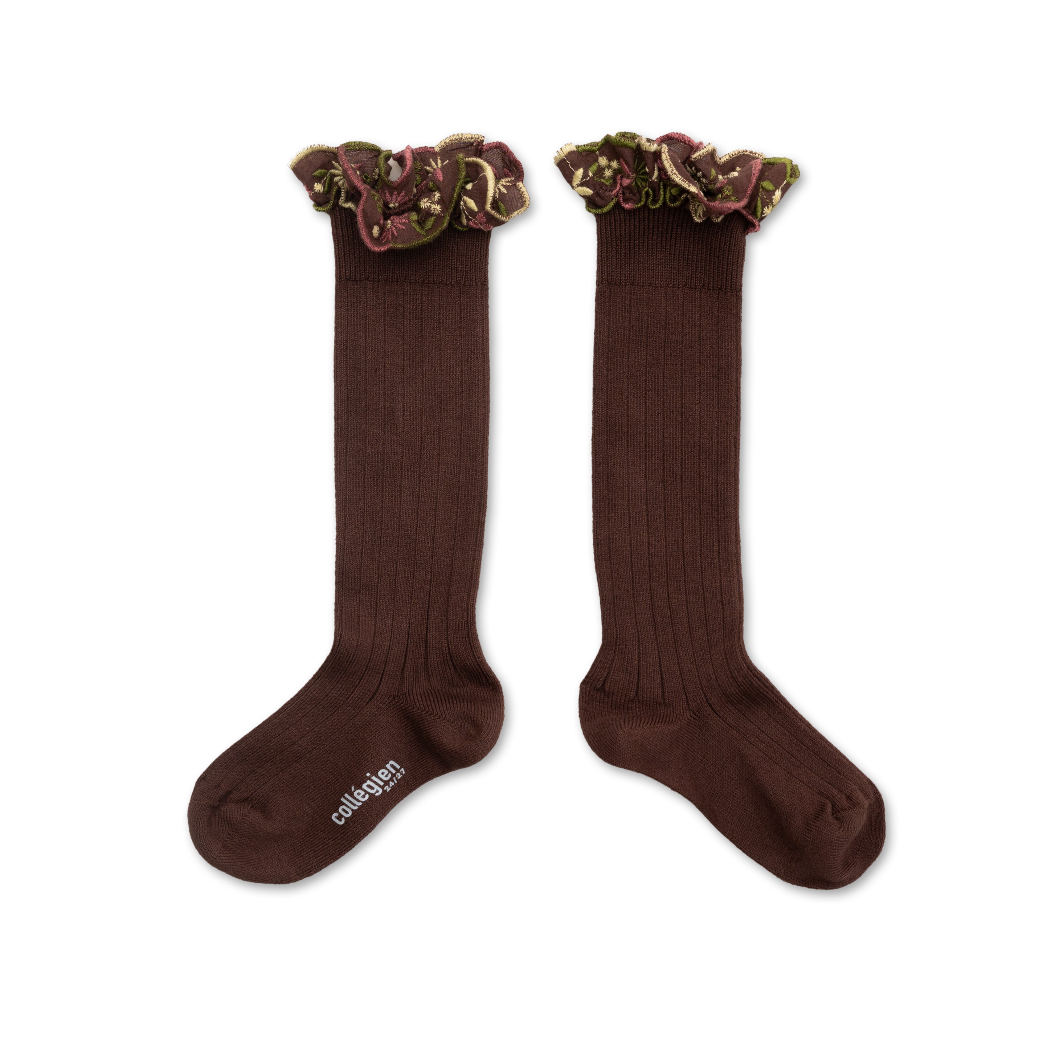 Eglantine - Chaussettes hautes avec volant brodé fleurs