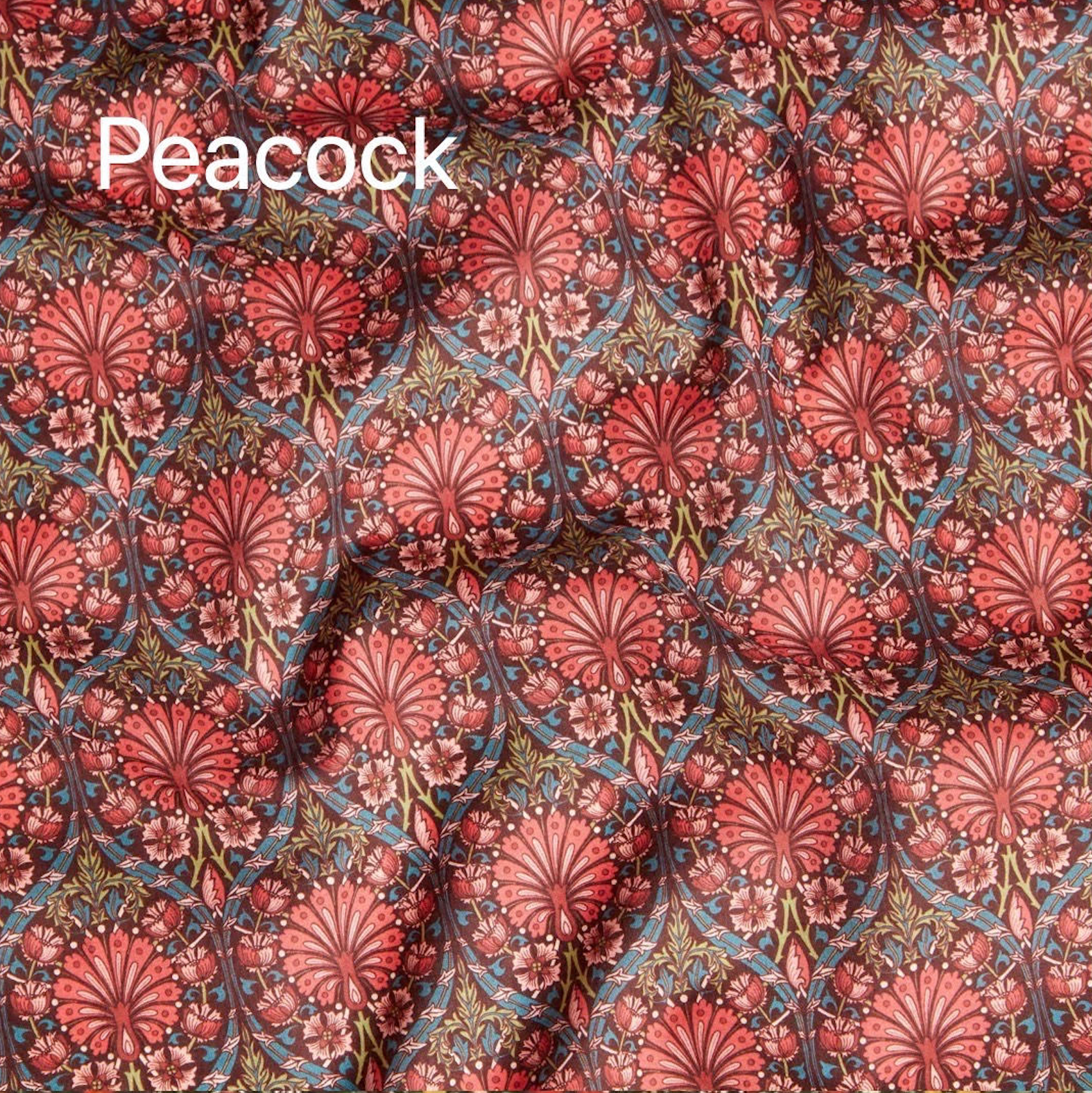 取自Liberty檔案館中發現的 20 世紀 70 年代的紙質印象。以優雅的雙曲線步道為框架,以對稱佈局排列,其滾動的樹葉和風格化的有機形式是工藝美術時期的典型特徵。這個設計代表了眾神女王赫拉的故事,她的孔雀象徵體現在雄偉的扇尾花瓣上。