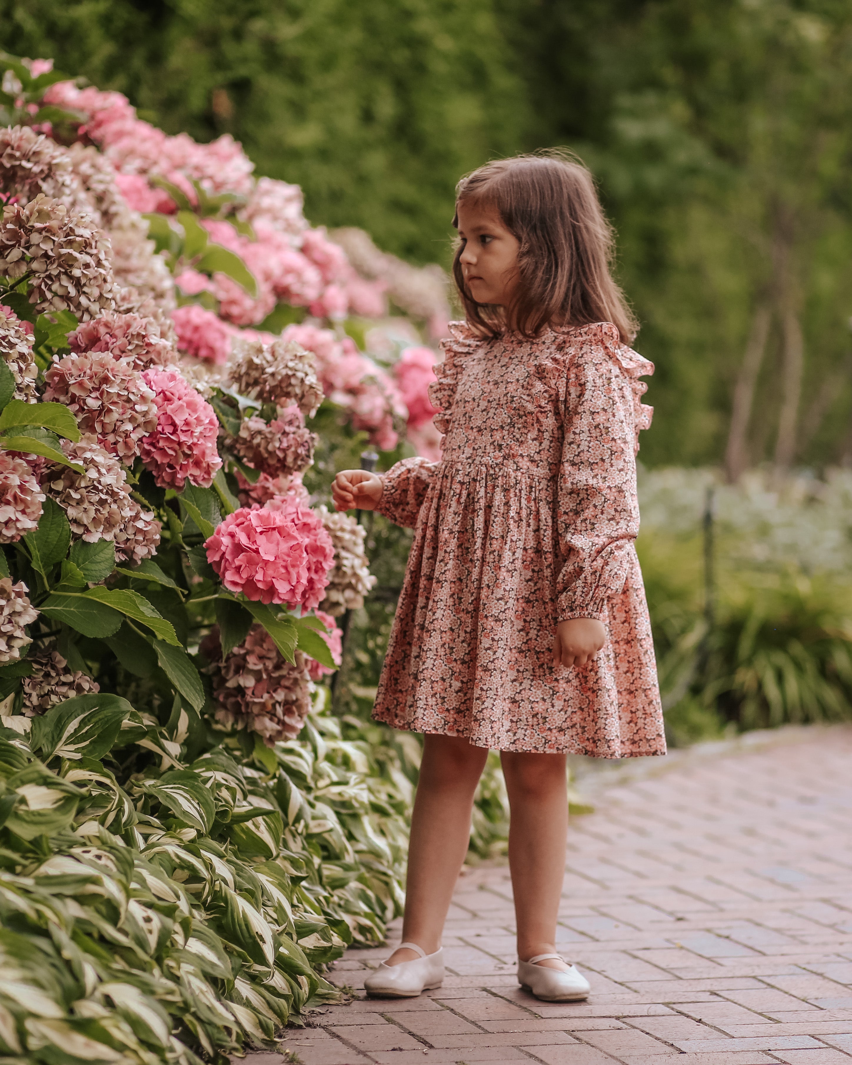 漂亮的連衣裙, 荷葉邊細節,長褶袖,背面有木鈕扣和褶皺裙。是陪伴孩子成長值得購入的款式。帶給你和孩子最甜美四季的必備款式。