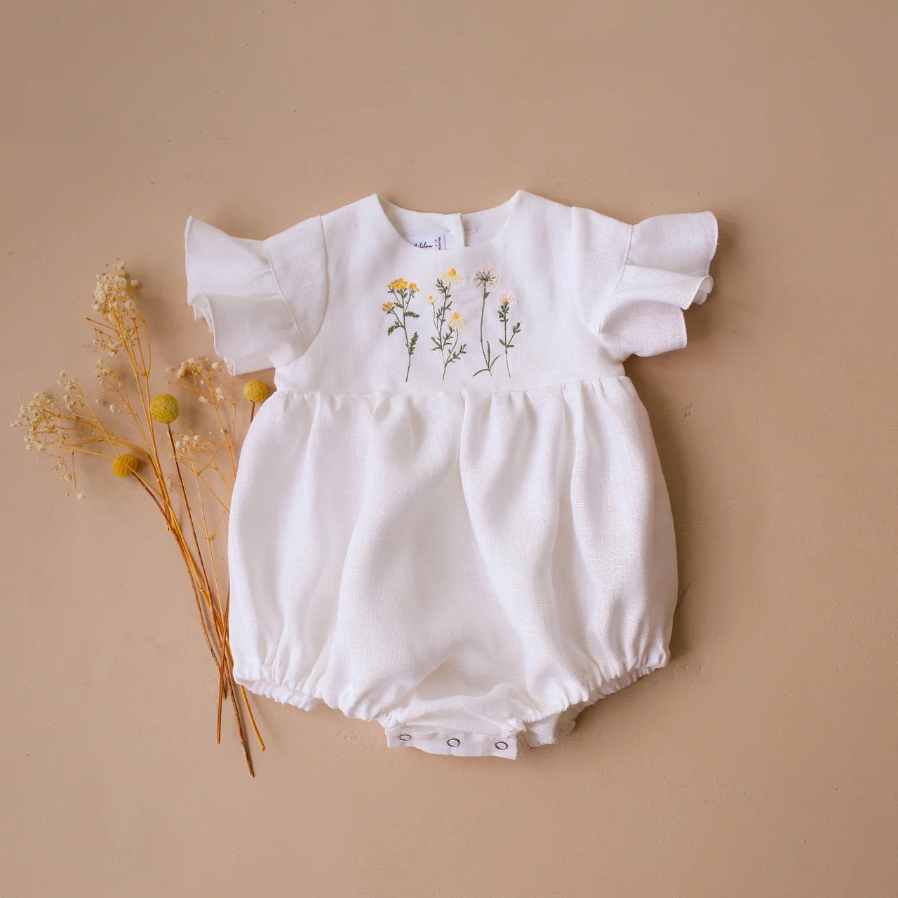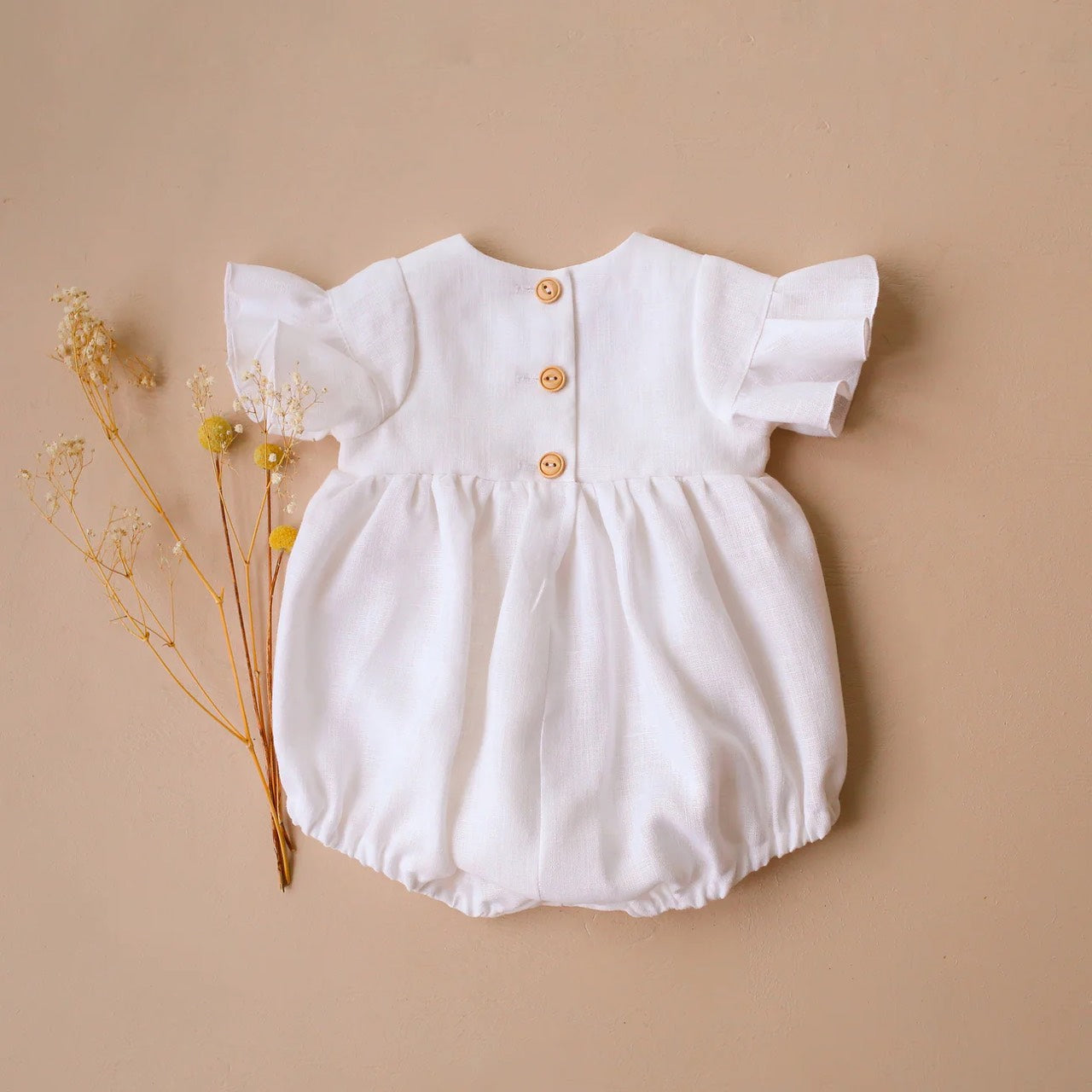 Sweet bubble playsuit with flounce sleeves, elastic at legs, wooden buttons down the back, snaps at the crotch for easy changing.