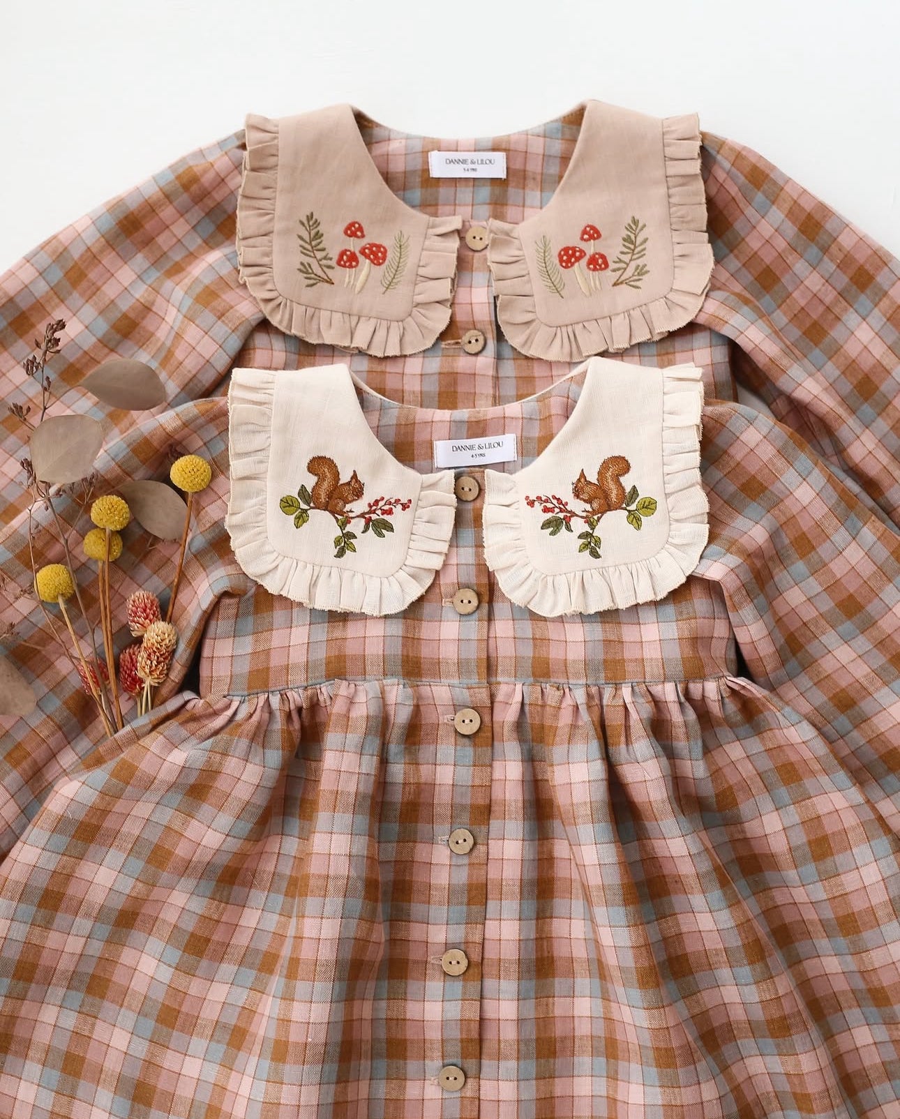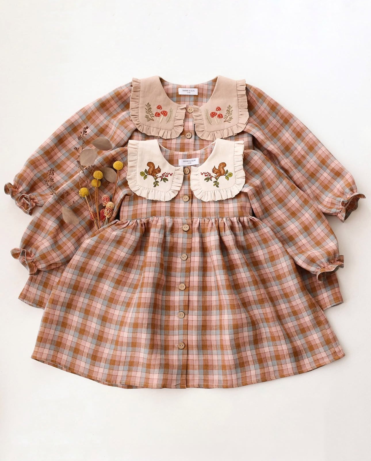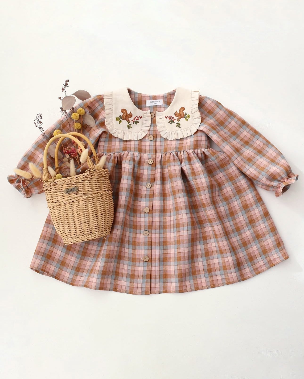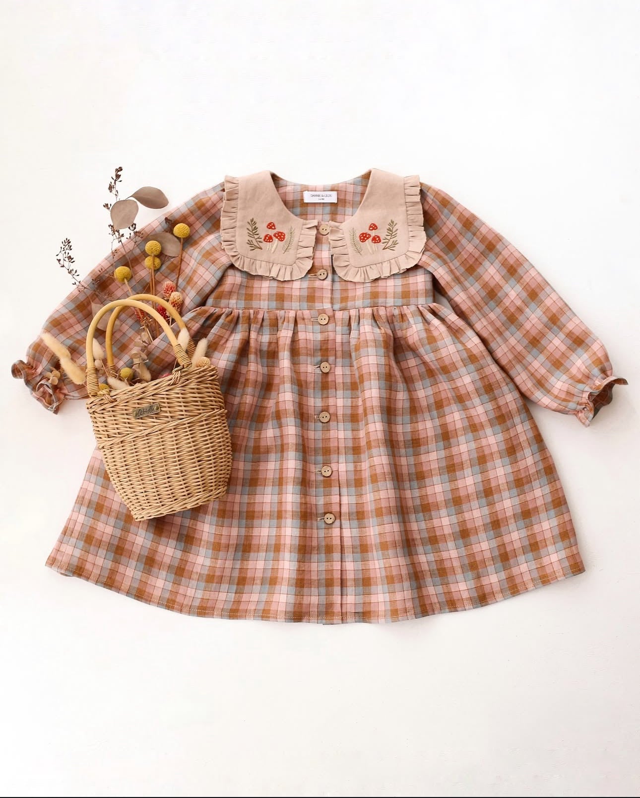 預購, 刺繡系列 Long Sleeve Dress with Square Collar 方領荷葉邊長袖排扣洋裝 6m-10y 多色可選 (領片可另選顏色,刺繡請選小圖)(主圖色:Mulberry Fern Check 桑莓蕨葉格紋 與 Latte 拿鐵, 刺繡:Cottage Bouquet 田園花束)