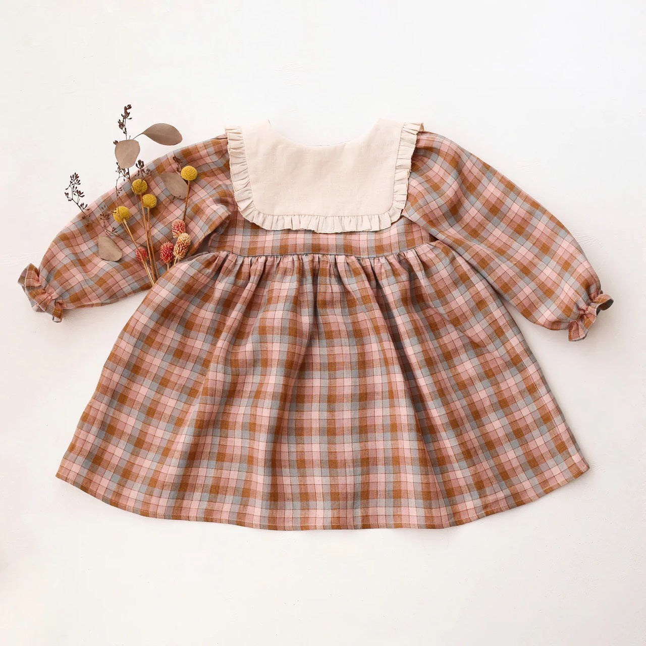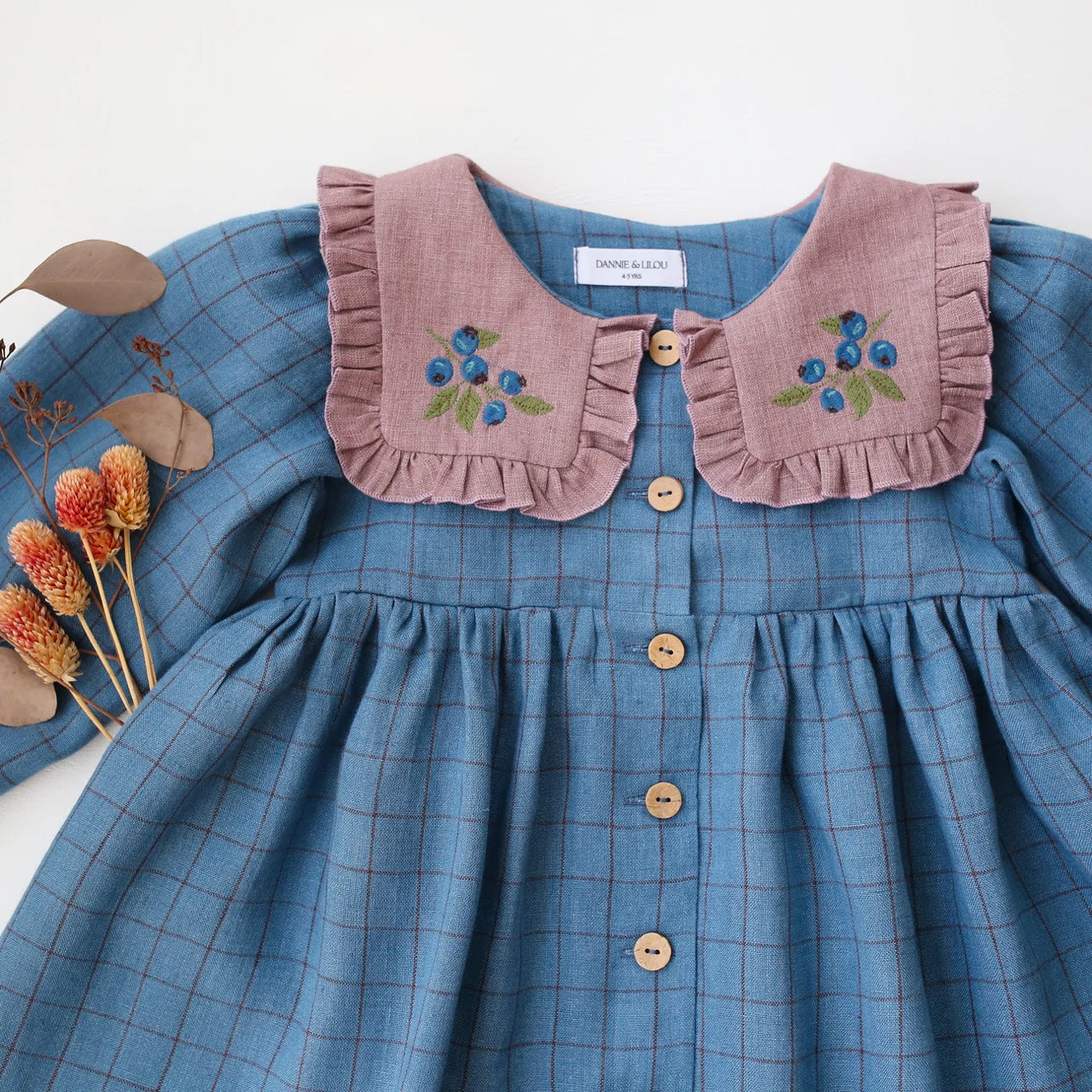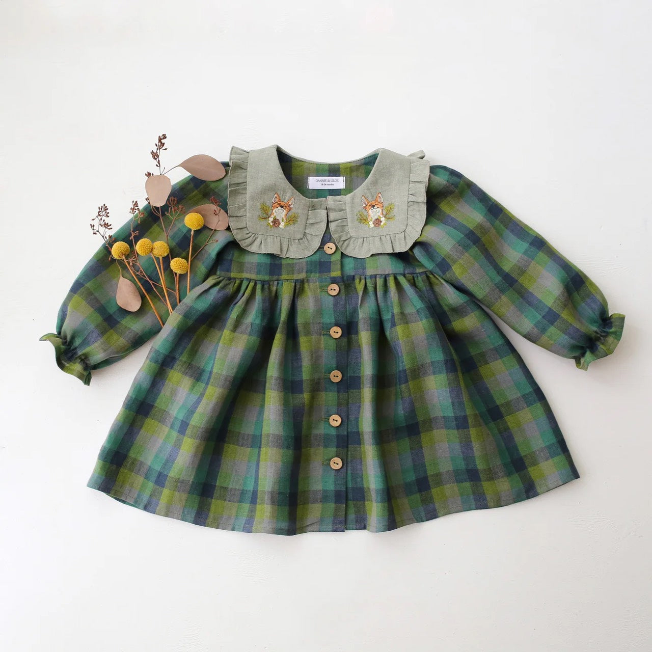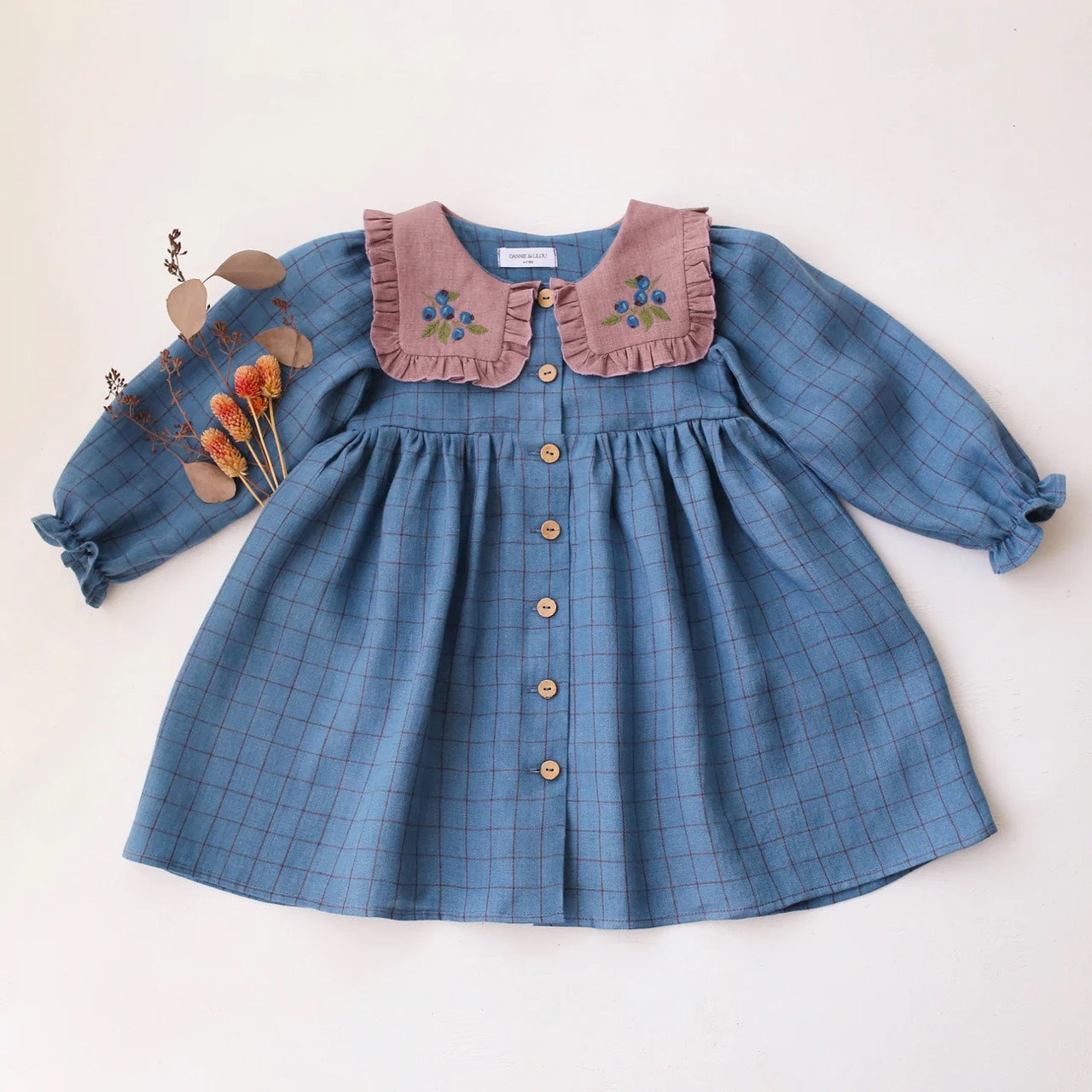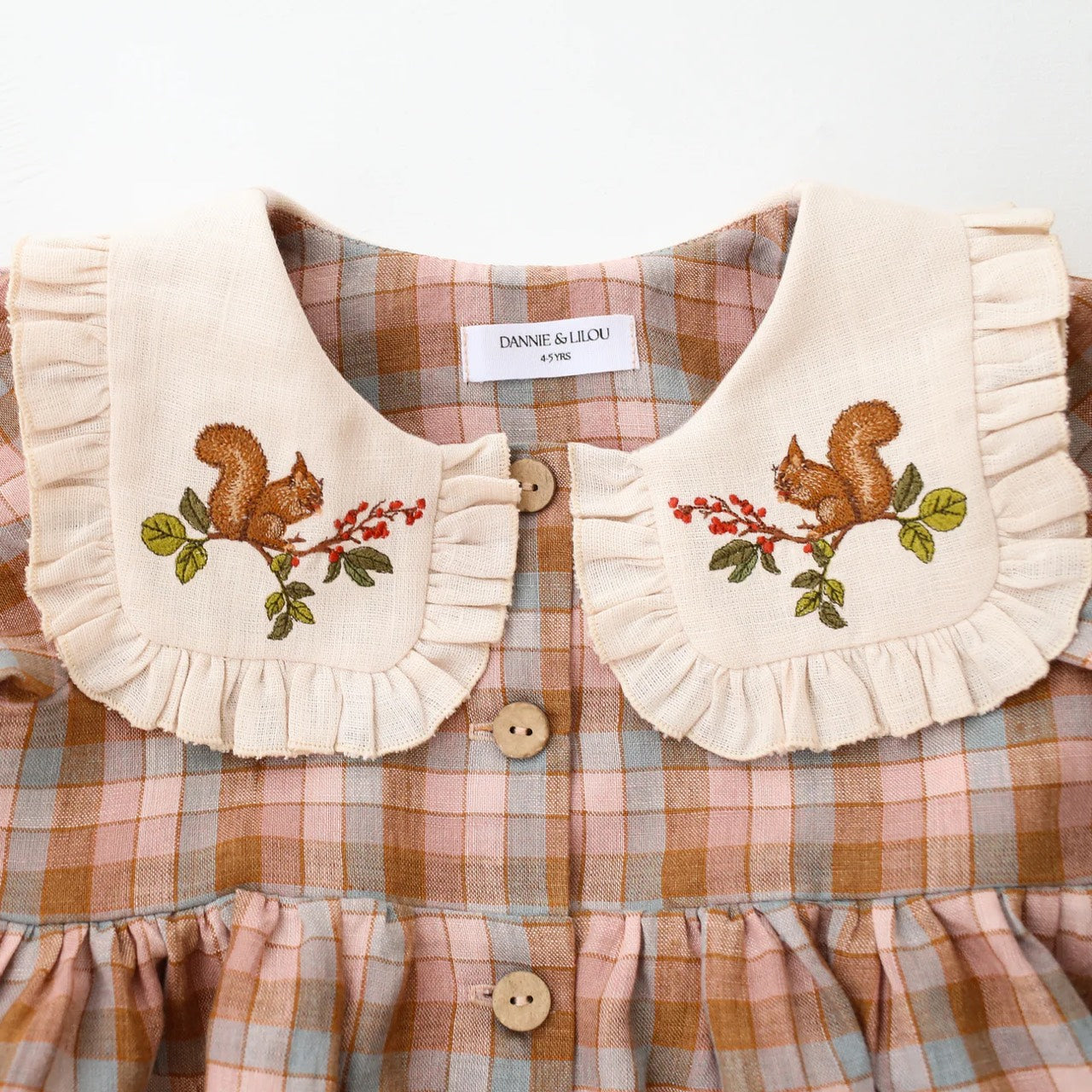 預購, 刺繡系列 Long Sleeve Dress with Square Collar 方領荷葉邊長袖排扣洋裝 6m-10y 多色可選 (領片可另選顏色,刺繡請選小圖)(主圖色:Mulberry Fern Check 桑莓蕨葉格紋 與 Latte 拿鐵, 刺繡:Cottage Bouquet 田園花束)