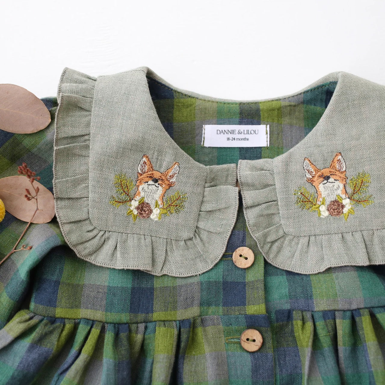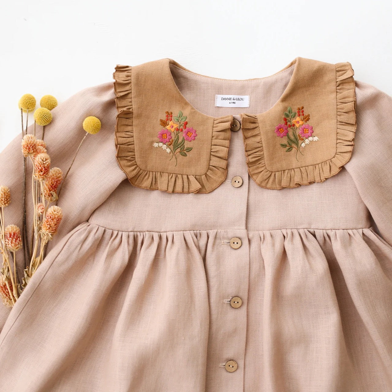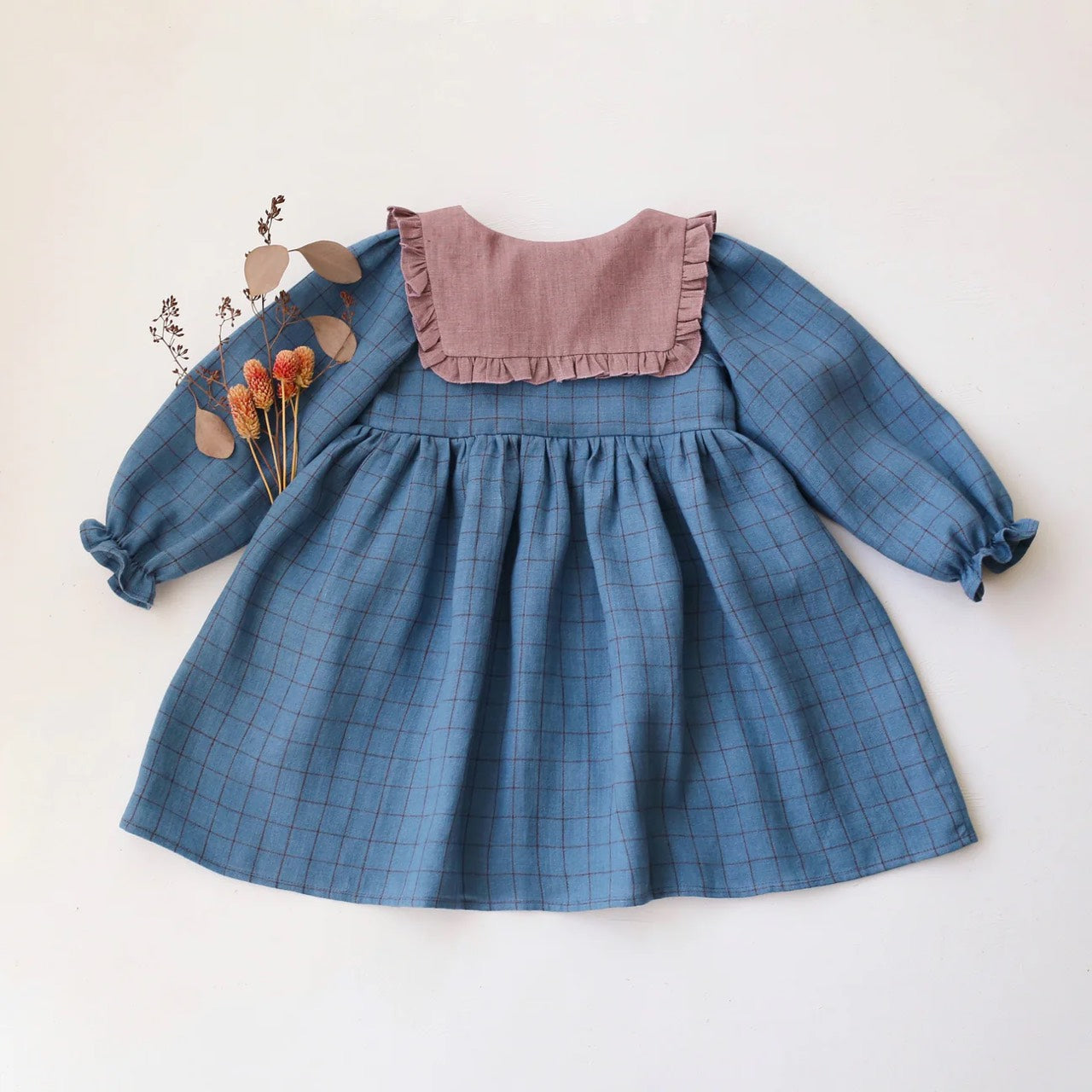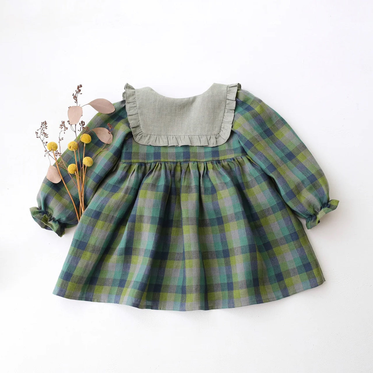 預購, 刺繡系列 Long Sleeve Dress with Square Collar 方領荷葉邊長袖排扣洋裝 6m-10y 多色可選 (領片可另選顏色,刺繡請選小圖)(主圖色:Mulberry Fern Check 桑莓蕨葉格紋 與 Latte 拿鐵, 刺繡:Cottage Bouquet 田園花束)