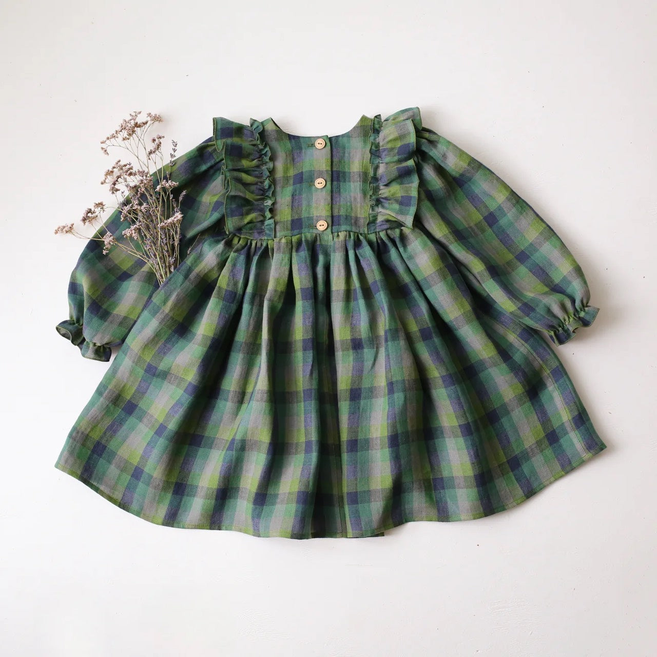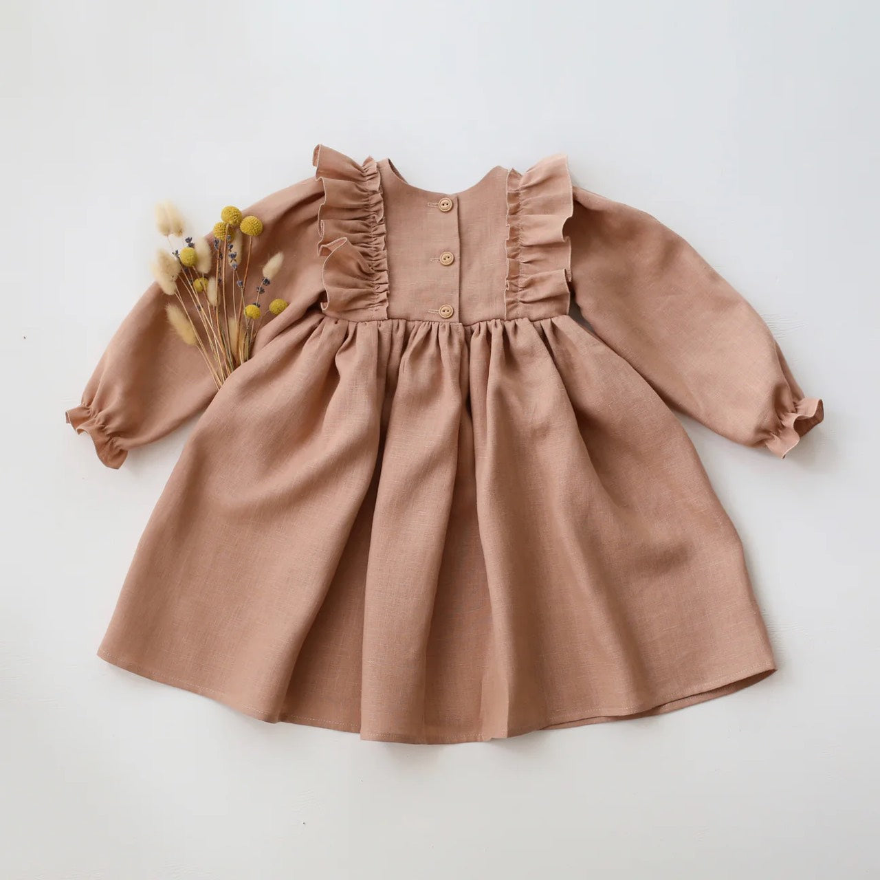 Beautiful dress with a wide bodice ruffle, gathered sleeves with frills details, gathered skirt and wooden buttons at the back.