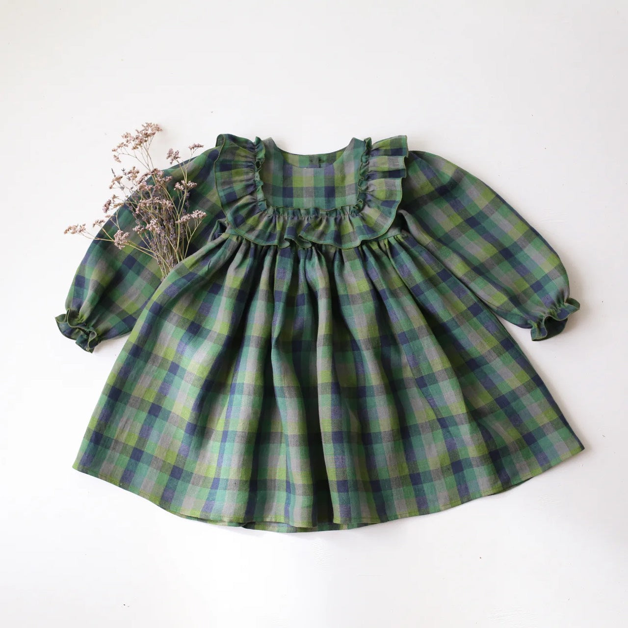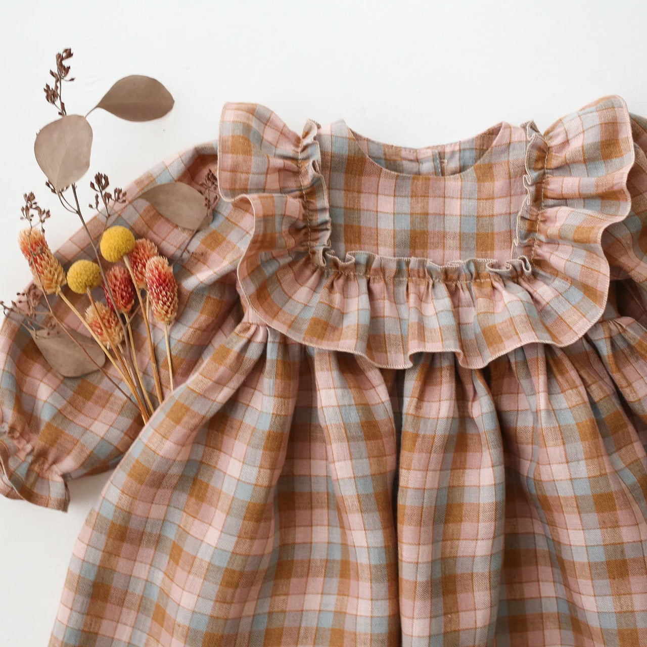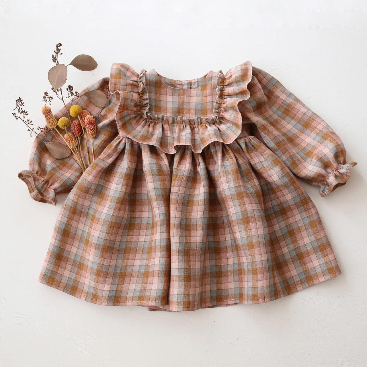 漂亮的連身裙,衣身寬大荷葉邊,褶皺袖子飾有褶邊細節,褶皺裙子,背面有木紐扣。是陪伴孩子成長值得購入的款式。帶給你和孩子最甜美四季的必備款式。
