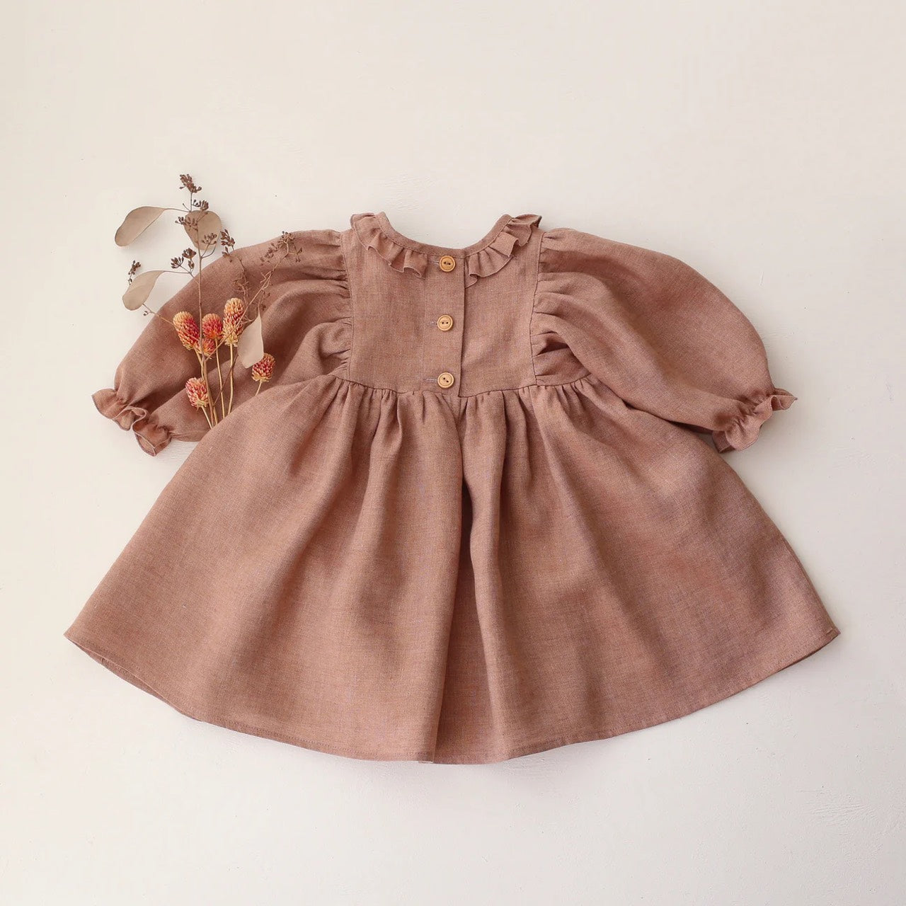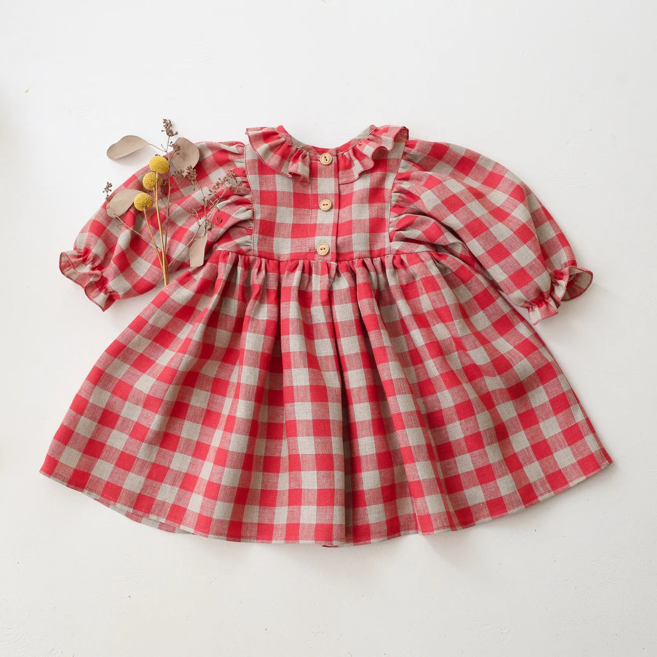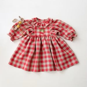 漂亮的連身裙,荷葉邊領、 泡泡袖,背面有木製鈕扣。是陪伴孩子成長值得購入的款式。帶給你和孩子最甜美四季的必備款式。
