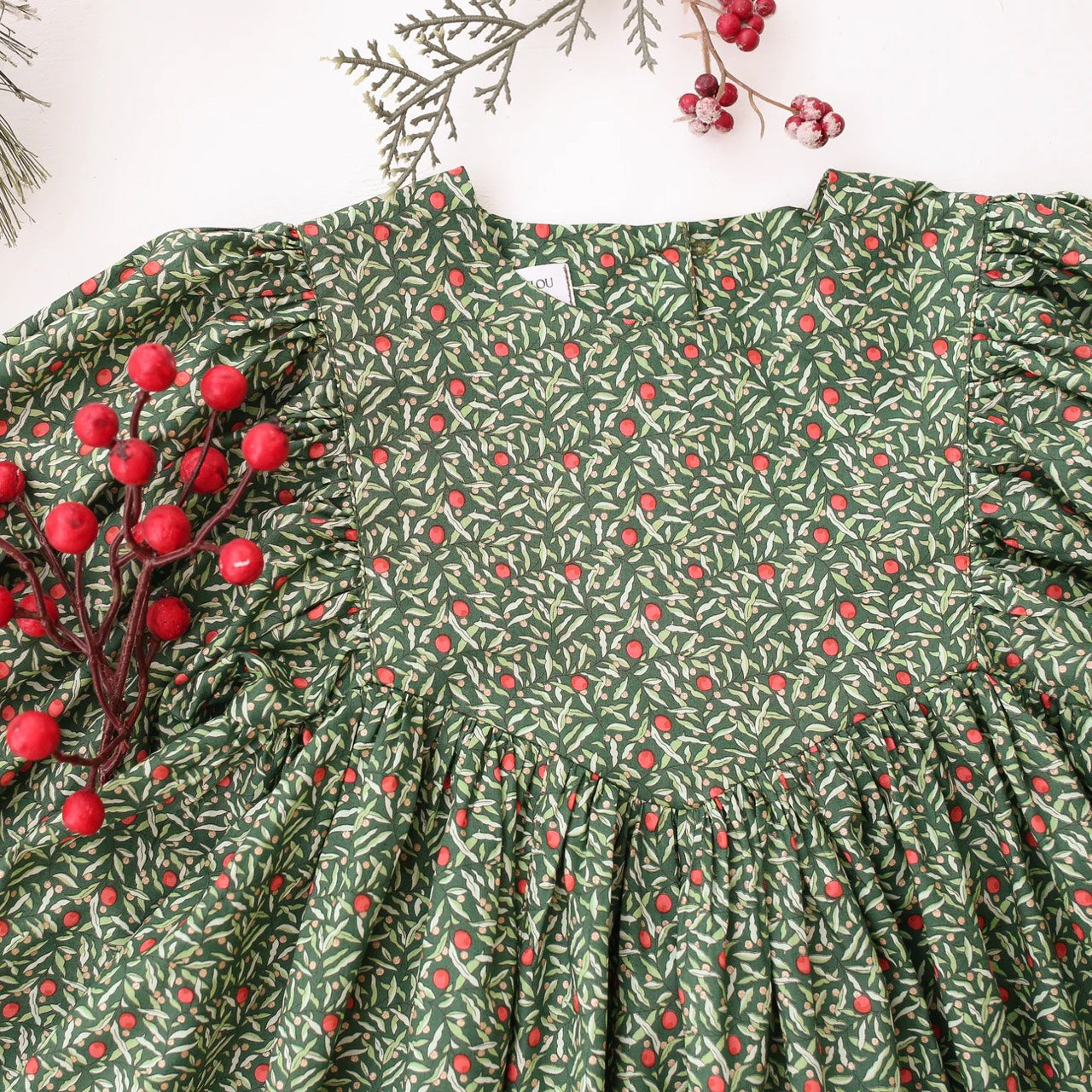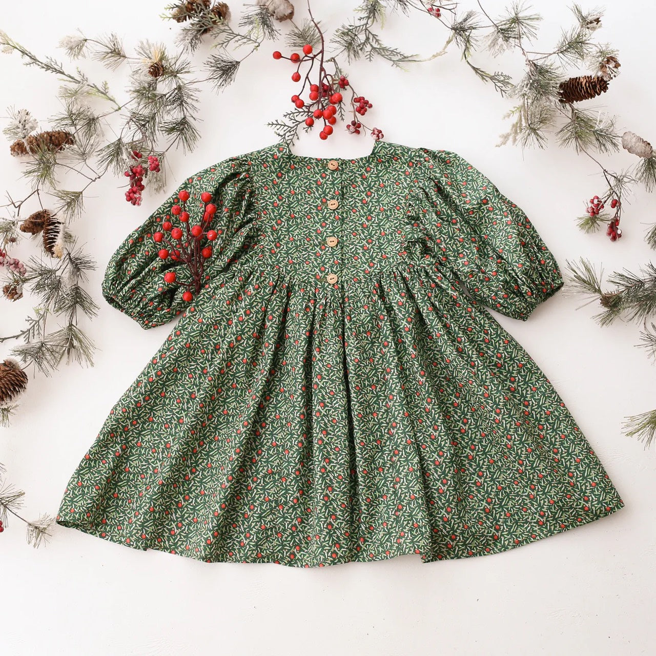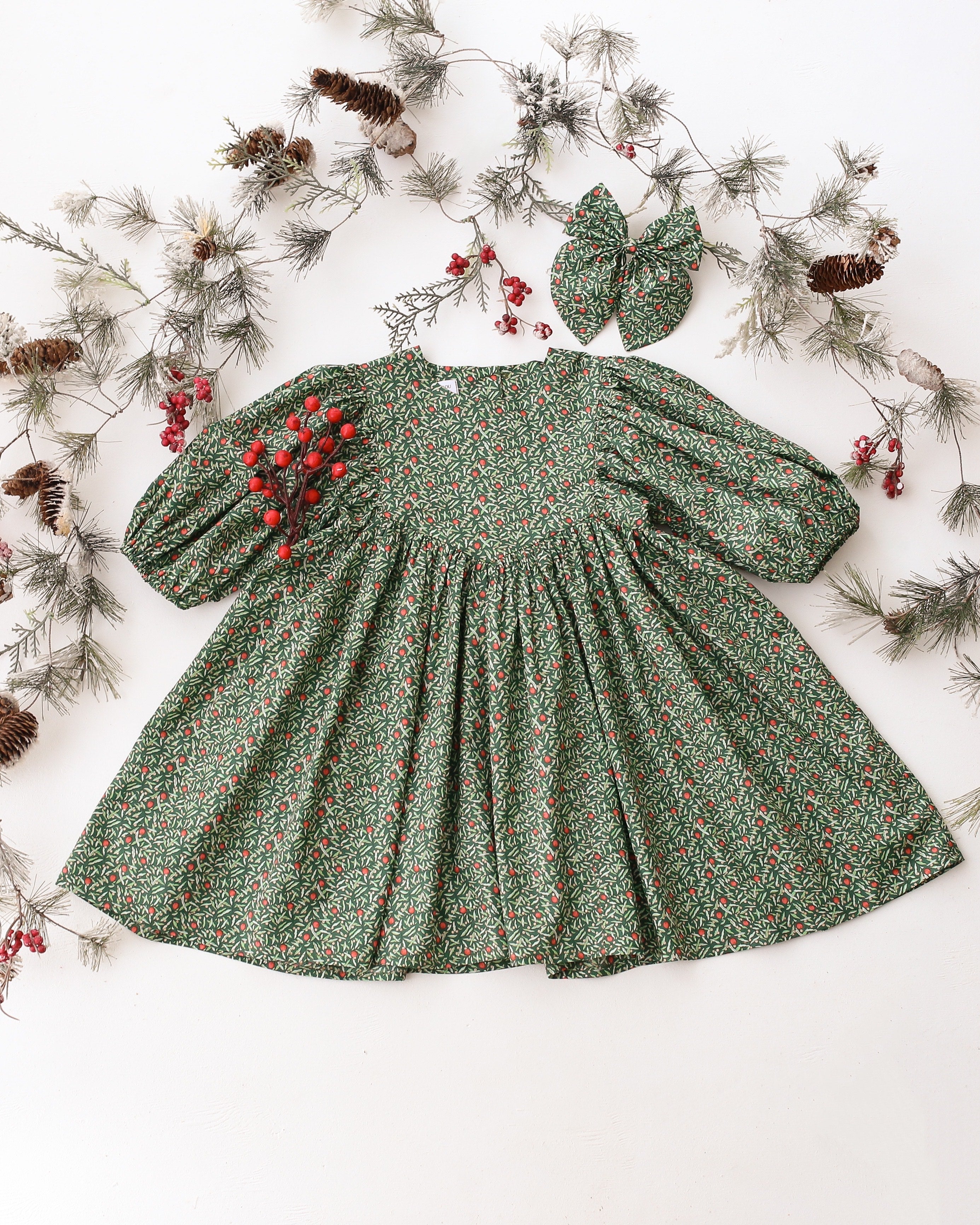 漂亮的連身裙,採用鬆緊泡泡袖,前後 V 形衣身,背面有木紐扣和褶皺裙擺。