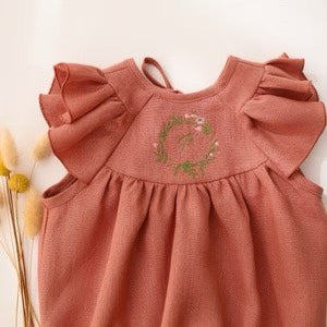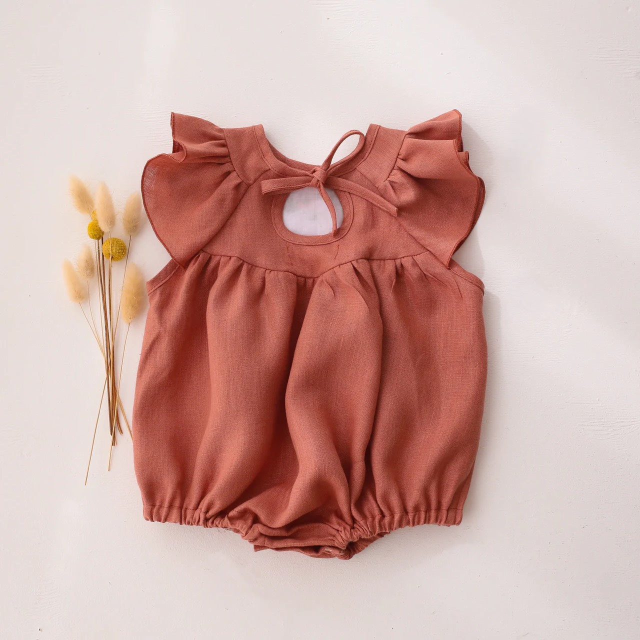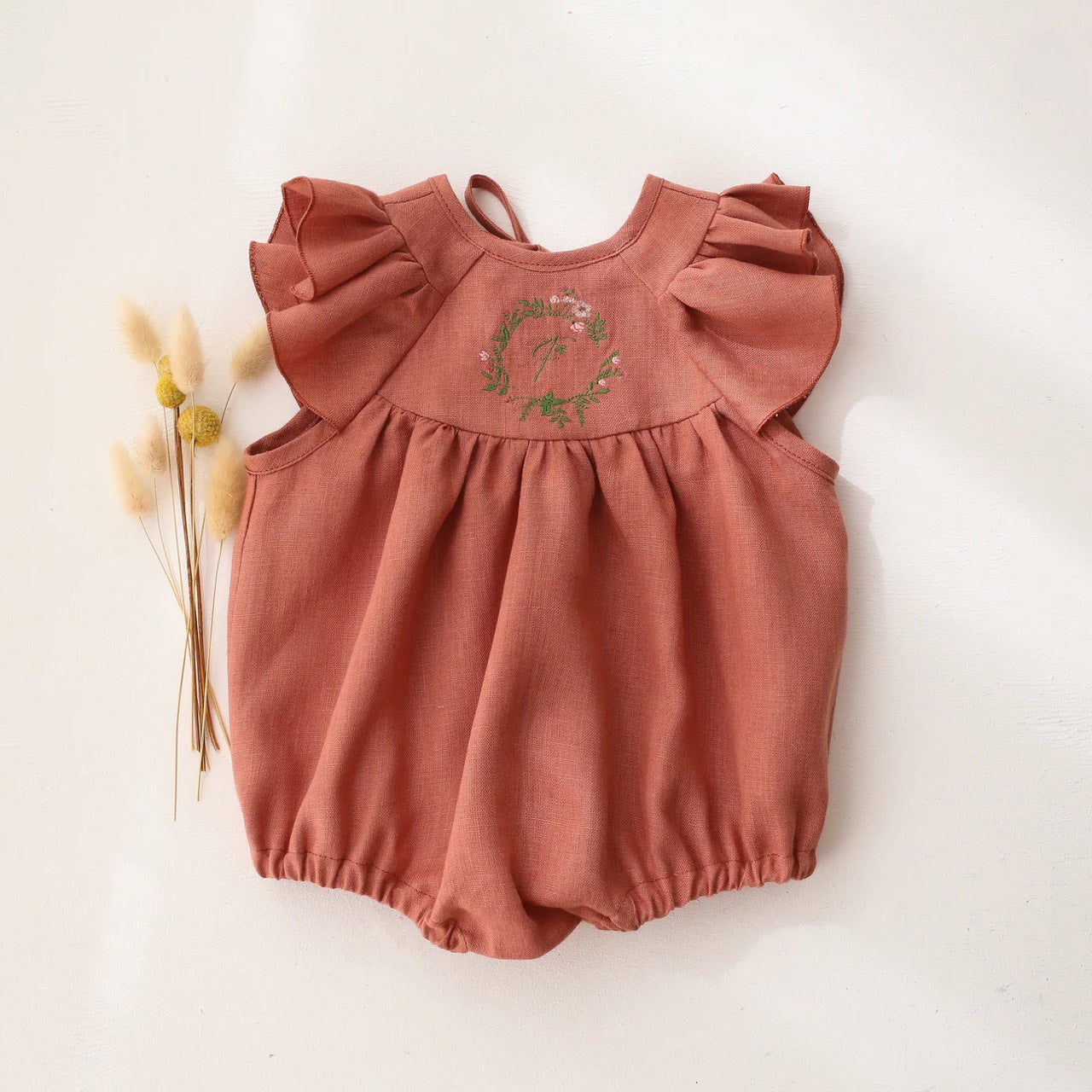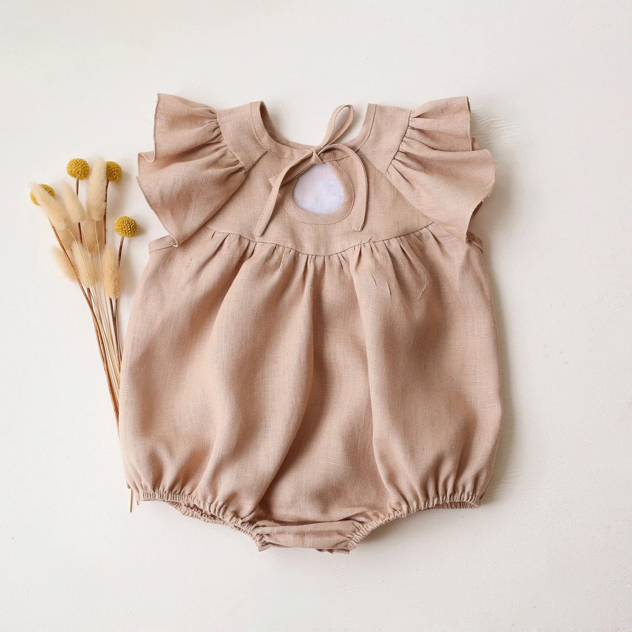 預購, 刺繡系列 Flutter Sleeve Tie Back Bubble Playsuit 亞麻飄逸袖後背繫帶泡泡連身包屁衣 0-4y 多色可選