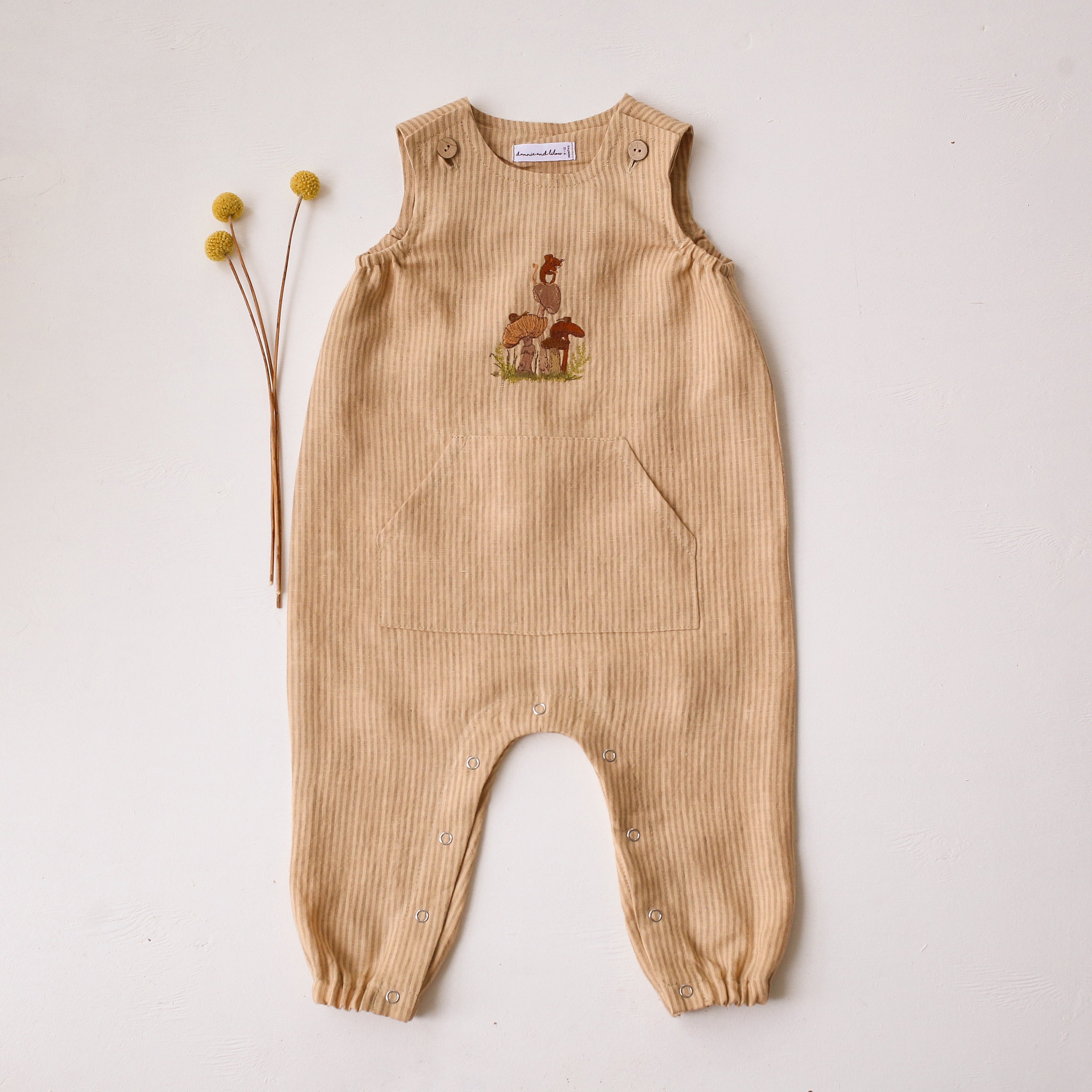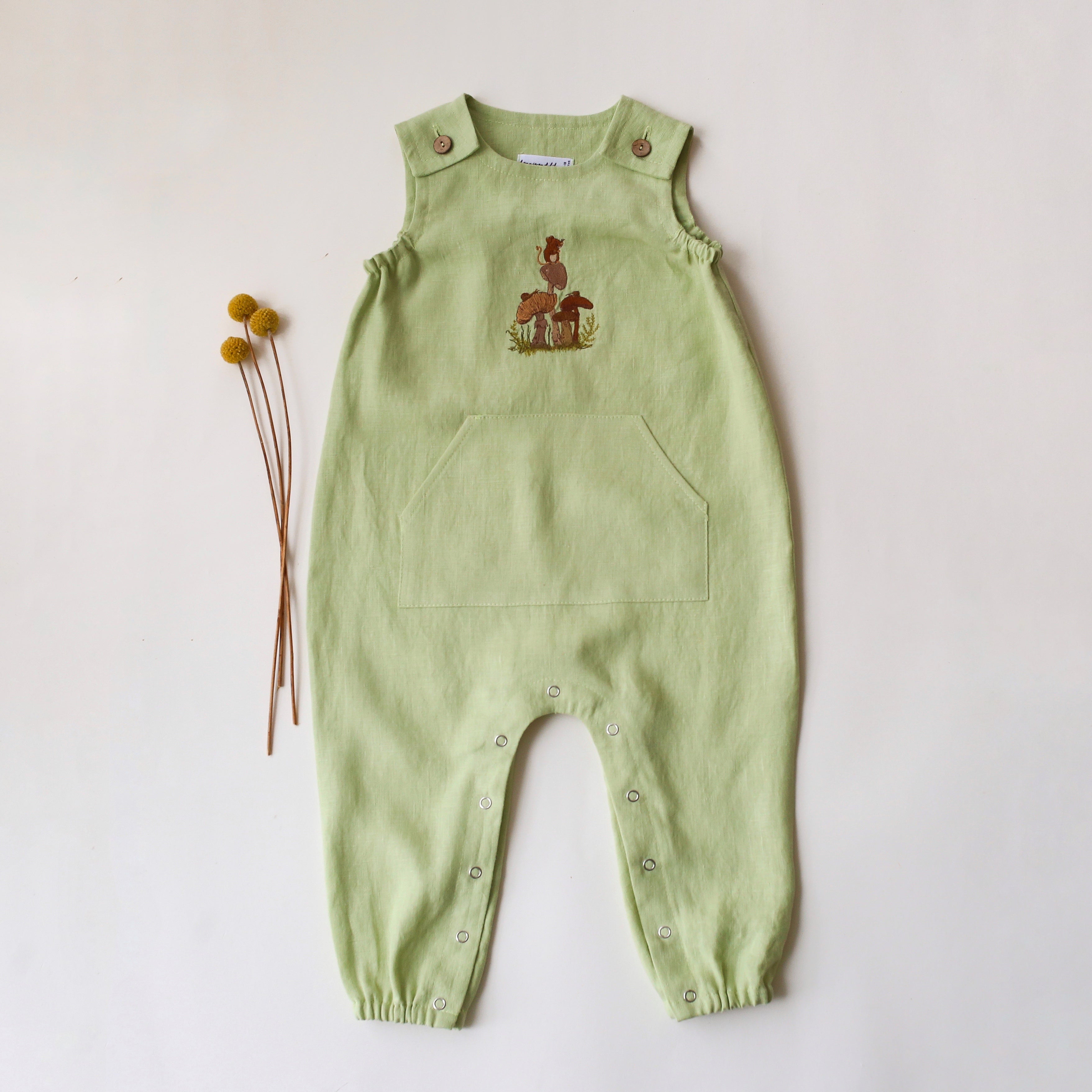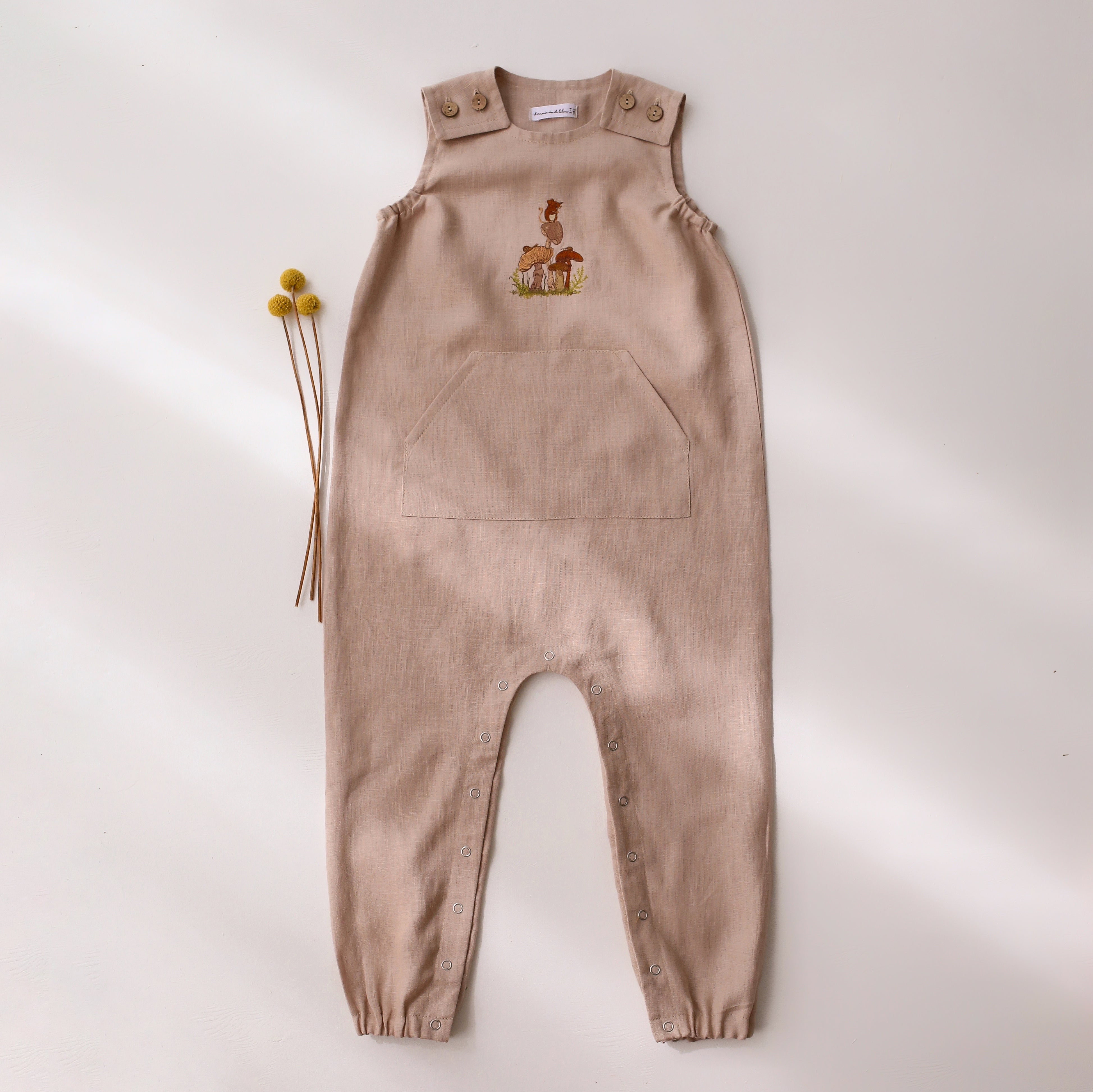 Gender neutral romper with a coconut buttons shoulder closure, front pocket, elasticated armholes and pants, snaps at the legs for easy changing.