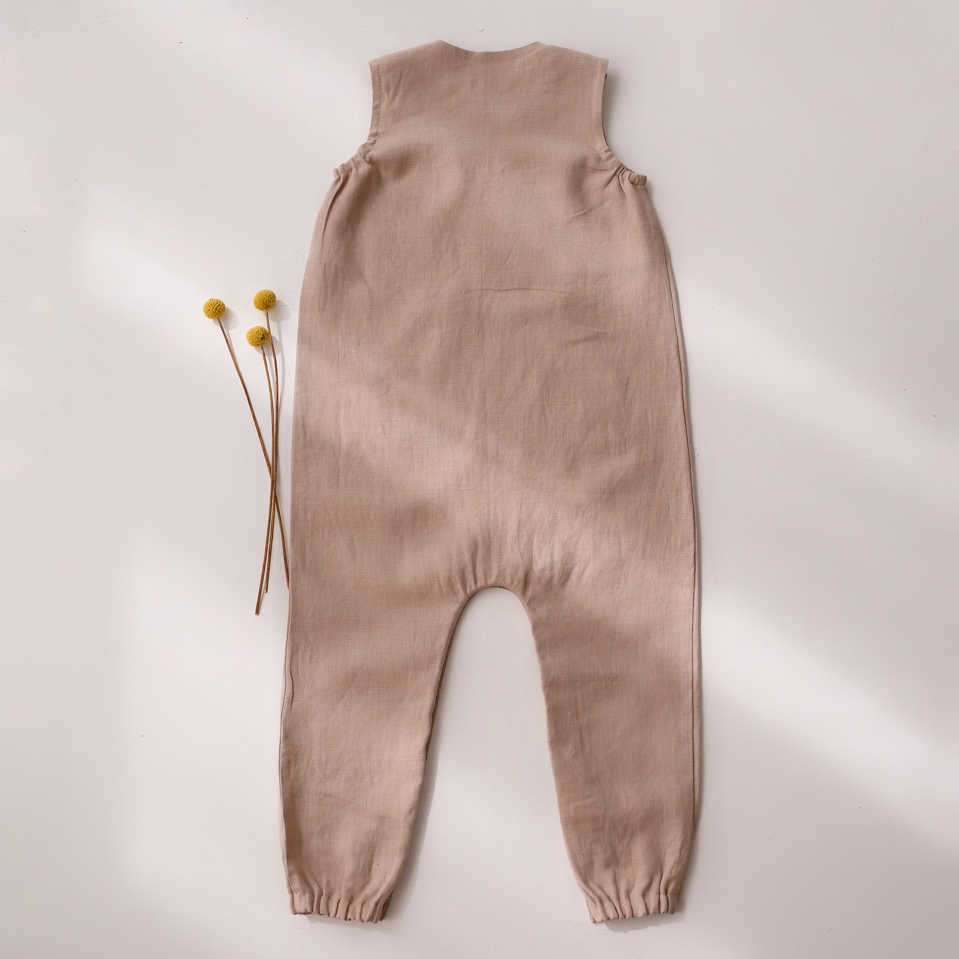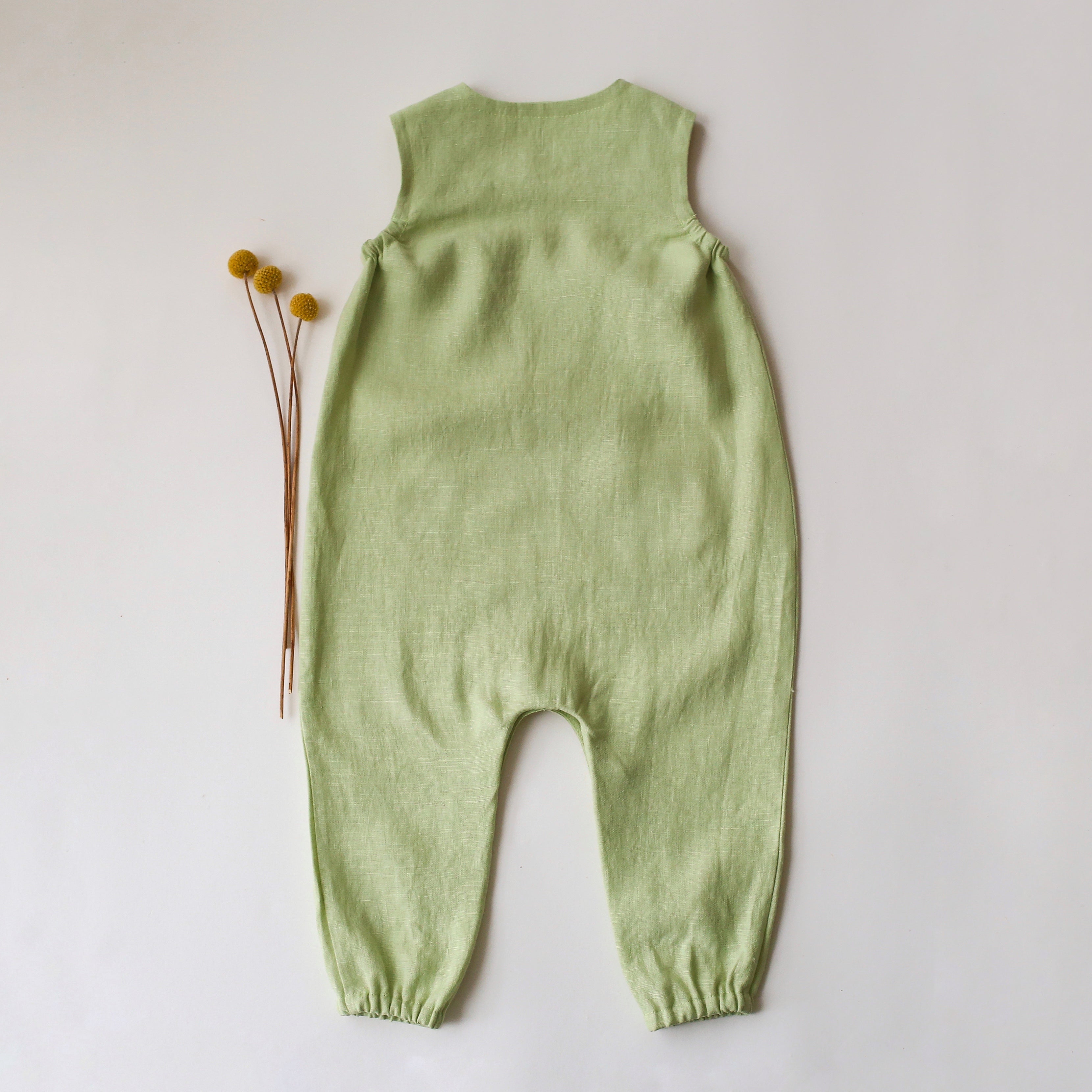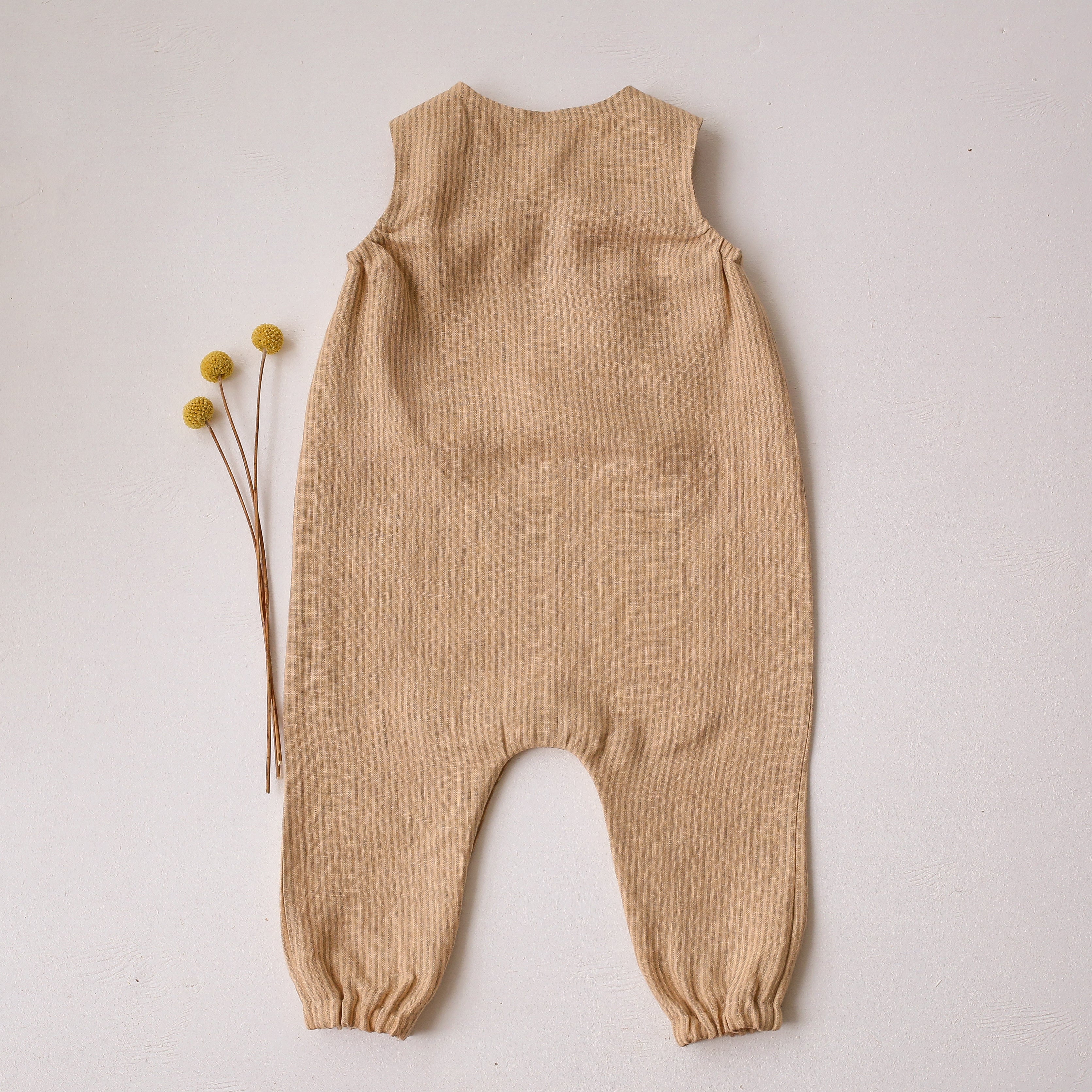 Gender neutral romper with a coconut buttons shoulder closure, front pocket, elasticated armholes and pants, snaps at the legs for easy changing.