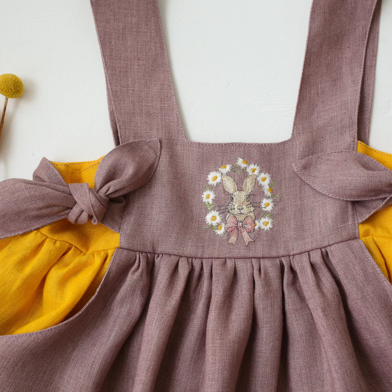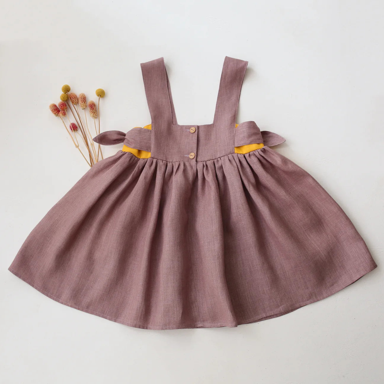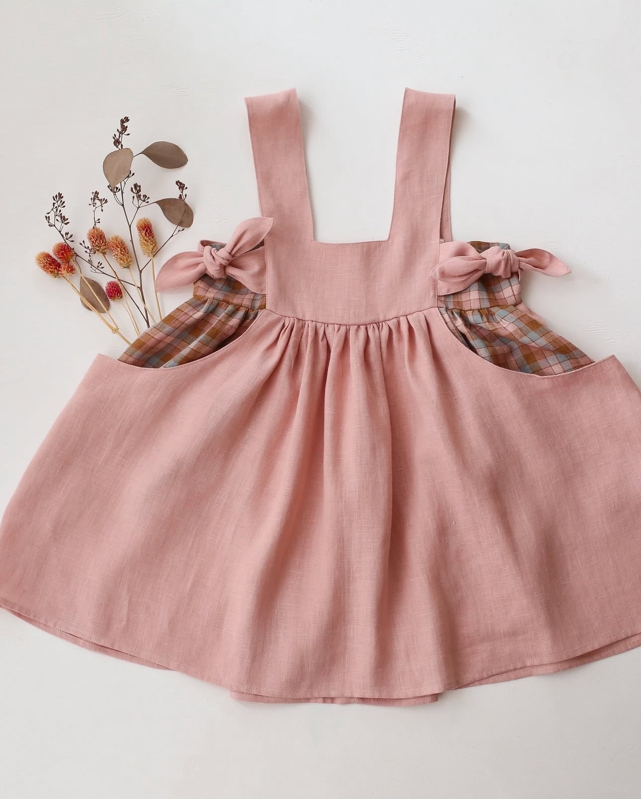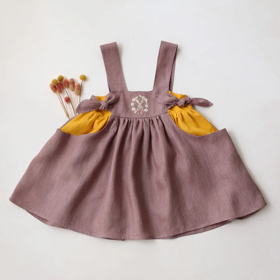 預購, 刺繡系列 Square Neckline Pinafore 側蝴蝶結吊帶圍裙口袋洋裝 18m-10y 多色可選 (口袋可另選顏色,刺繡請選小圖)