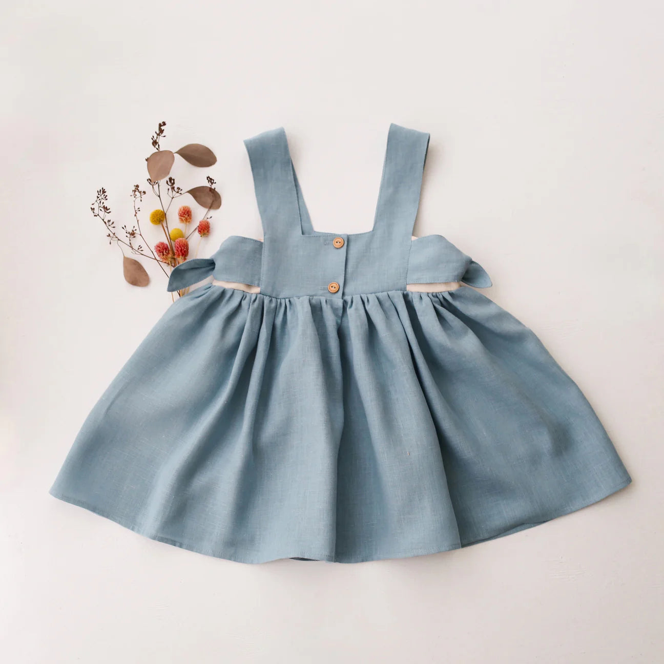 漂亮的連身裙,深方形領口,側結帶,後扣閉合,裙子長度標準。 是陪伴孩子成長值得購入的款式。帶給你和孩子最甜美四季的必備款式。