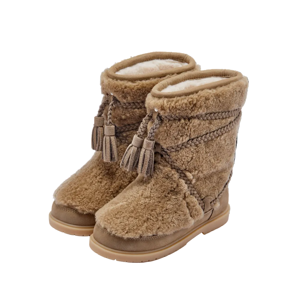 冬天必備的靴子!這款米白色襯裡和石棕色鞋面羊毛拼接、皮革編織帶裝飾的 Myril 靴子是寒冷天氣的最佳伴侶。舒適的套穿式設計和柔軟蓬鬆的羊毛內裡,讓這款靴子為您的每一次冬日冒險都帶來溫暖和時尚。