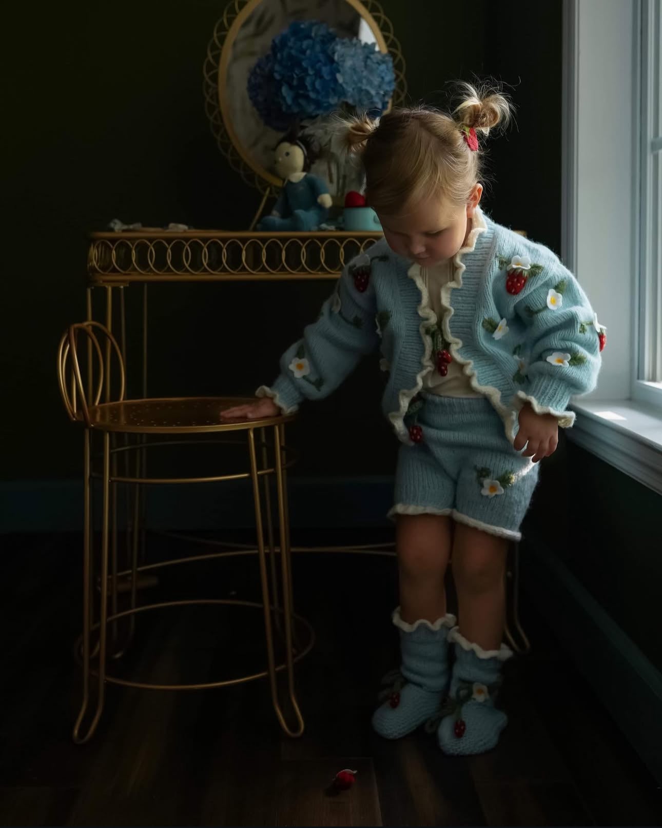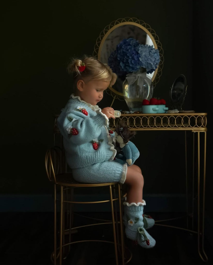 OliviMilly, Strawberries Booties | Blue 草莓嬰兒針織造型襪 柔和藍 0-2y