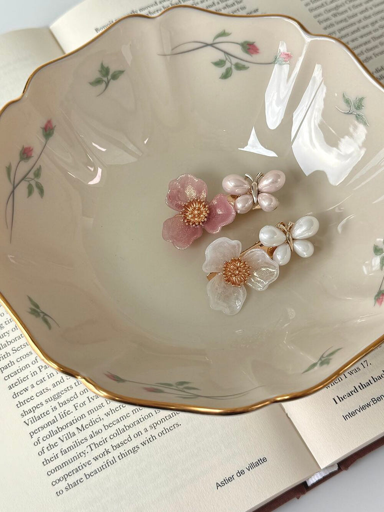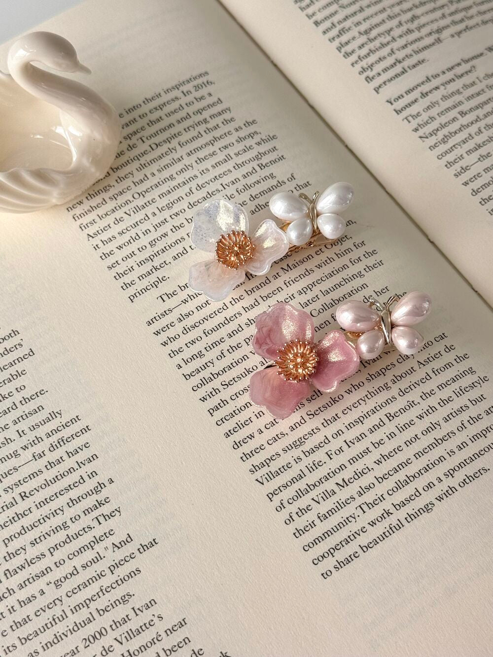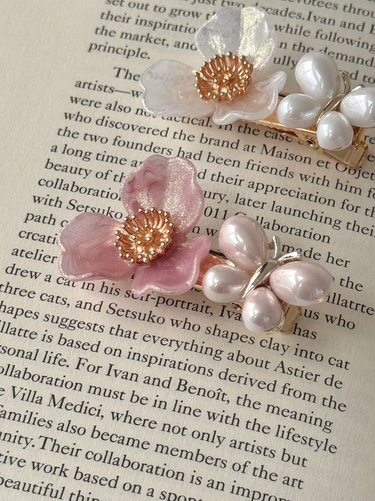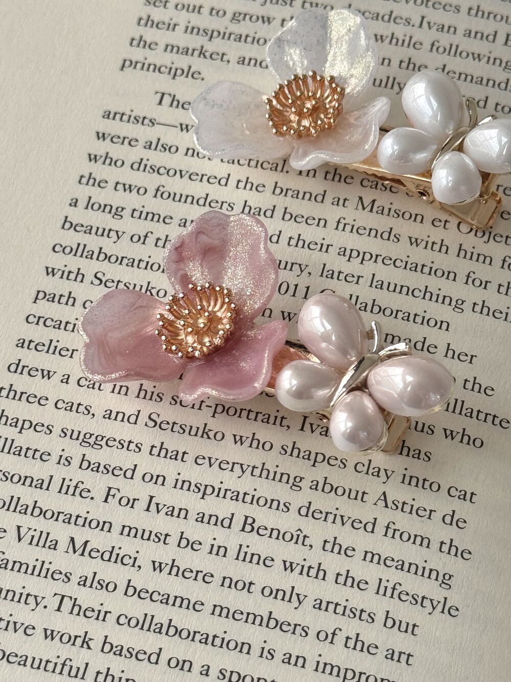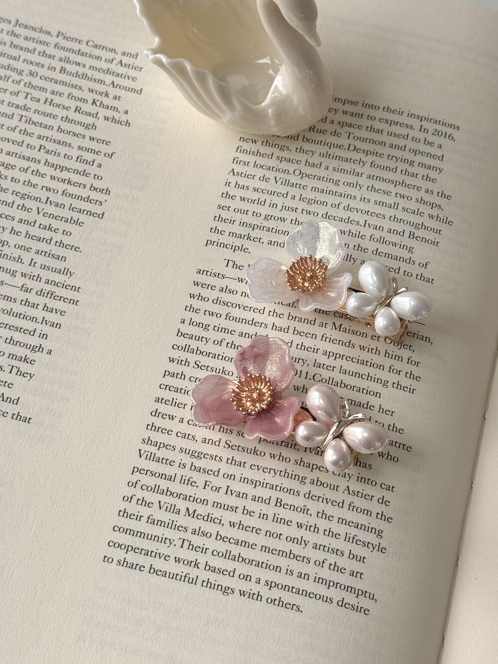 白透明與粉花朵宛如春日綻放,中央金色花蕊閃爍微光,與光澤花瓣的優雅相互呼應!珍珠蝴蝶小巧卻奪目,非常精緻的獨家設計款,無論是自然披髮還是編髮點綴,都能為您與寶貝的髮間增添一抹精緻與高雅,也能是上學、外出遊玩,還是生日派對,都能為造型加分,留下最可愛的笑容 。