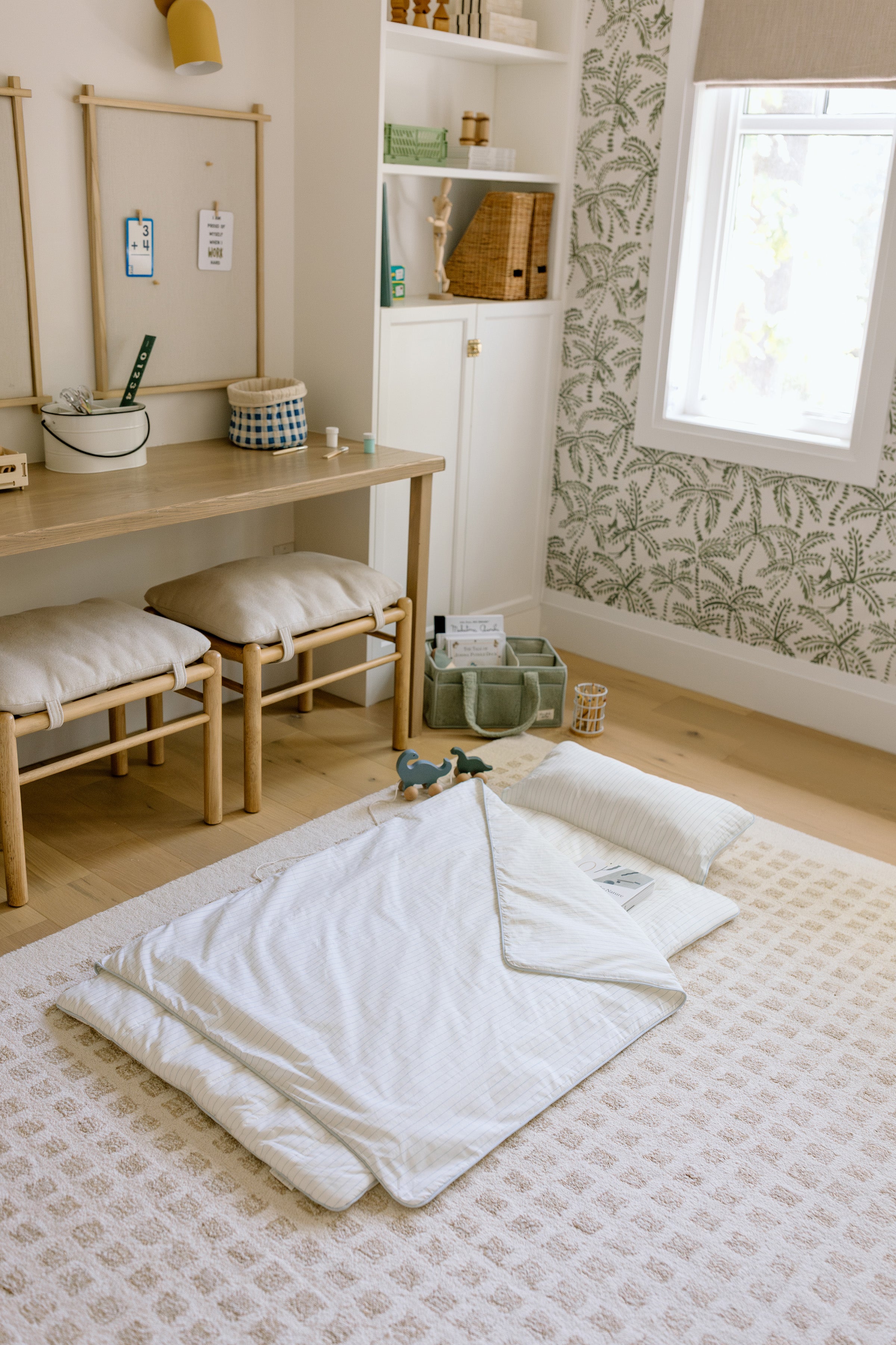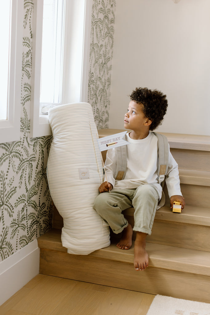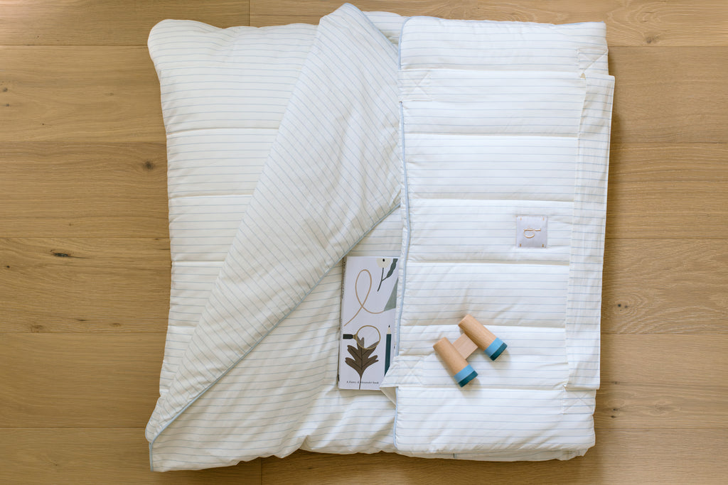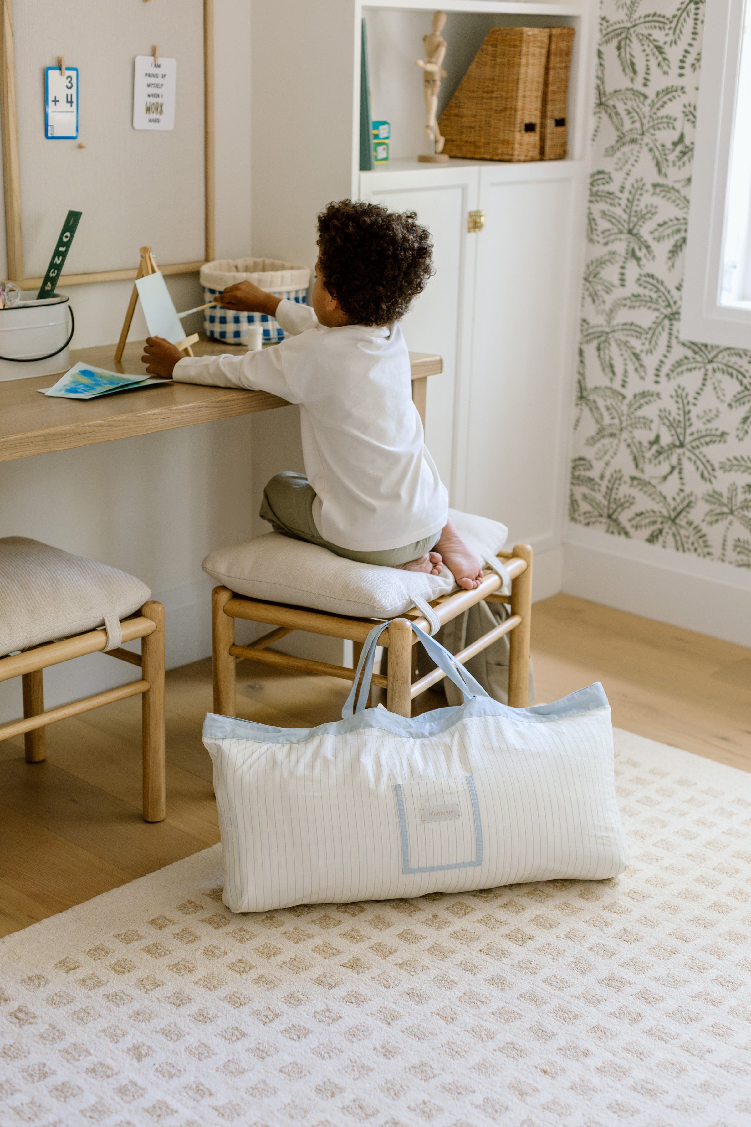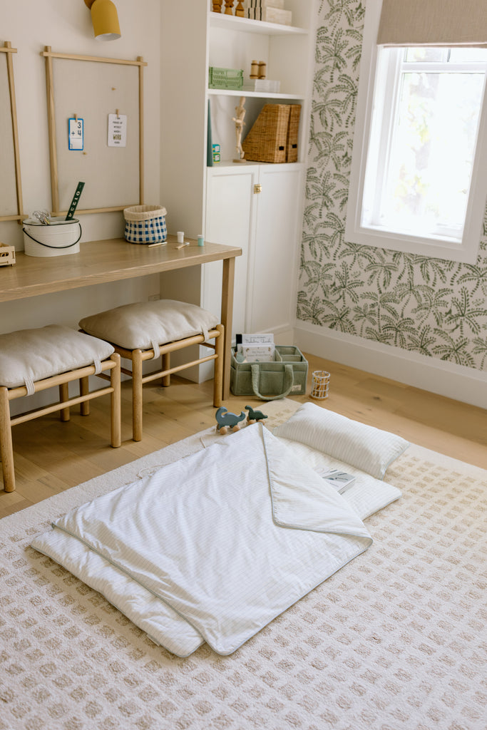 The XL Organic Cotton Nap Mat is designed for toddlers who need a little more room to stretch, roll, and rest comfortably. Over 4 inches wider and 3 inches longer than our original mat, it offers extra space—while still remaining compact and easy to roll for everyday use.