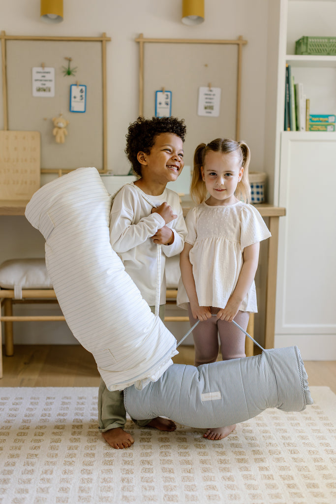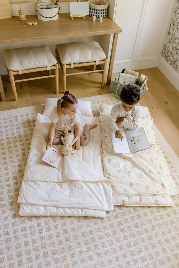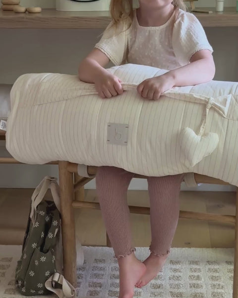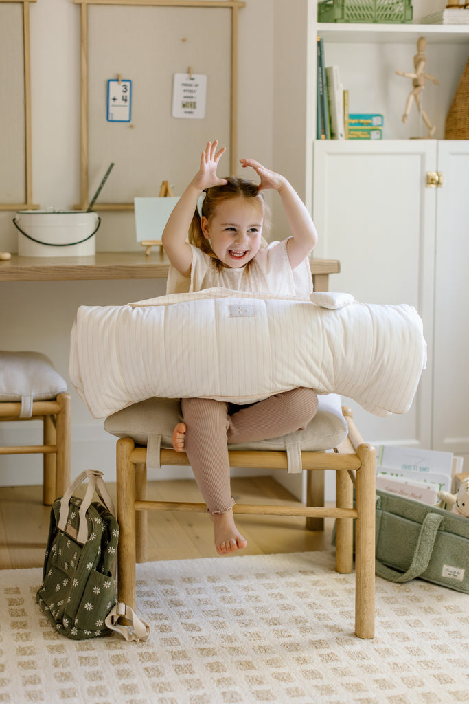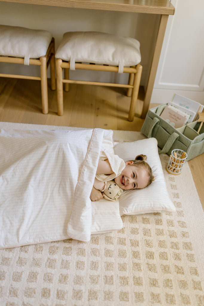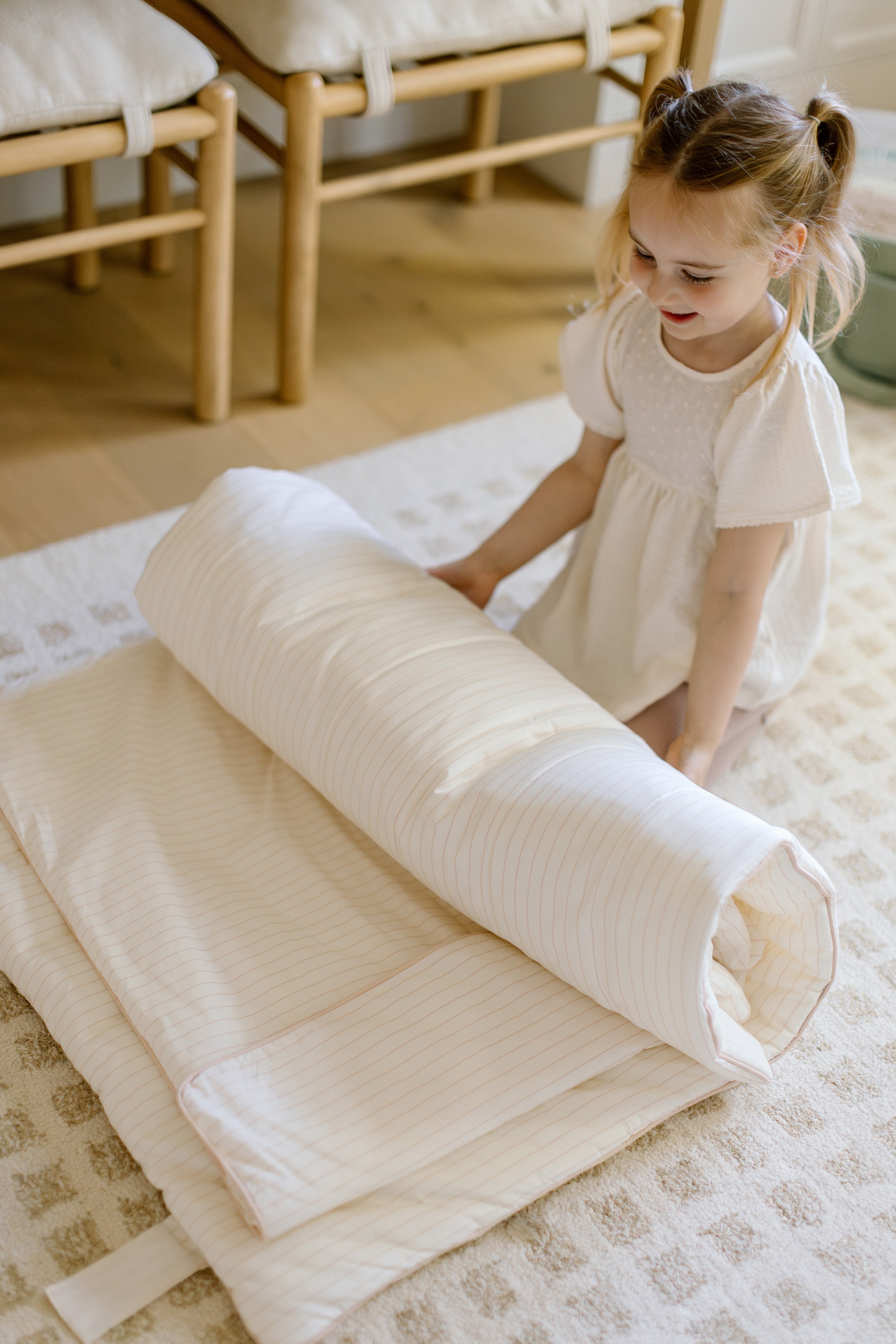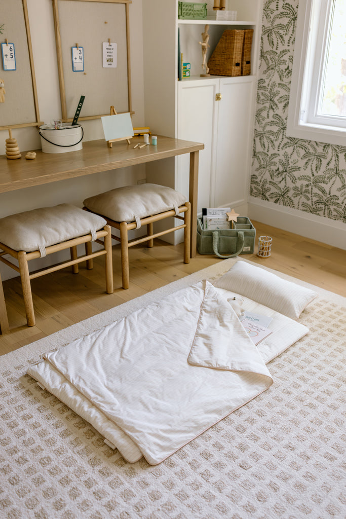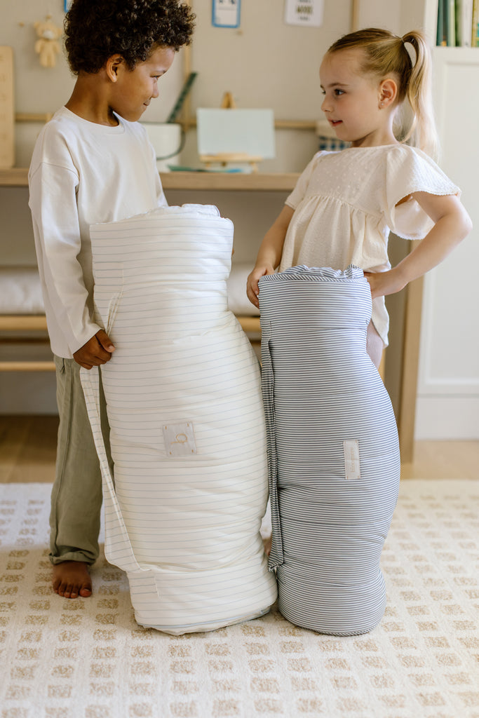 The XL Organic Cotton Nap Mat is designed for toddlers who need a little more room to stretch, roll, and rest comfortably. Over 4 inches wider and 3 inches longer than our original mat, it offers extra space—while still remaining compact and easy to roll for everyday use.