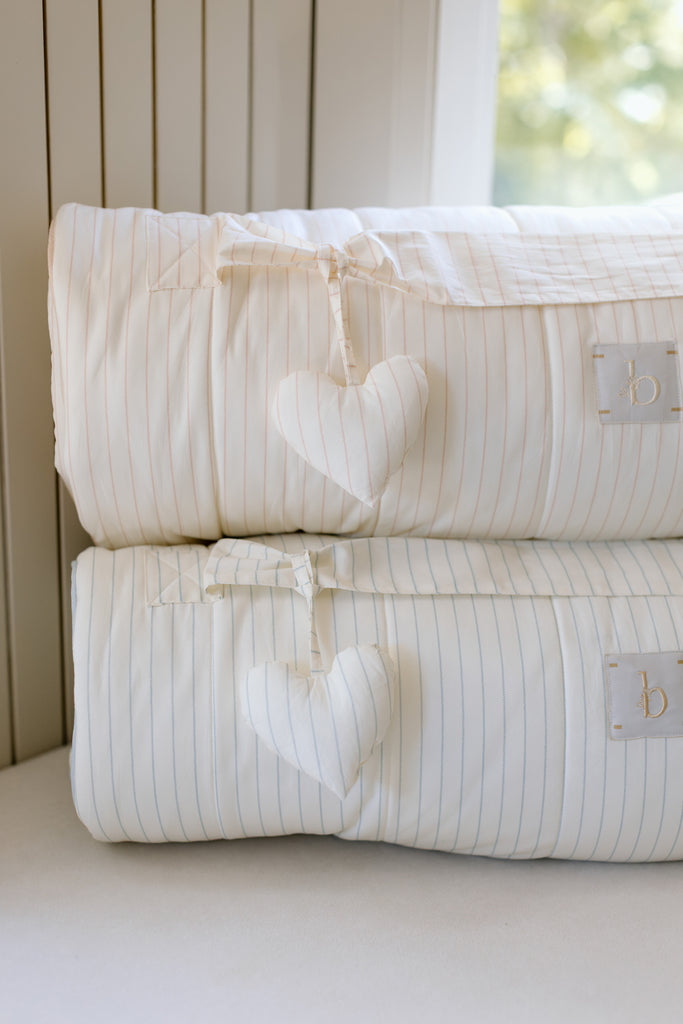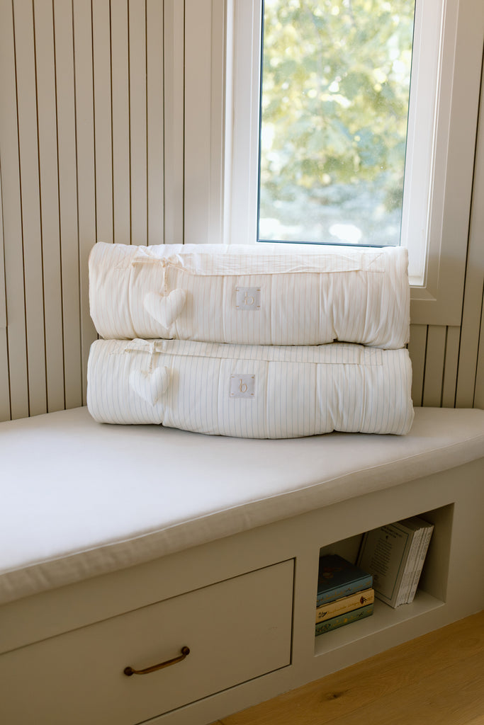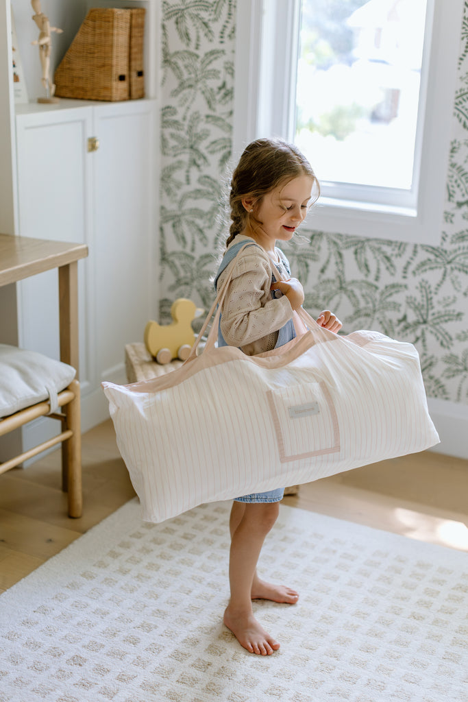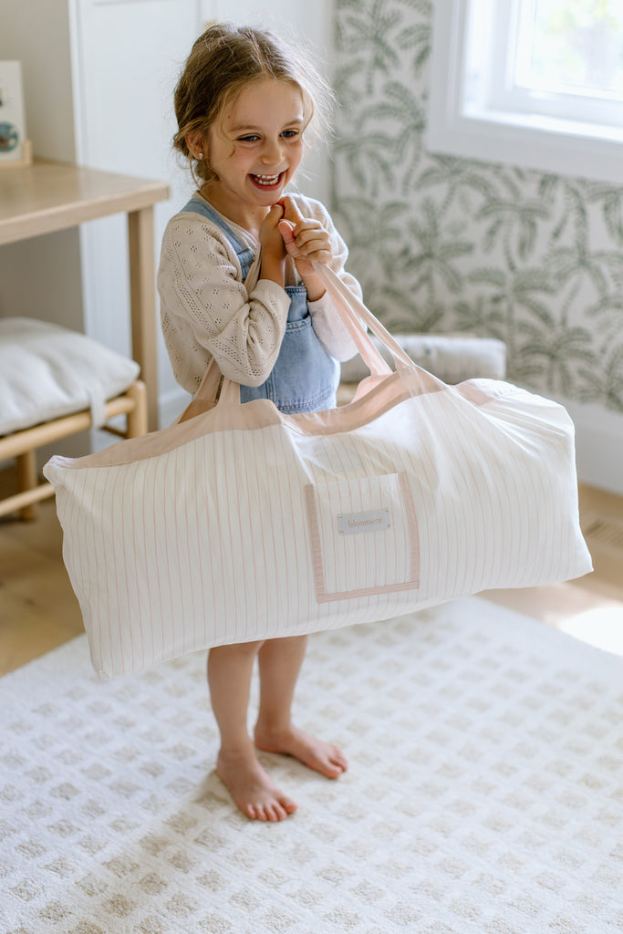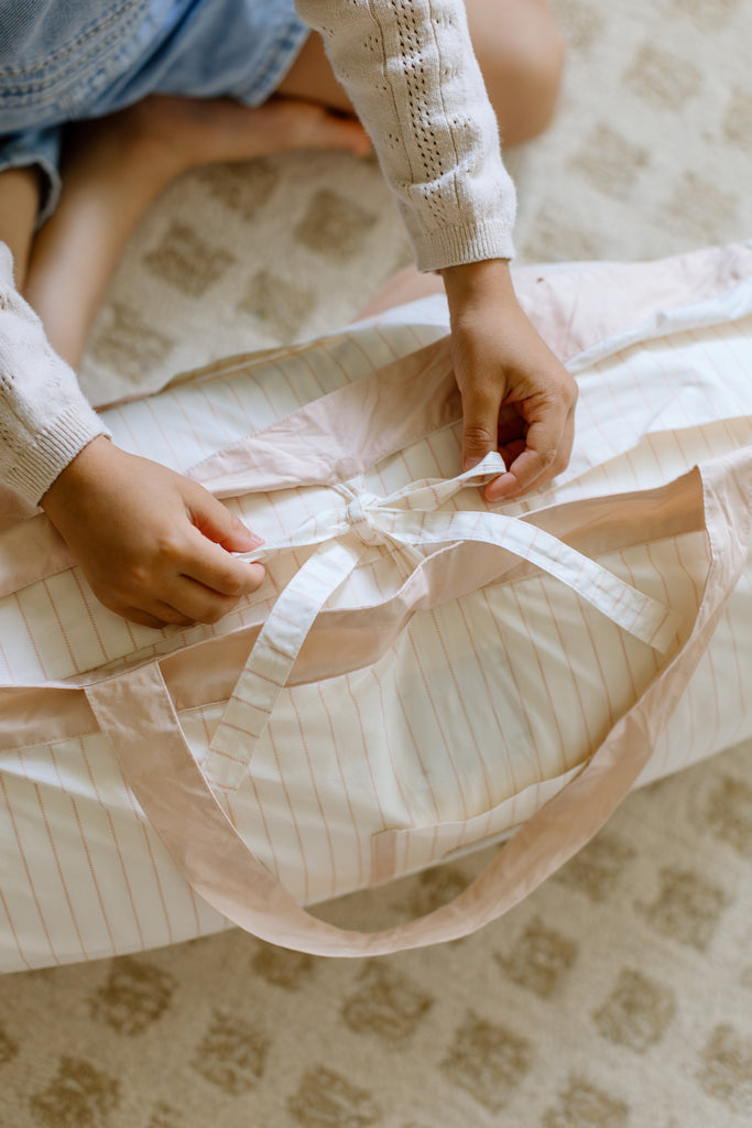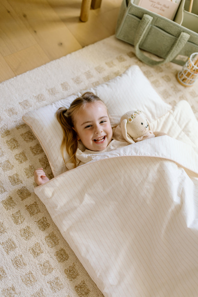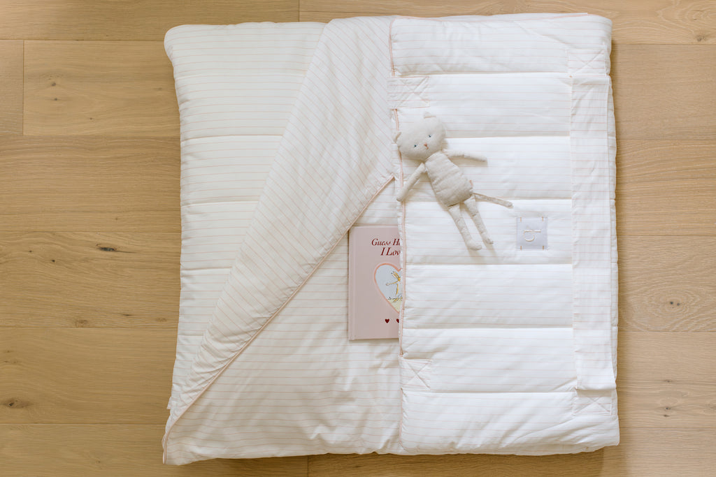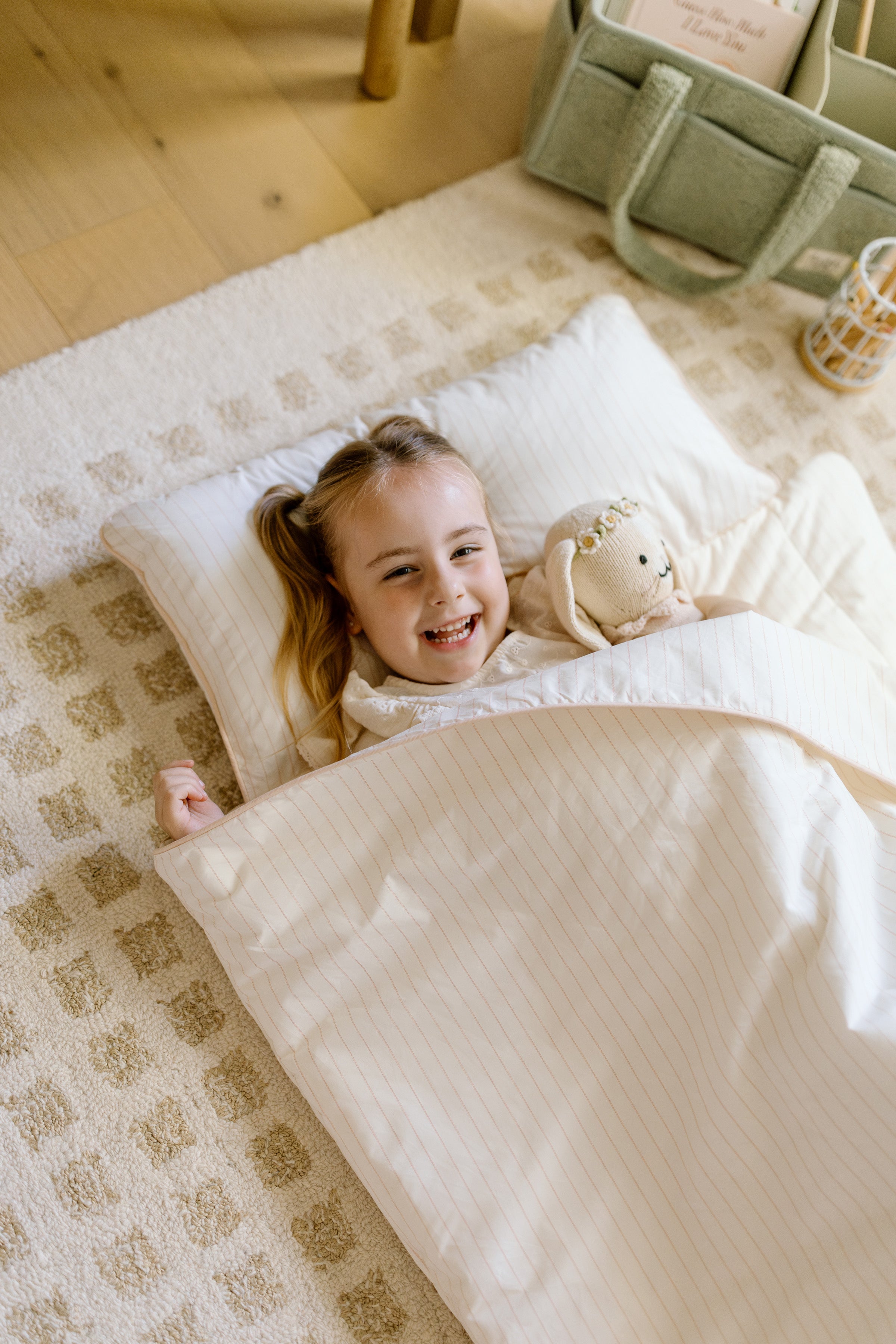 The XL Organic Cotton Nap Mat is designed for toddlers who need a little more room to stretch, roll, and rest comfortably. Over 4 inches wider and 3 inches longer than our original mat, it offers extra space—while still remaining compact and easy to roll for everyday use.