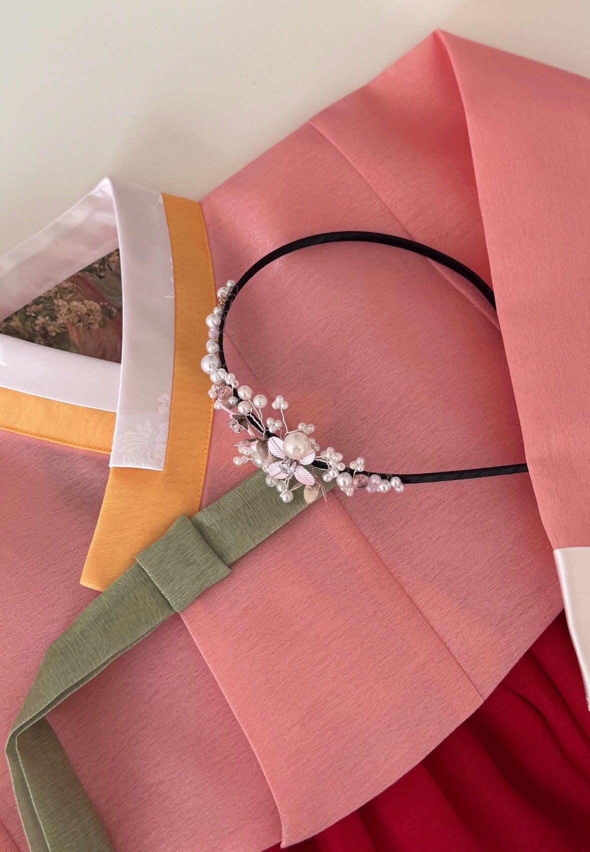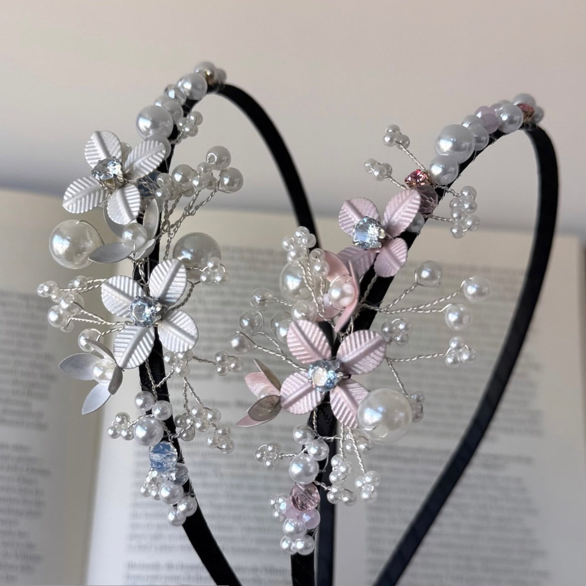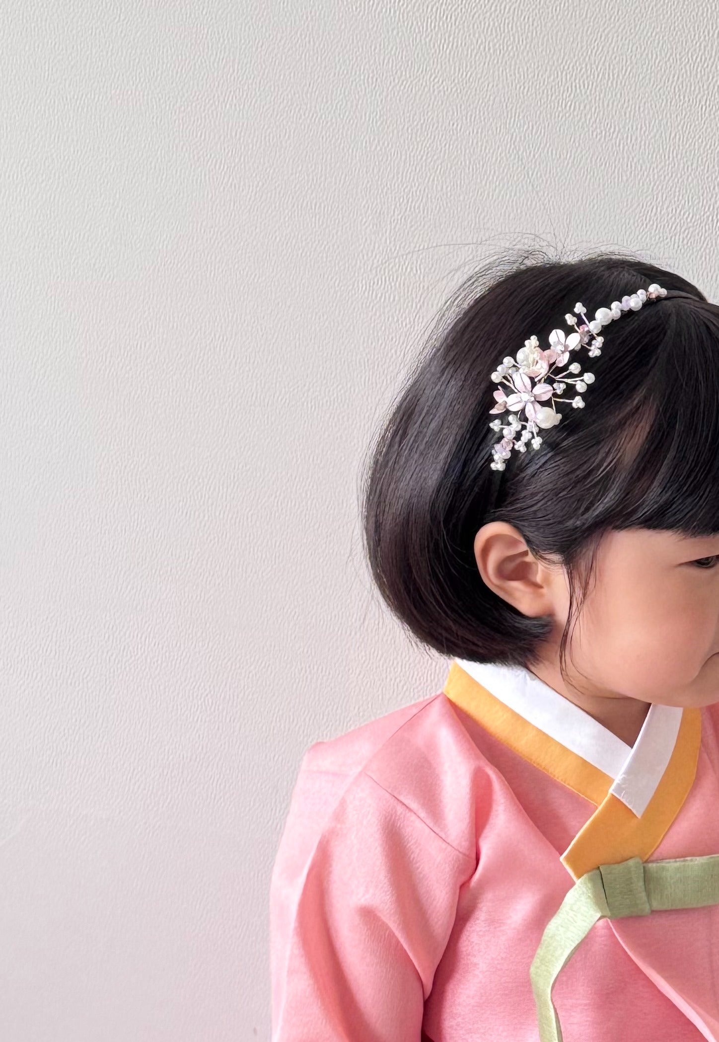 這組髮箍非常優雅且富有層次感,手作珍珠花卉髮箍,真的是藏不住的仙氣!銀白色與淡粉色的金屬花瓣交織,點綴著透亮的鑽石與大小錯落的潤澤珍珠,每一處細節都在閃閃發光。無論是韓服還是洋裝,也適合在日常生活中想體驗公主的精緻浪漫感,都能瞬間點亮妳和寶貝的整體造型!