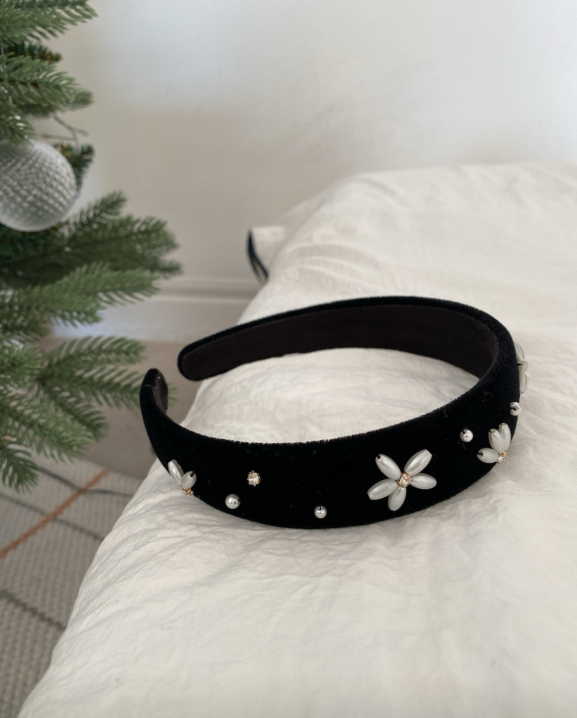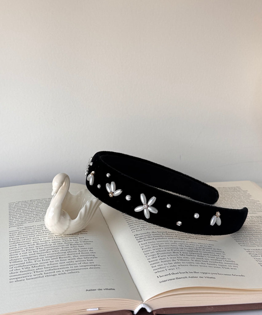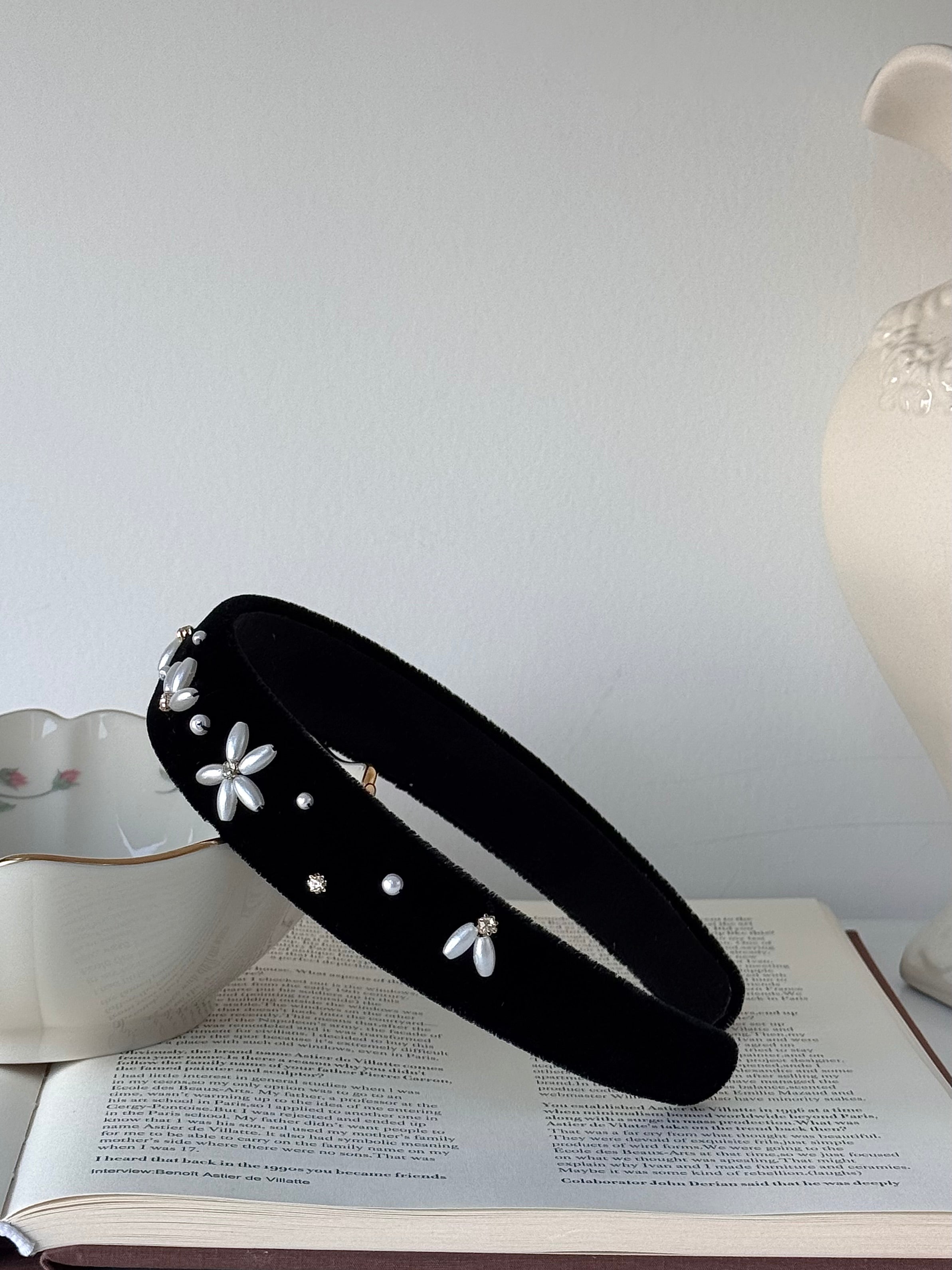質感天鵝絨串珠花髮箍, 一顆顆珍珠珠子被繡成圖案,一款以天鵝絨髮帶製成的特別飾品可以搭配任何造型,它帶有防滑墊,能讓髮箍不易滑落的貼心設計。細膩的手工串珍珠刺繡工藝,栩栩如生,每一針一線都展現出職人的用心與巧思。散發著低調而奢華的魅力。