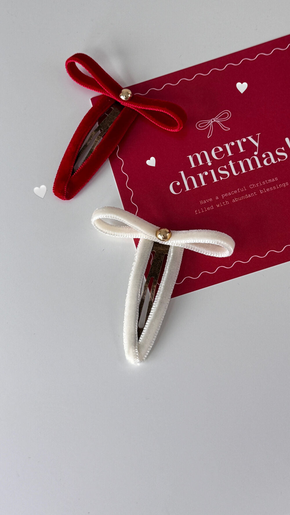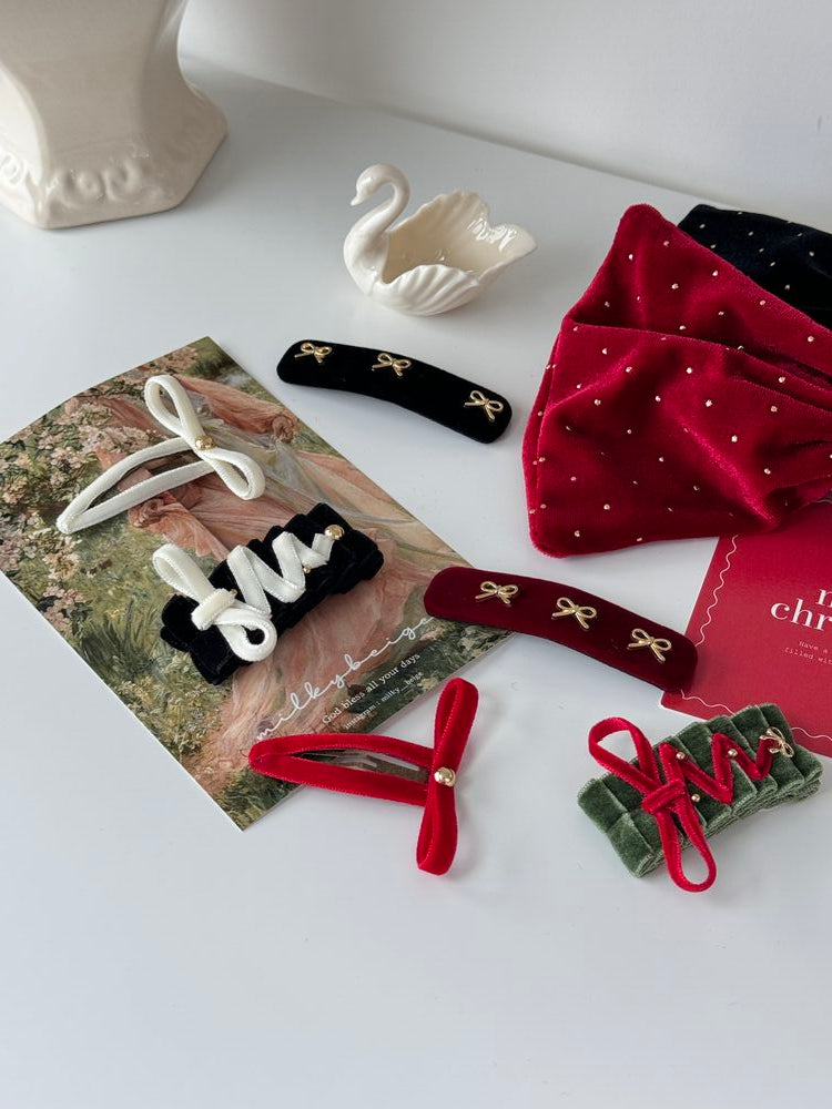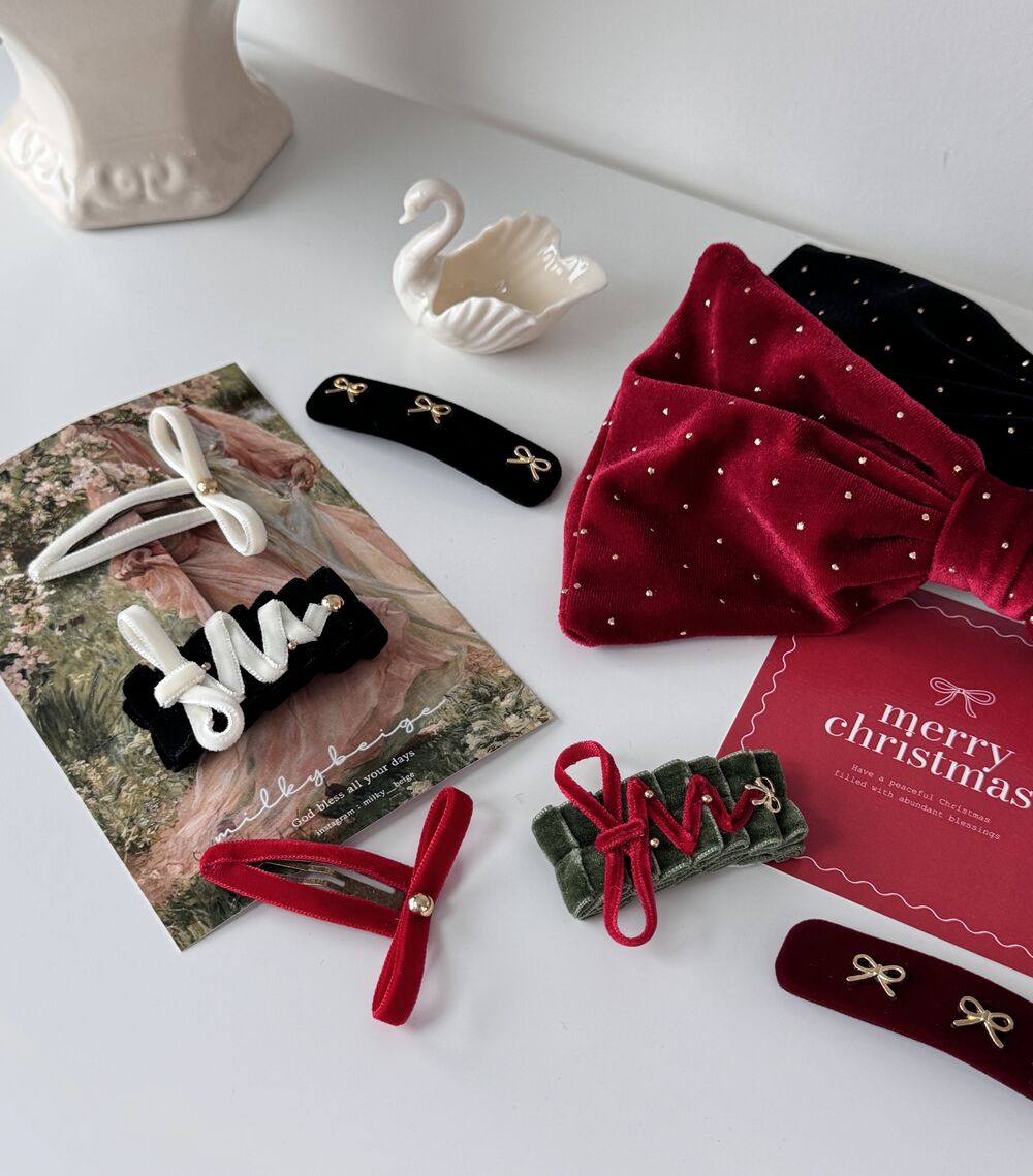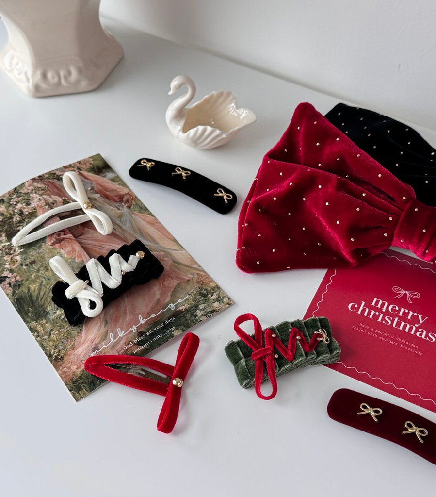 這是款精選天鵝絨布料製成的緞帶夾,觸感柔軟細膩。細長的天鵝絨絲帶以獨特的設計呈現,蝴蝶結點綴一顆小巧的金色圓珠,簡約俐落又不失甜美。黑色方形髮夾堆疊出聖誕樹的層次感,細節豐富。這組髮夾充滿了聖誕節日氣息和復古文藝感!