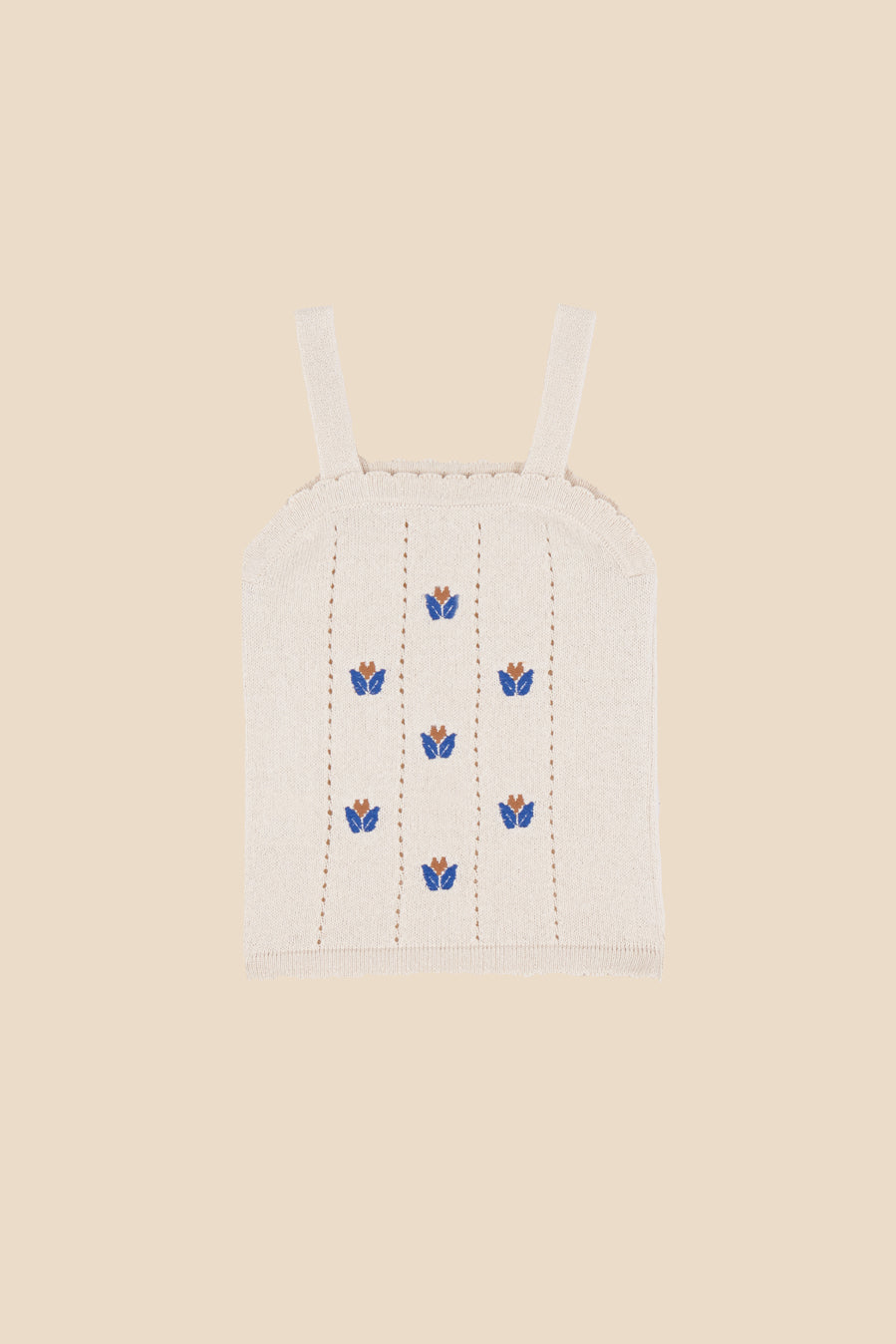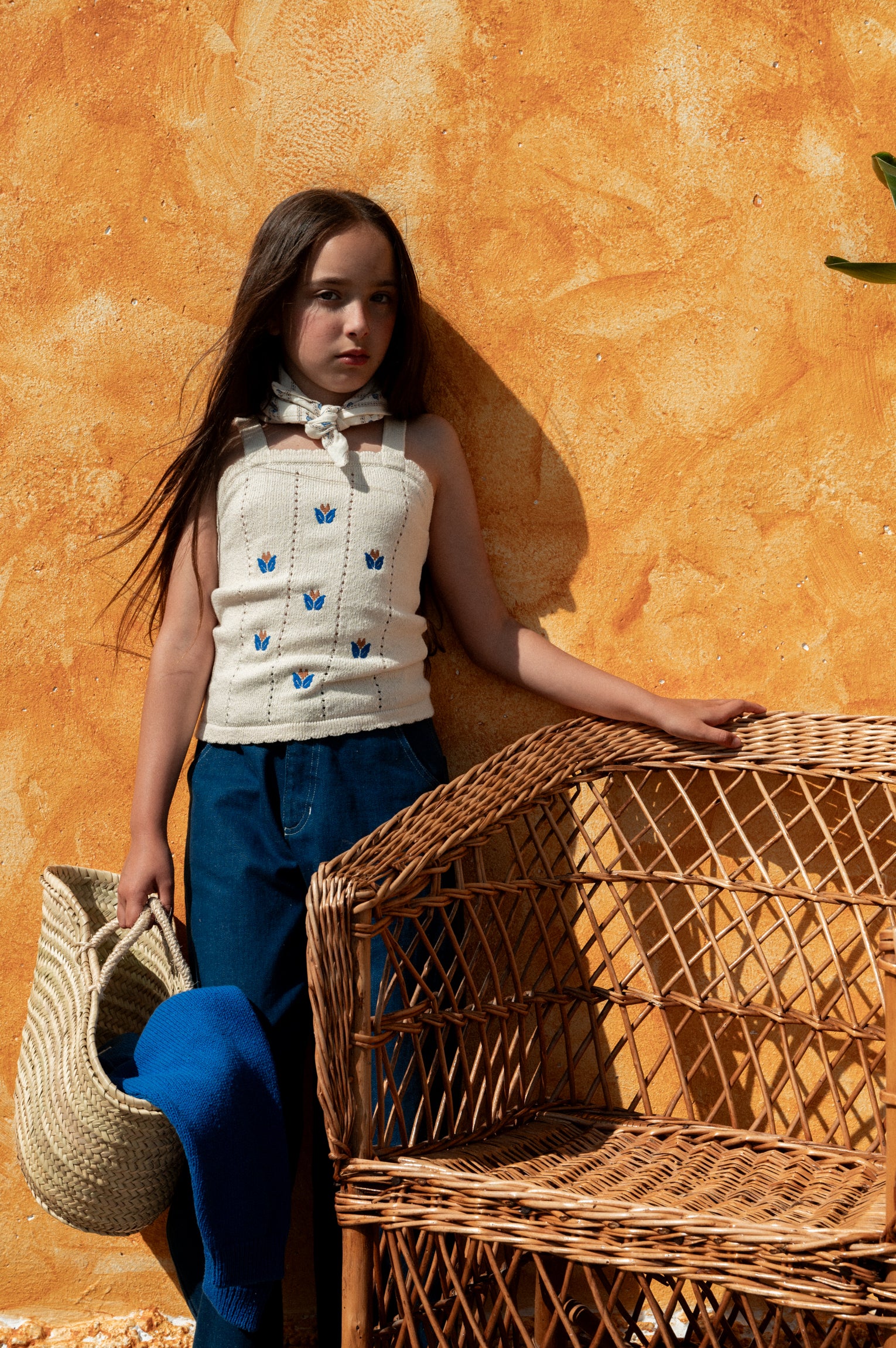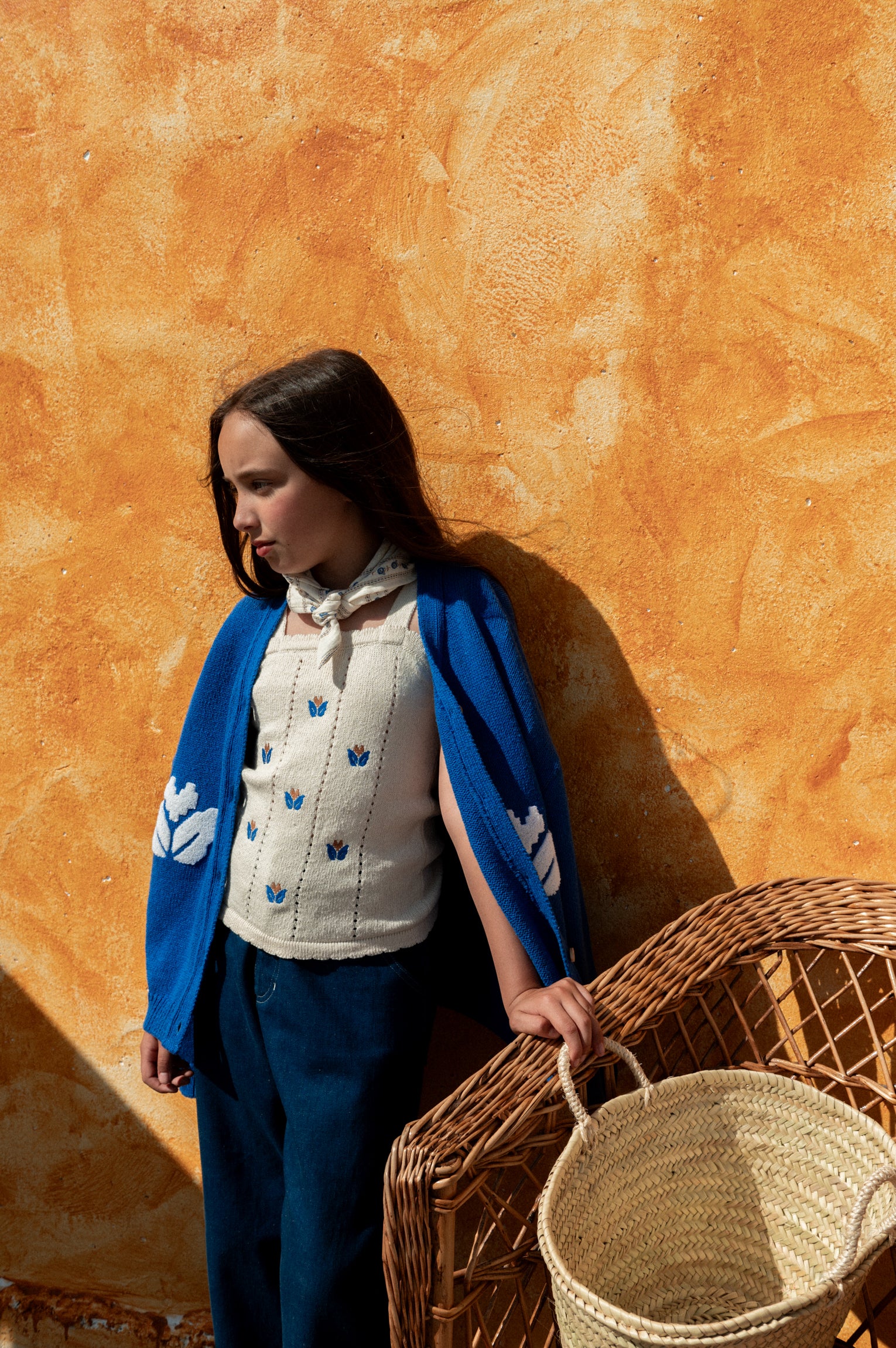 親膚柔軟的鏤空條紋薄針織,飾有手繪稚拙與藝術復古感的花卉刺繡,色彩鮮明且帶一份西班牙的懷舊色彩與溫度,非常優雅。暖橙愛心, 點綴在花中,為沉穩的藍色增添了溫馨的復古感。布料耐穿,可陪伴寶貝很久!