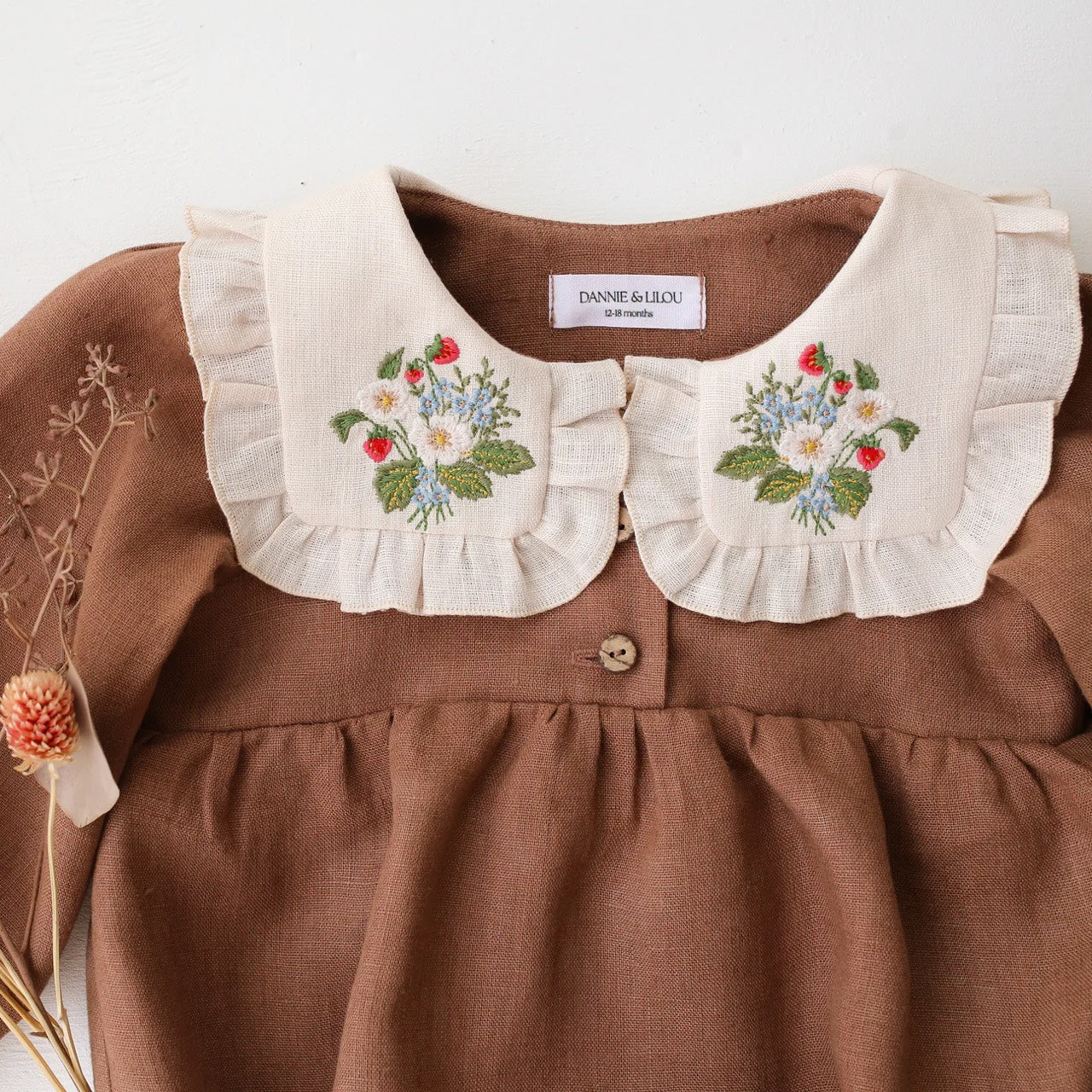 預購, 刺繡系列 Long Sleeve Bubble Playsuit with Square Collar 方領荷葉邊泡泡長袖連身包屁衣 3m-4y 多色可選 (領片可另選顏色,刺繡請選小圖)(主圖色:Mulberry Fern Check 桑莓蕨葉格紋 與 Latte 拿鐵, 刺繡:Tiny Mushrooms 小蘑菇)