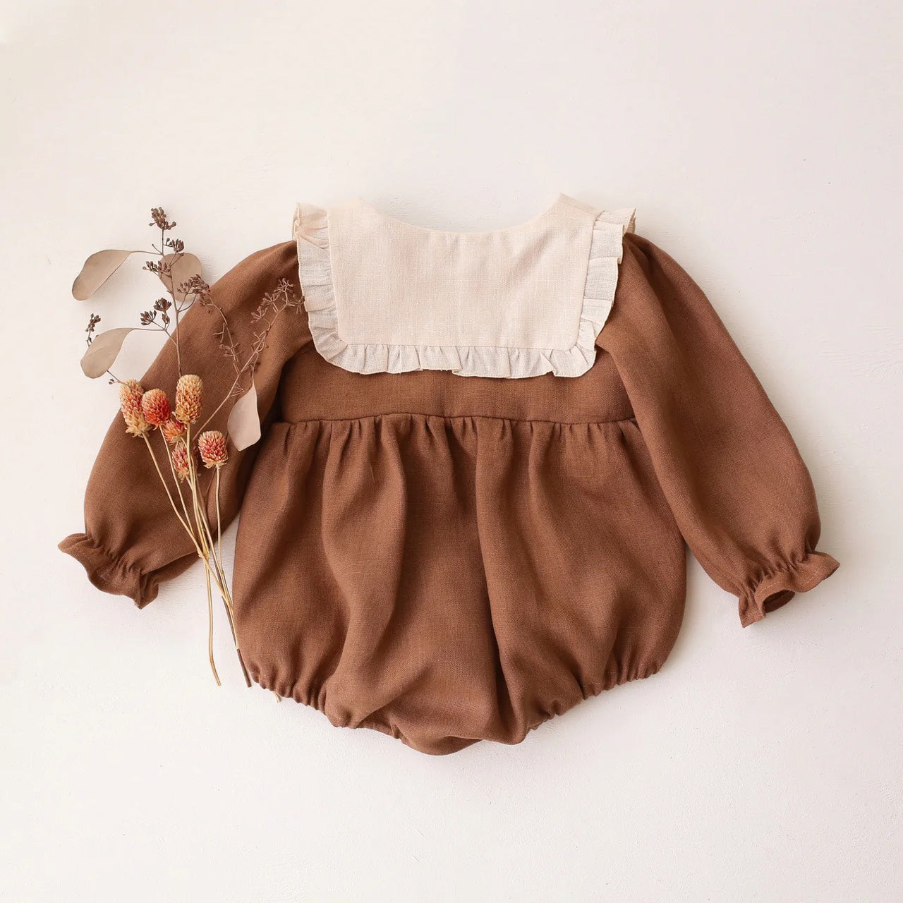 Sweet bubble playsuit with frilled collar, full length gathered sleeves, elastic at legs, coconut buttons at the front and snaps at the crotch for easy changing.